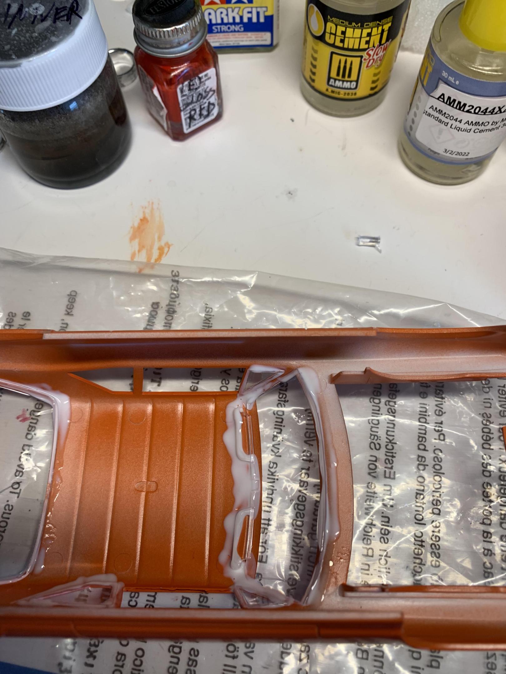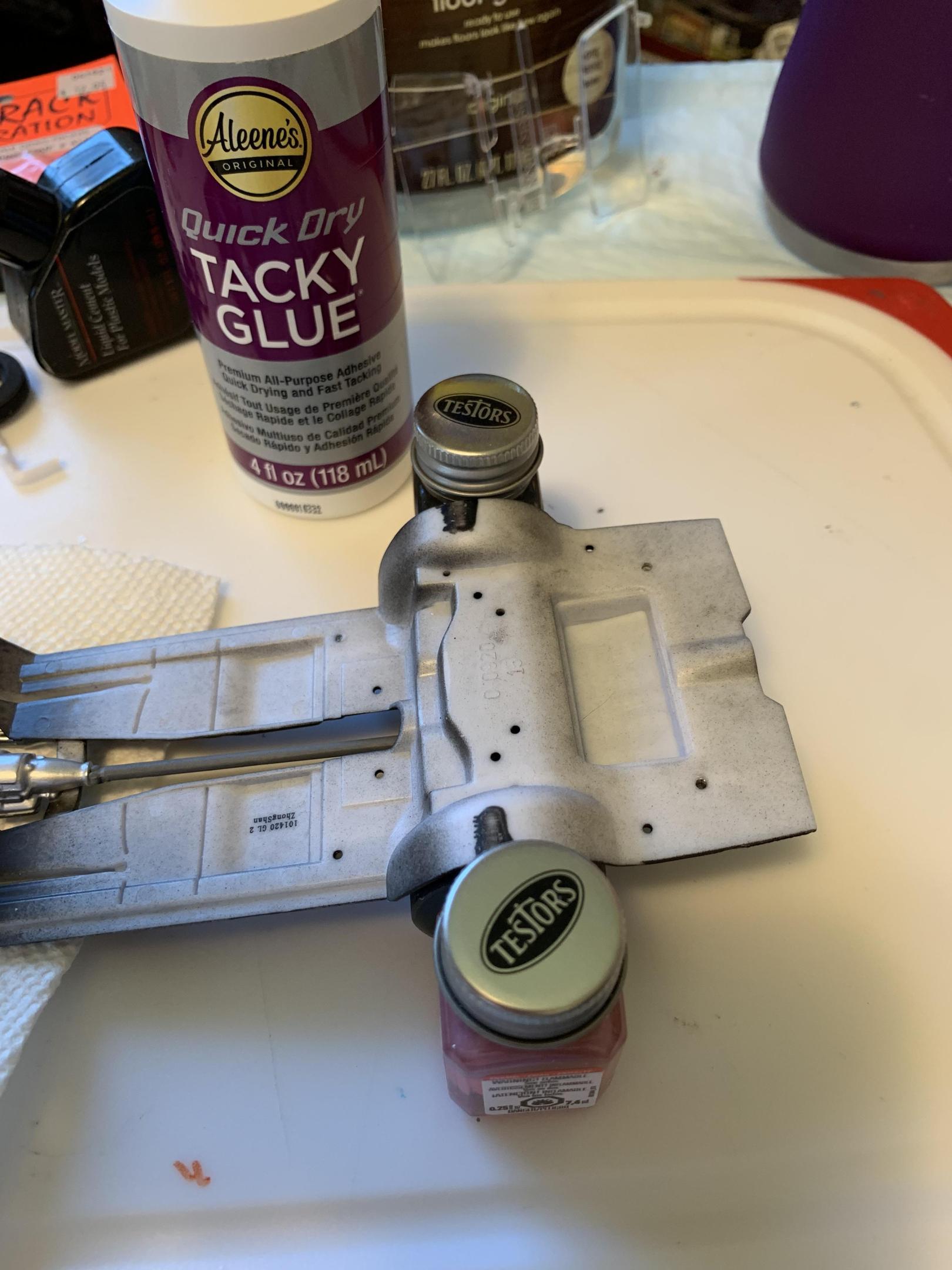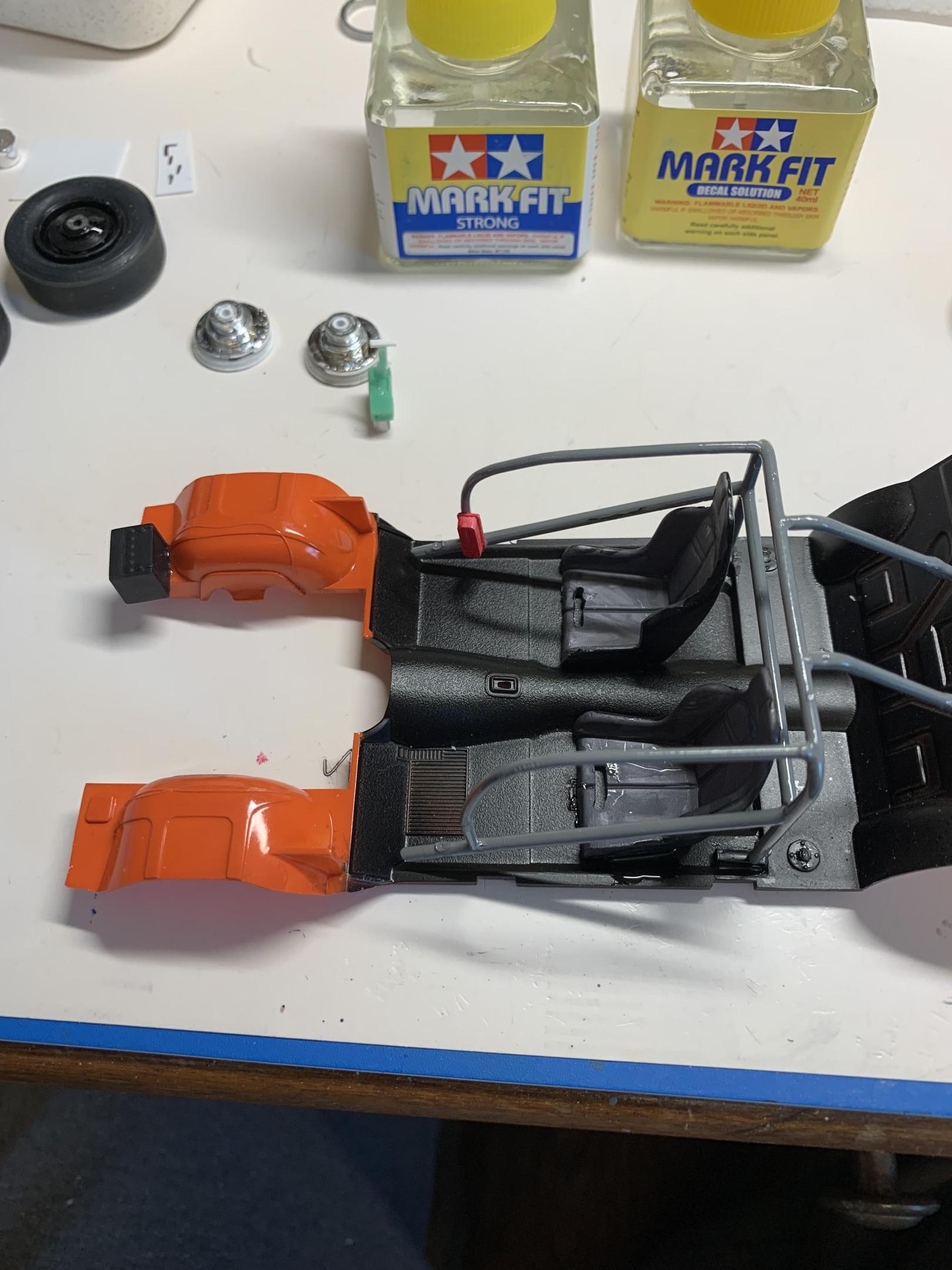 Got the driver and passengers side windows in with Mod Podge, ca glue on the front rims to chassis with testors bottles for alignment. Painted a helmet and glued it on. Gonna let stuff sit over nite , then trial fit chassis and more detail work tomorrow. -