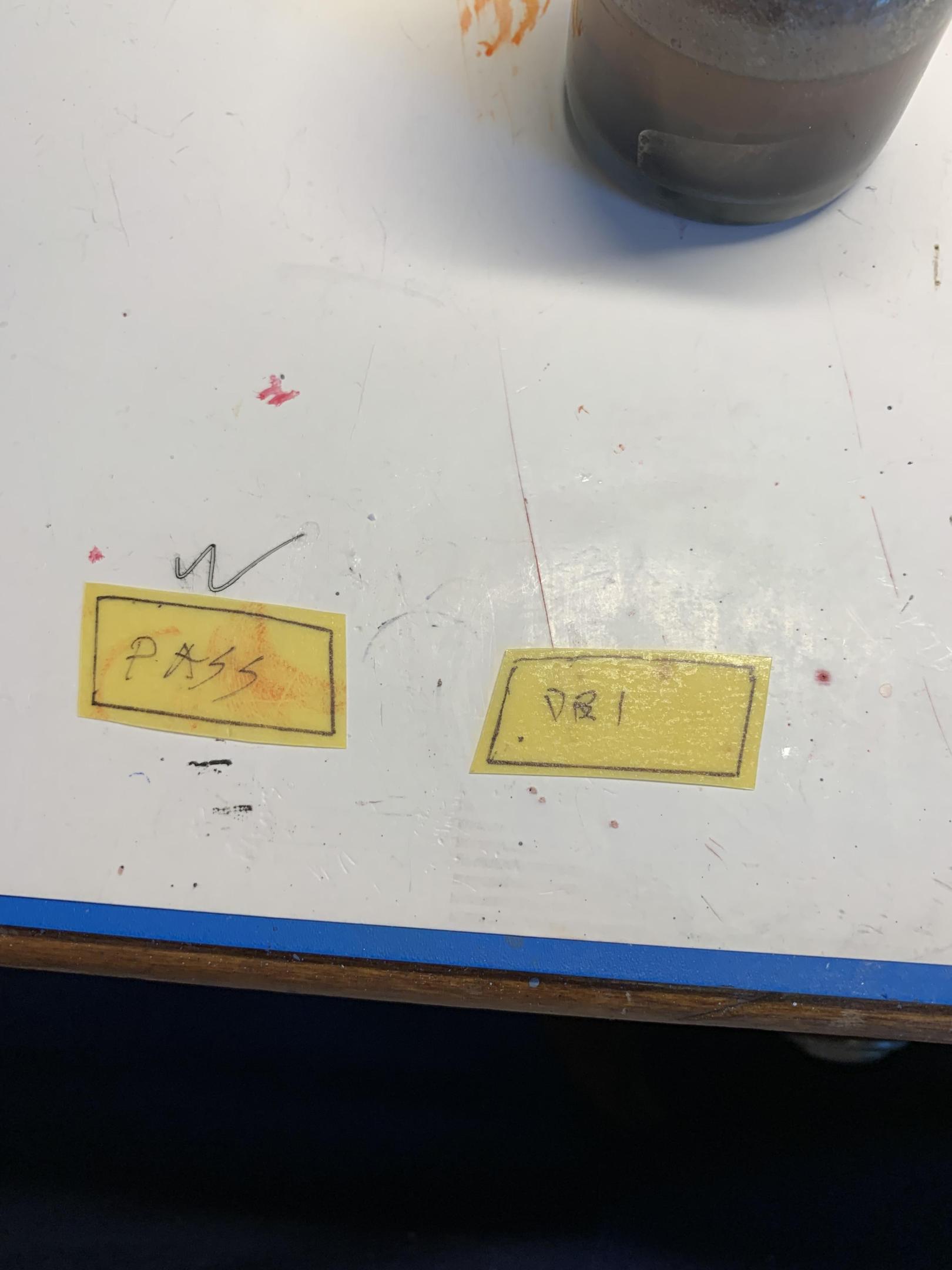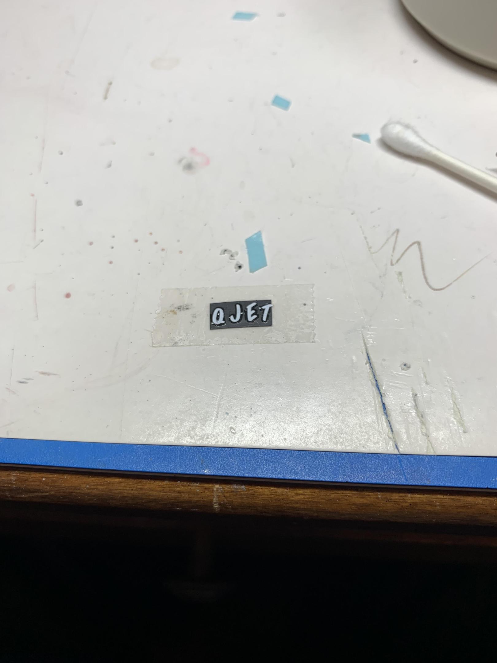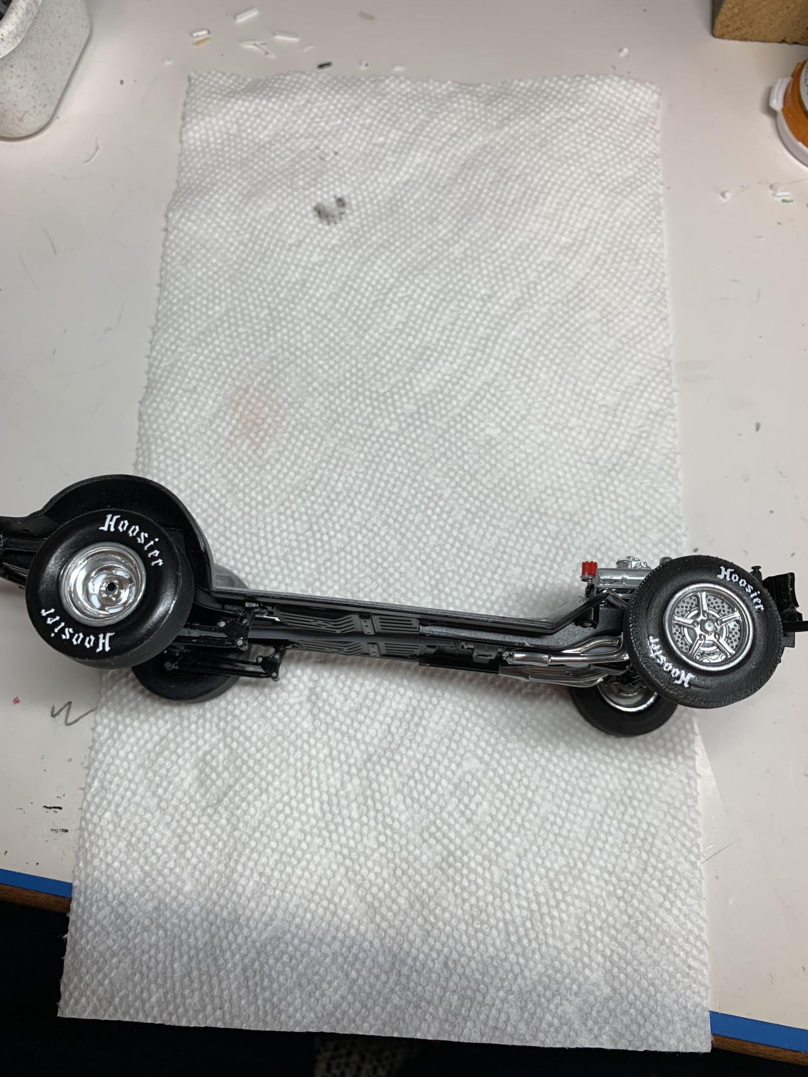 Couple of chassis shots with wheels glued on. Also, the making of a rear license plate. Some scrap thin styrene sheet, some double back tape to hold it for individual decal application (thanks to Slixx for 1/8” letter sheet), and some semi steady hands and water. Oh, and a blue jel type pen I am going to experiment with to make blue class numbers tomorrow. -