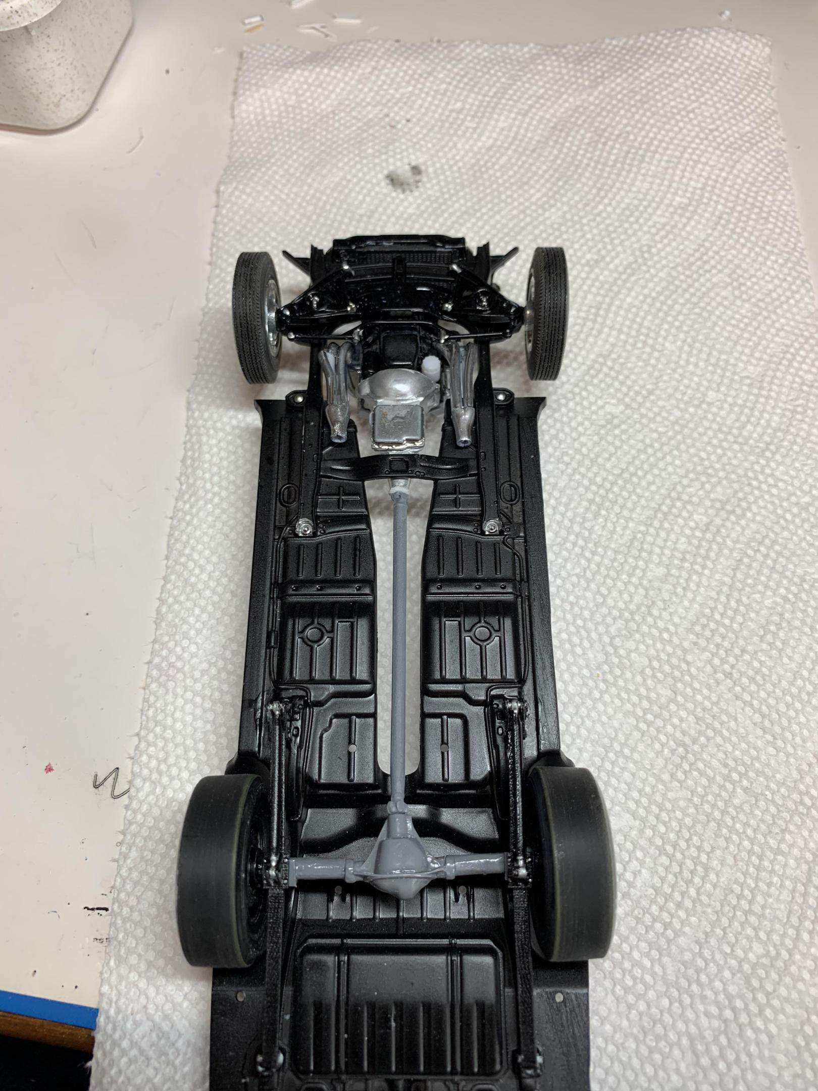 Decided not to wire this engine for a number of reasons. Instead, painted the cap and coil with some testors enamel after loosening the lid with a few taps from my screwdriver handle (I posted this in the tips column). Driveshaft was too short (because I swapped to an automatic trans). Found one from a 1966 Chevelle wagon partial kit that I had ordered for other parts. -