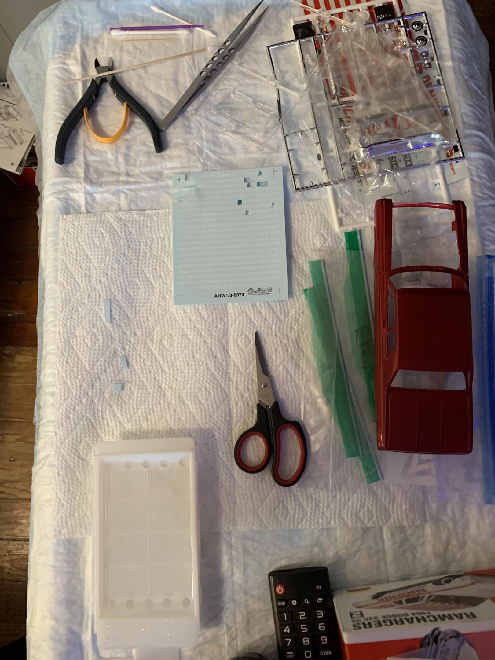 16. Had to cut the holes in the hood. Some engine work and decided on white for the interior. Like that Tamiya rubber black. Similarly classed car to Travis Hess’s, but no way in Hades would I tackle that paint job. Cut out fuel tank, as most modern stockers use fuel cells.