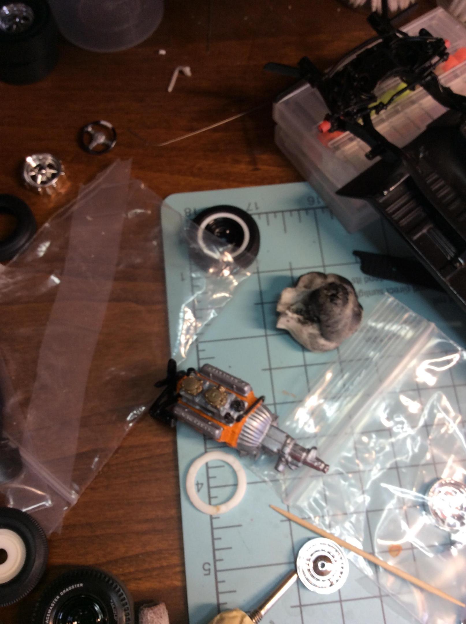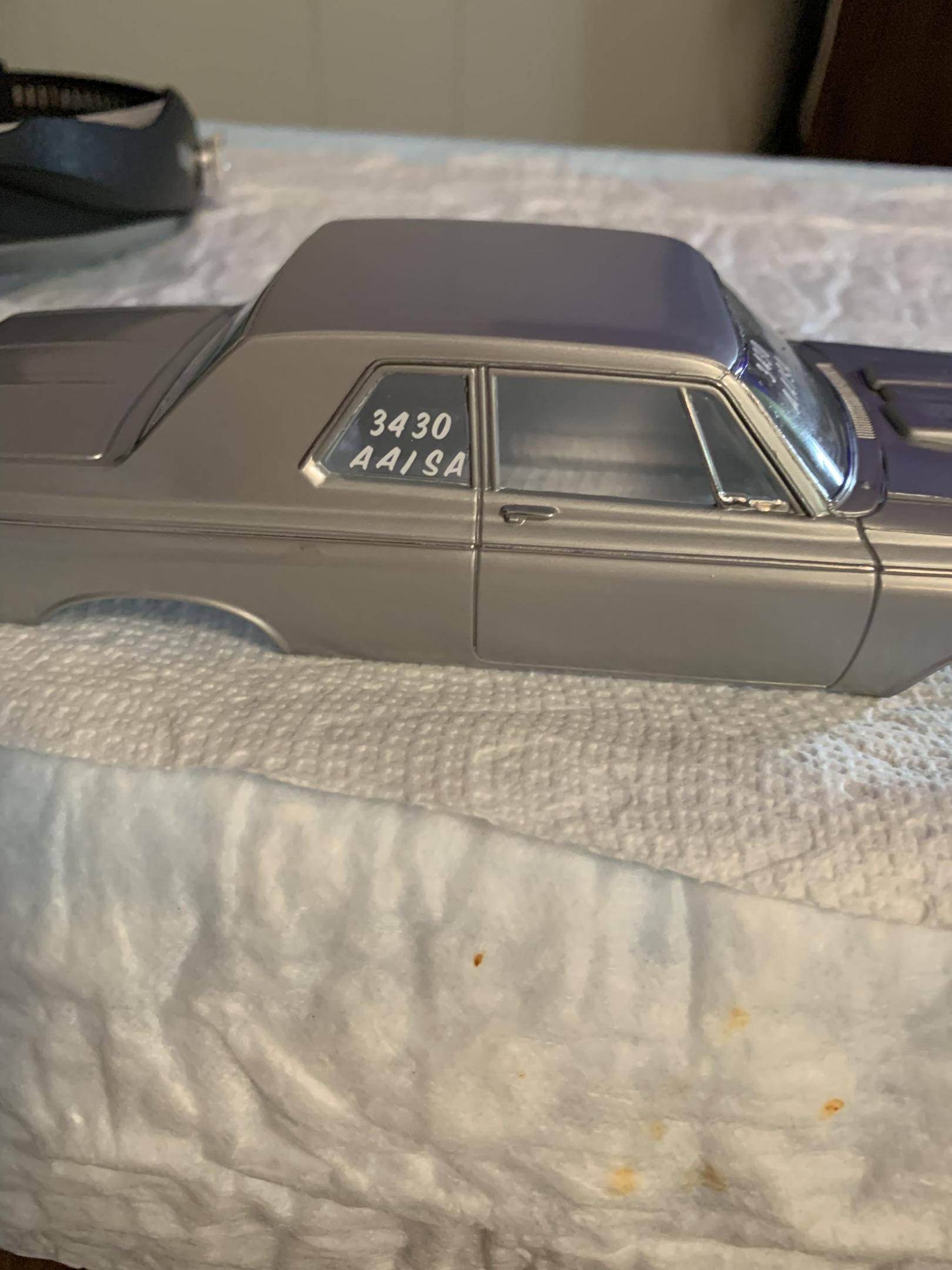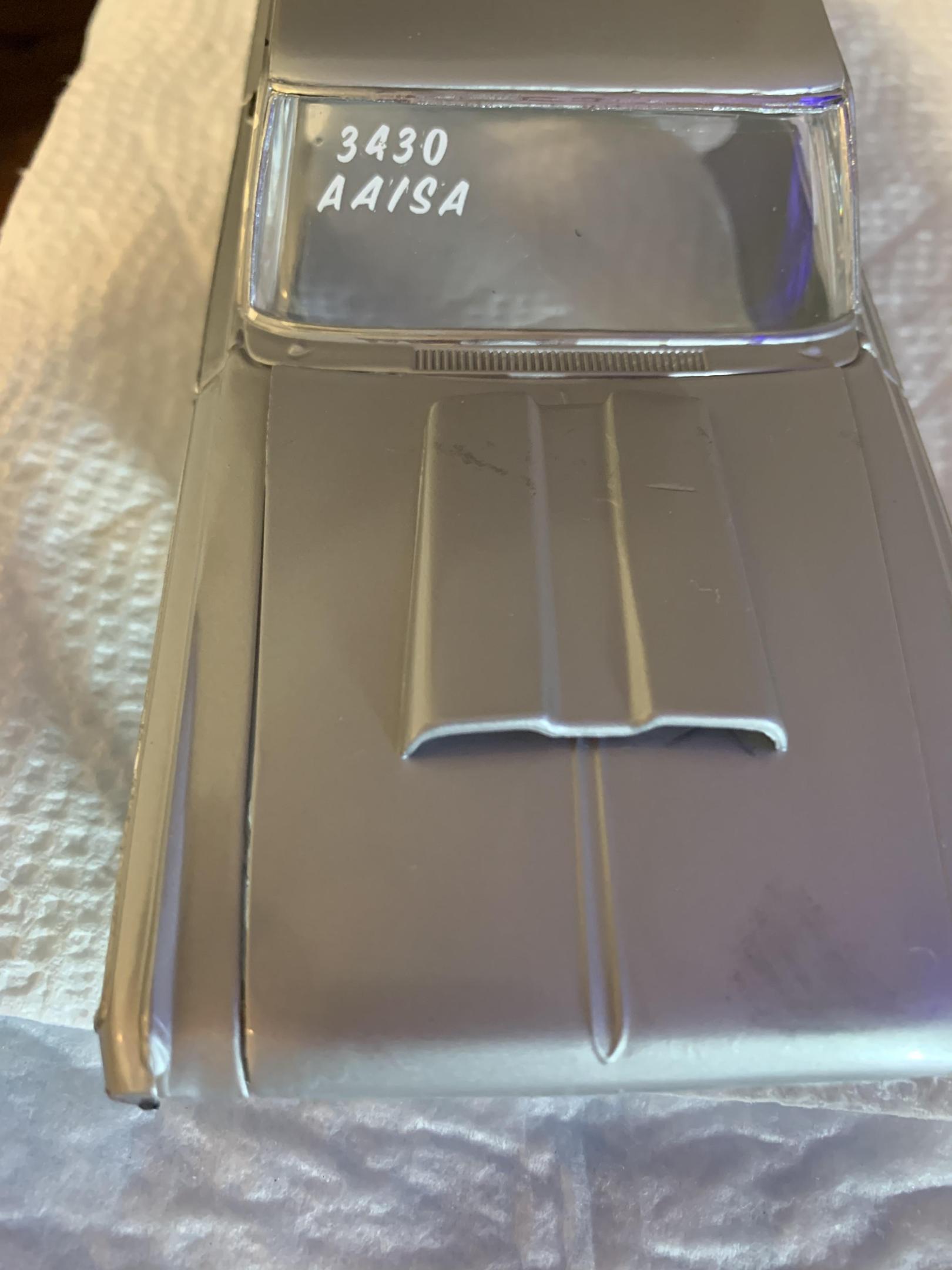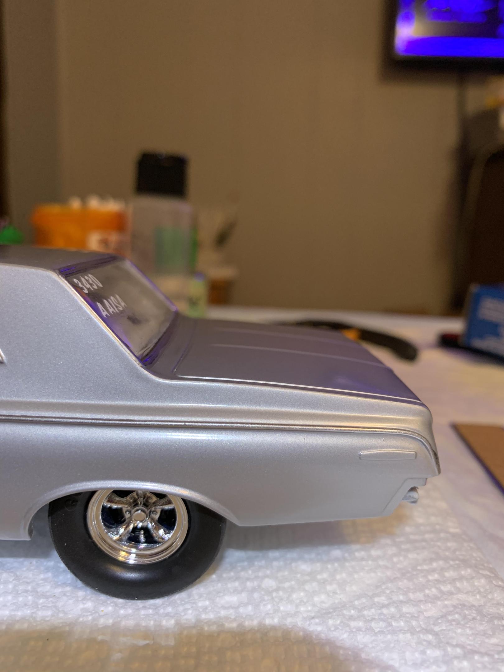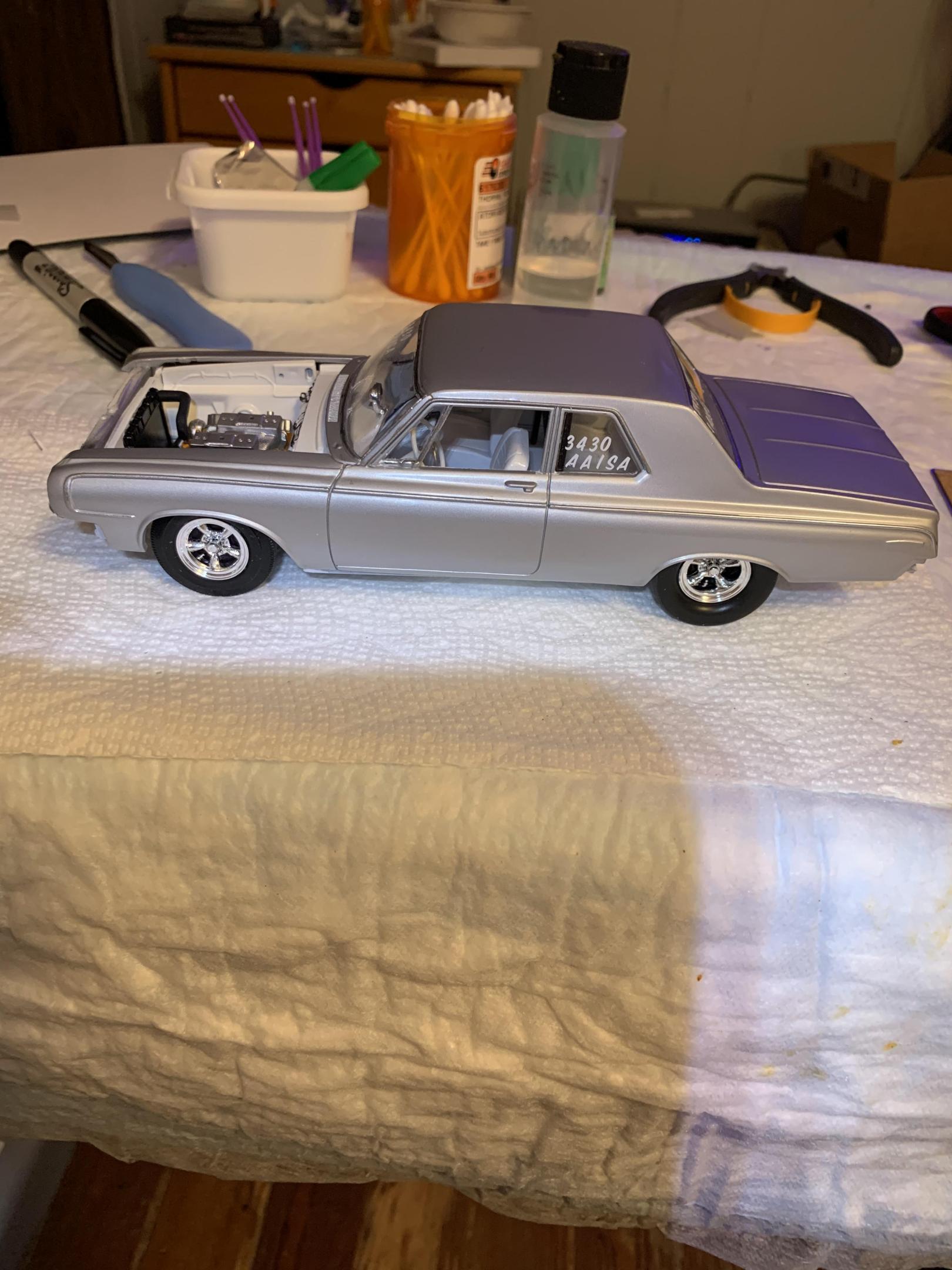 17. Used the Lindberg Ramchargers hemi and Color Me Gone kit. Painted with Tamiya silver leaf which I really like, but had some issues due to operator error. Painted 2 cars at the same time as another 1964 is being built. That one will have the hemi hood scoop.