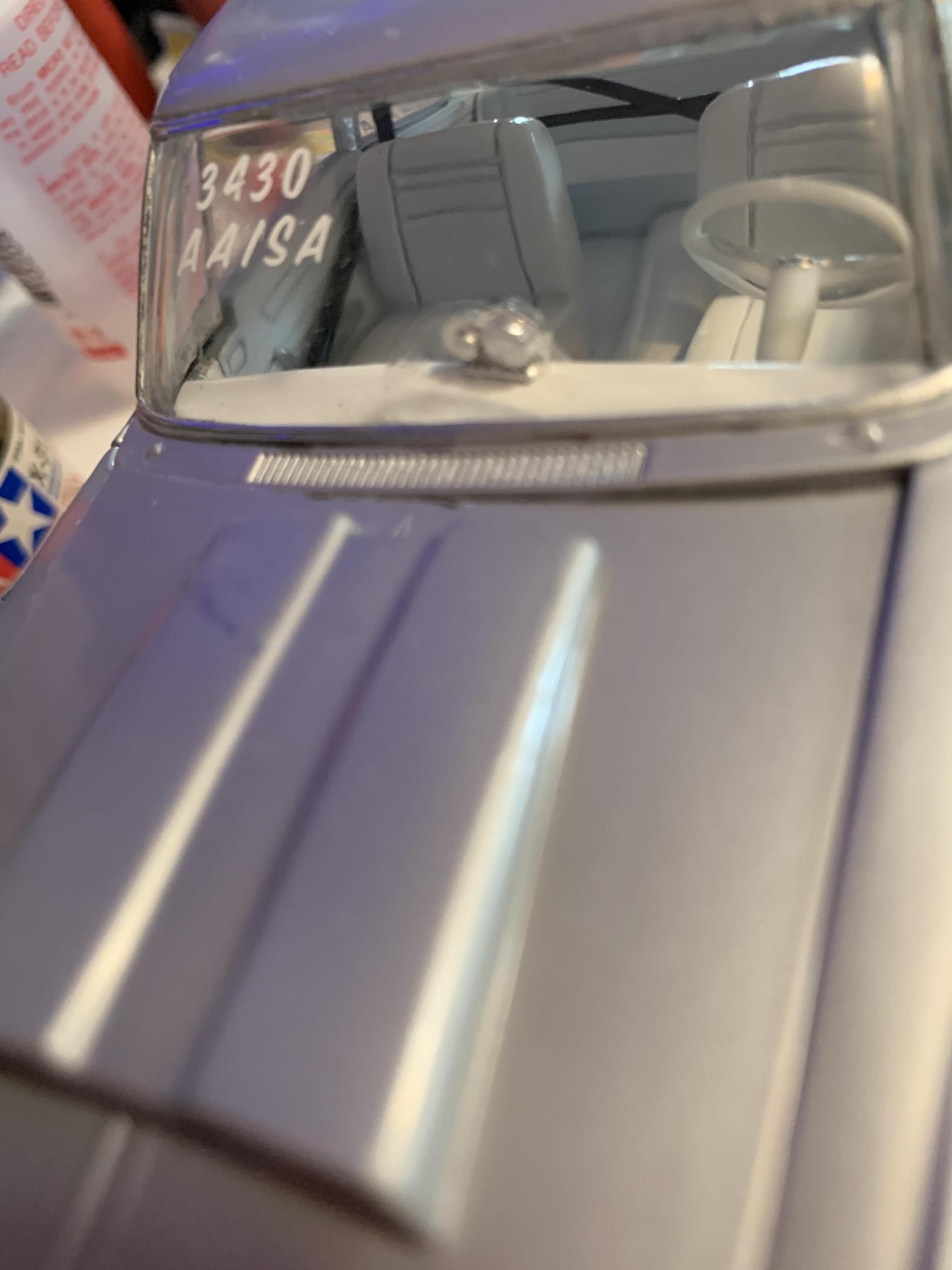 6. Messed up the windshield with my thumb print in cement at the base. Tried to sand it out but my patience wore thin. Couldn’t live with it, so out came another spare windshield and more tedious class decals. Wheelie bars are from amt 66 nova pro street.