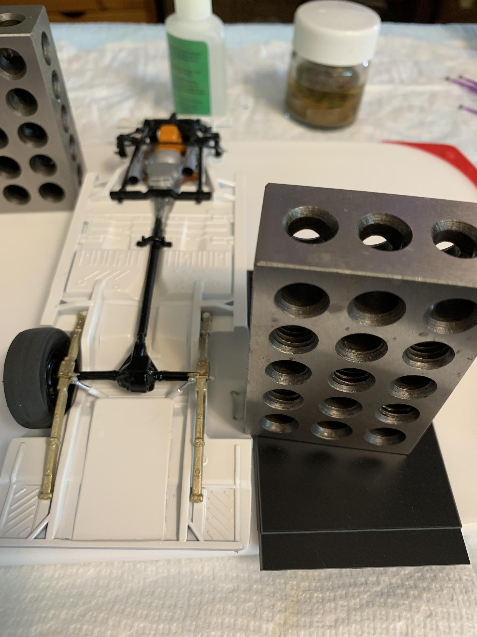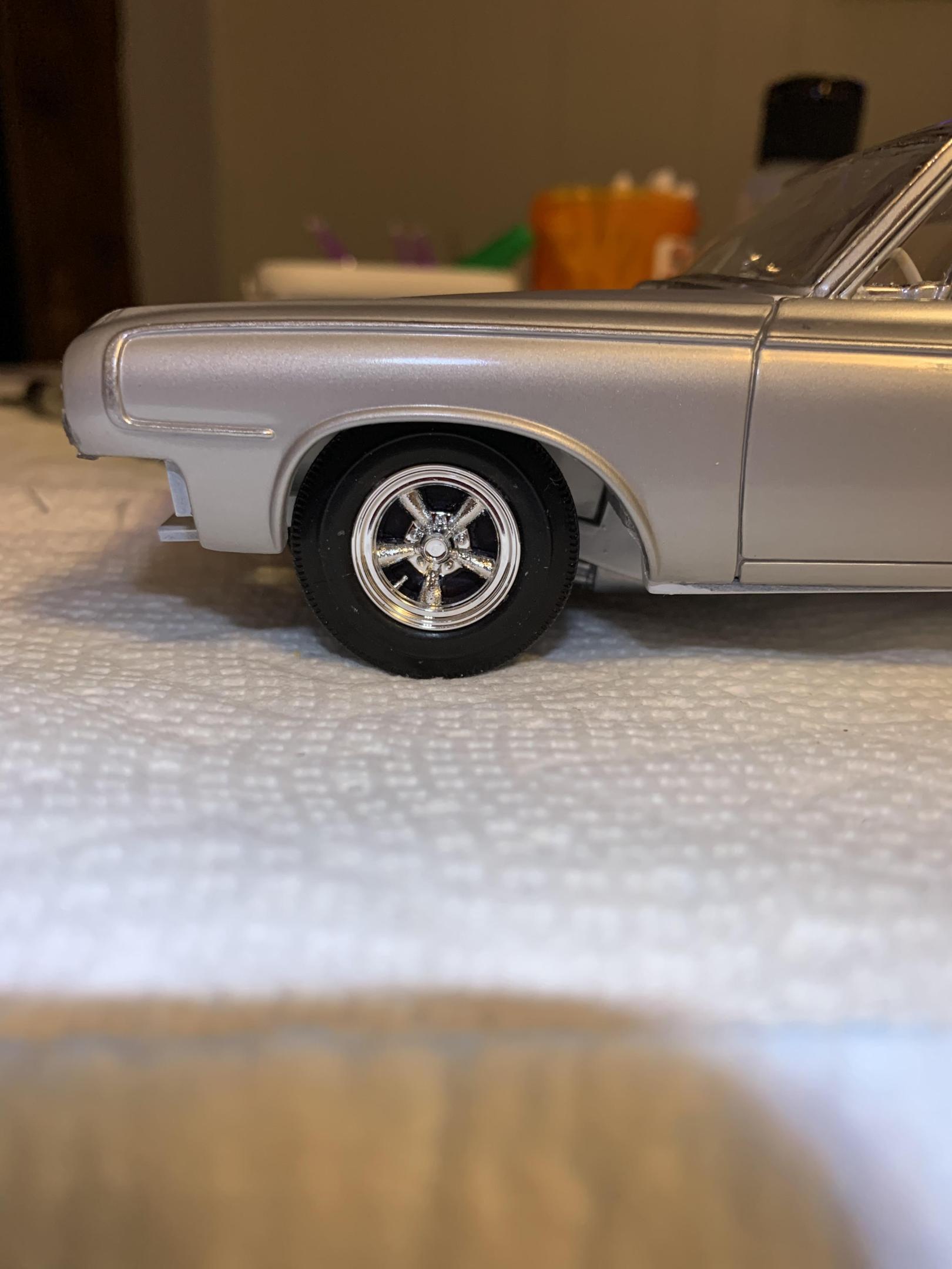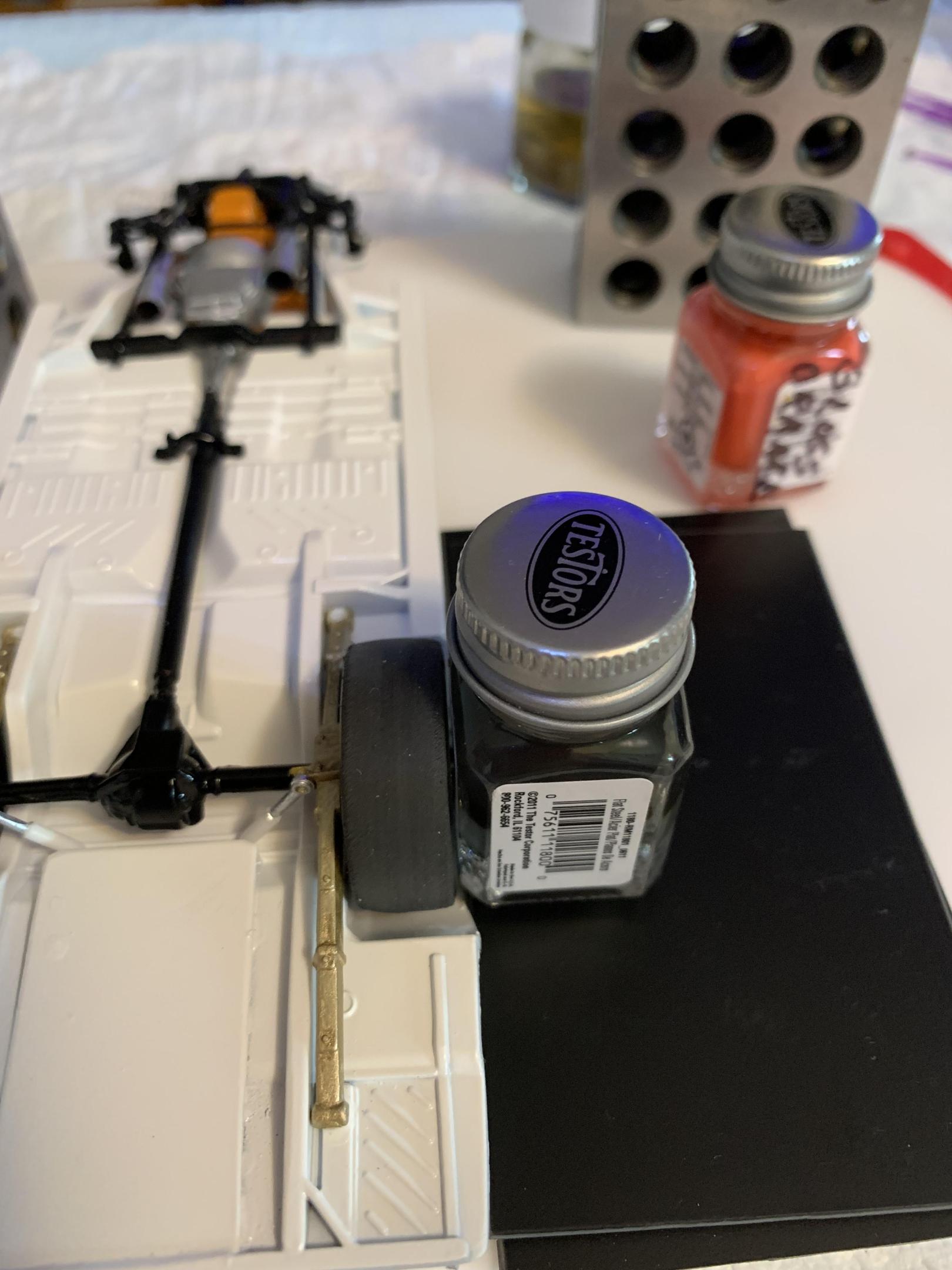 11. Tried a couple different alignment jigs as the wheel fit was so sloppy. Hard to beat testors paint bottles and plastic shim stock. Some pics of the wheels and 9” Goodyear slicks with Tamiya rubber paint on the inside covering up the “Blue Streak”.