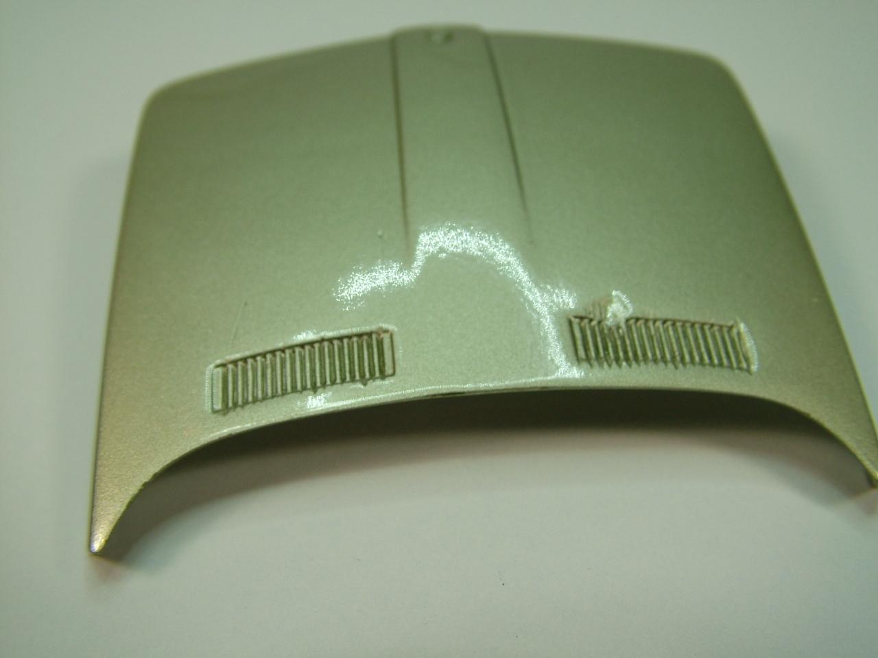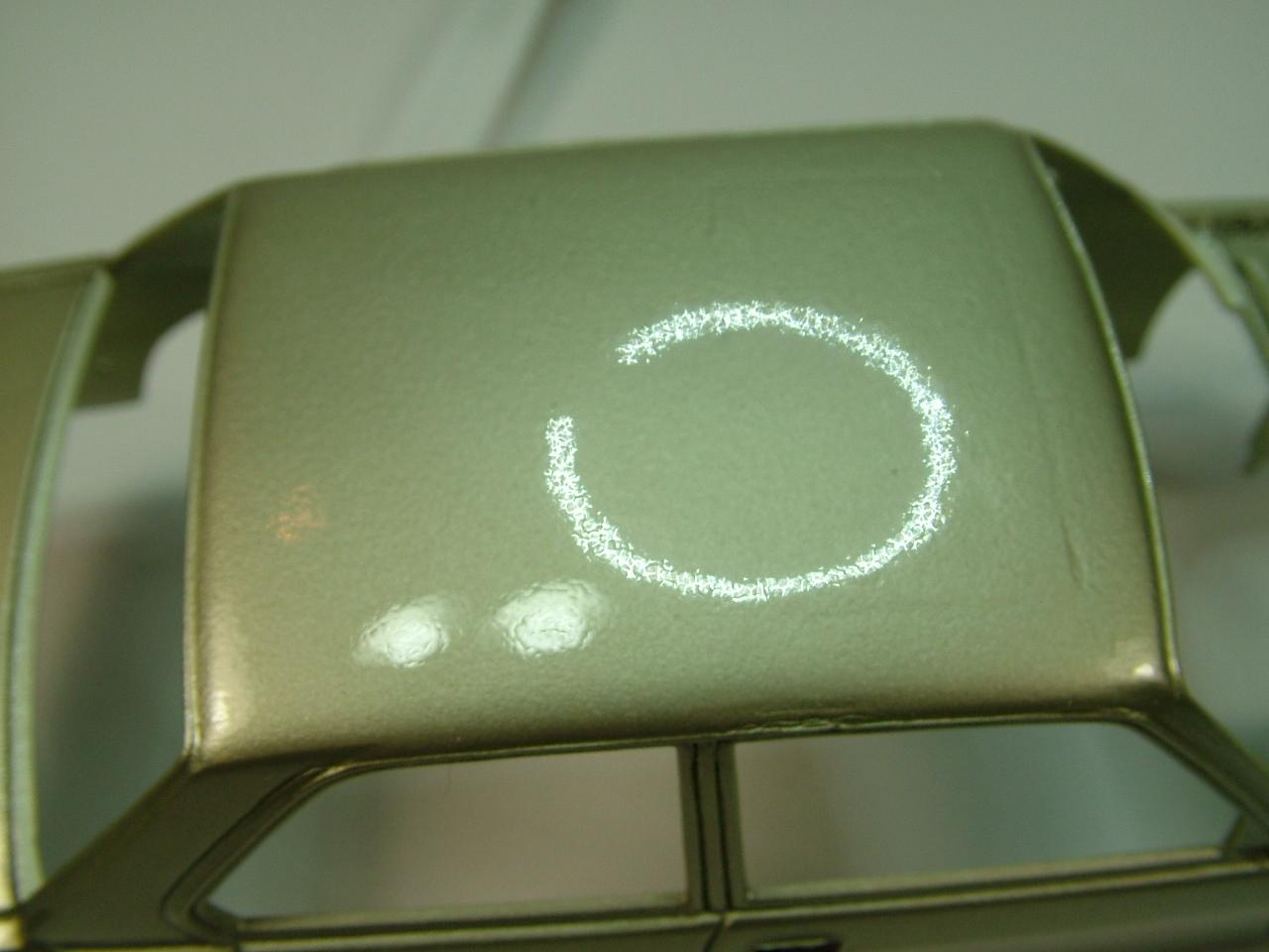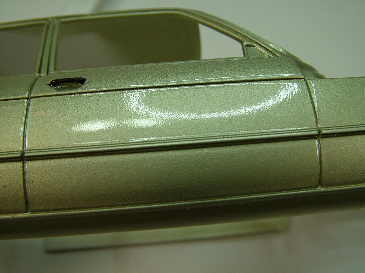 This is my first model, trying to replicate a 320i I owned. I primed with Testors white primer and sanded. The paint is from Express Paints and is an automotive urethane with a clear coat from the same company. I saw the orange peel after the second color coat, but the directions said not to sand before clear coat. The roof has more primer after I tried (and failed) to fill the sunroof. The orange peel seems to be all on the color coat and not in the clear coat. The side view has less primer and less orange peel. I didn't sand the engine compartment at all that that seems to have no orange peel. I shot it with a Paasche H @ 35 lb. The paint was decanted from a spray can and was not thinned. From what I've read, orange peel forms when the paint dries before it has had time to level out. The spoon wasn't primed at all, just lightly sanded before painting, and clear coating and has no orange peel. This body is a "throw away" after I screwed up the panel lines and the hood. I have three more. Is it possible that multiple coats of primer are drying the color coat too fast? I'm going to spray more spoons with different coats of primer and possibly lowering the pressure. Any thoughts? What would happen if I sprayed the body without primer? Thanks Dave