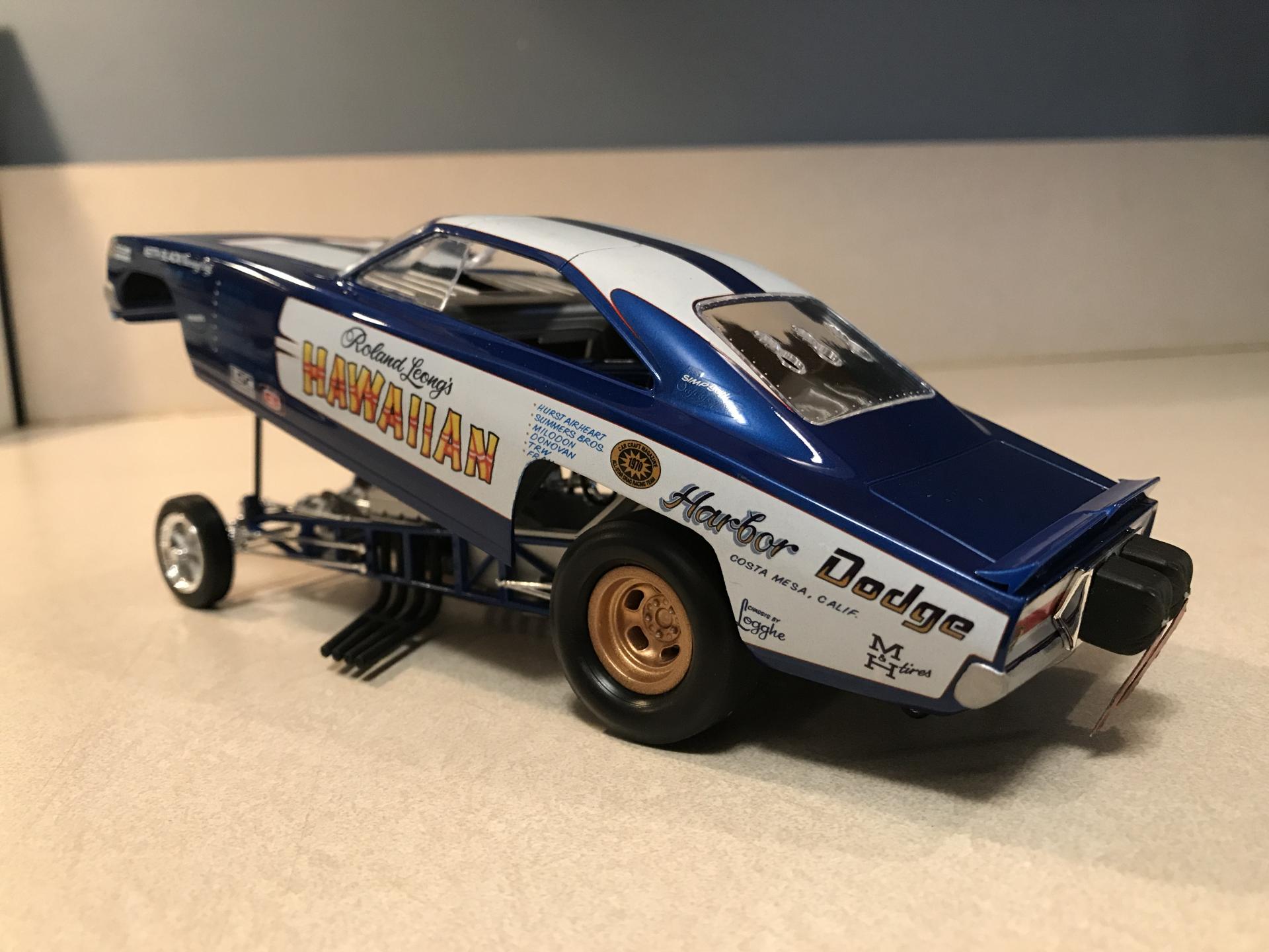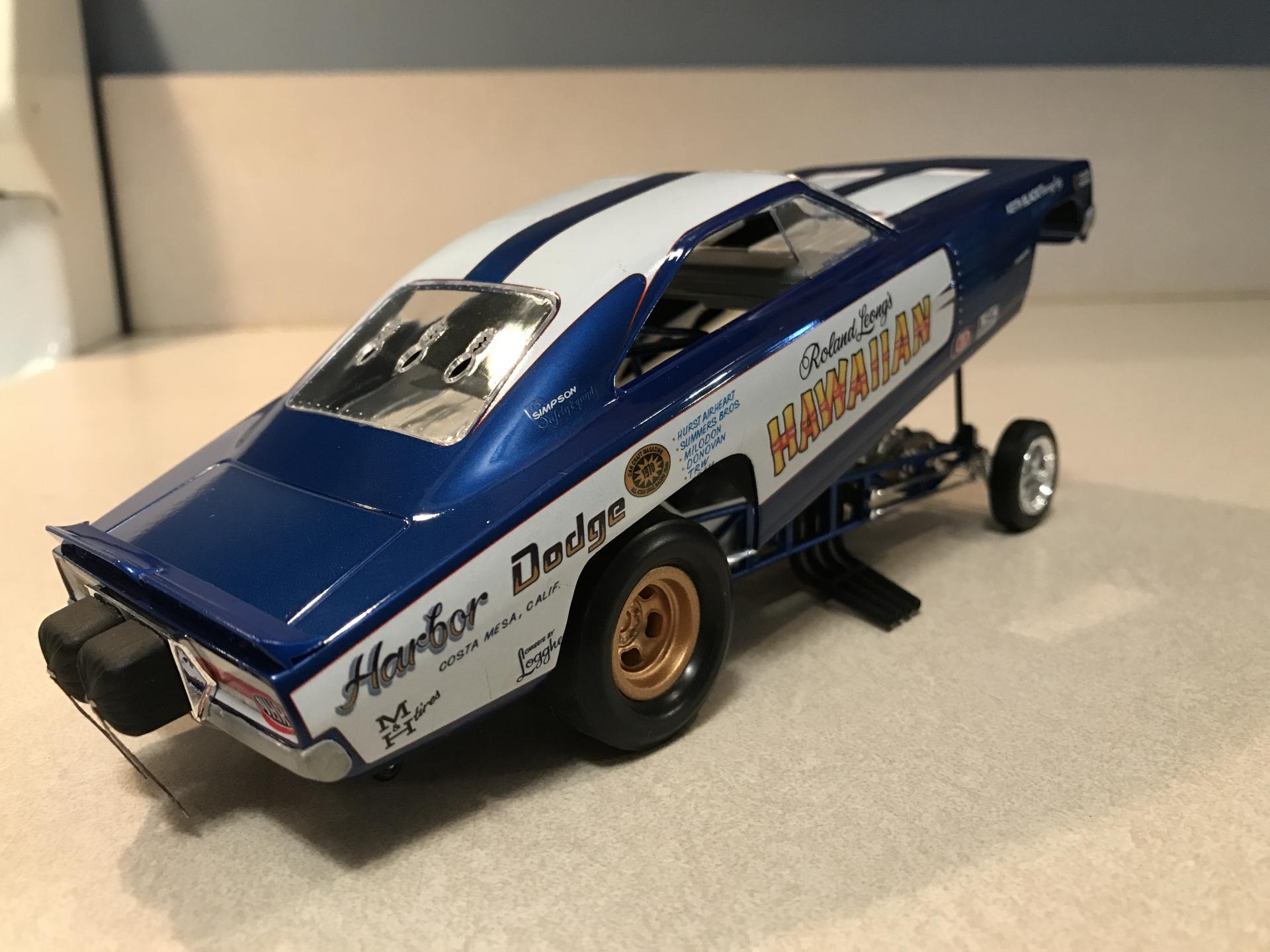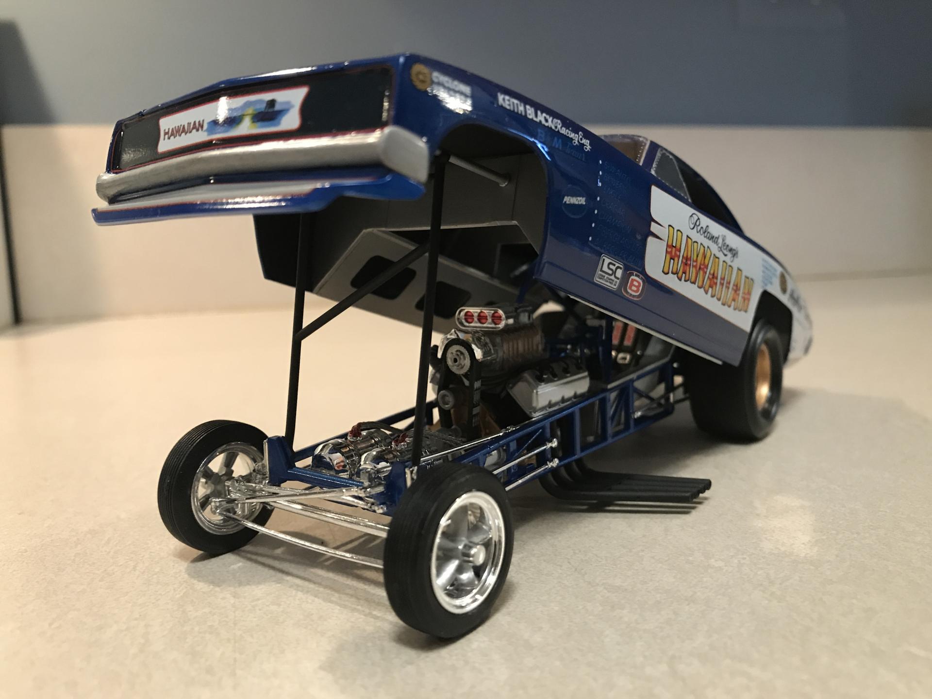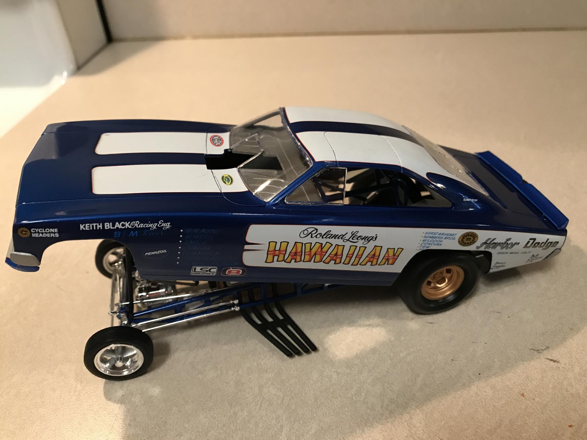 Hi, here's the Revell Hawaiian, pretty much box stock with some wiring etc added, but not a lot of xtra detail. Tamiya Mica blue and Tamiya clear. The kit went together great. It's been done a million times but here's mine anyway! I always loved the color combo of this car. Thanks for looking, Mopar to ya!