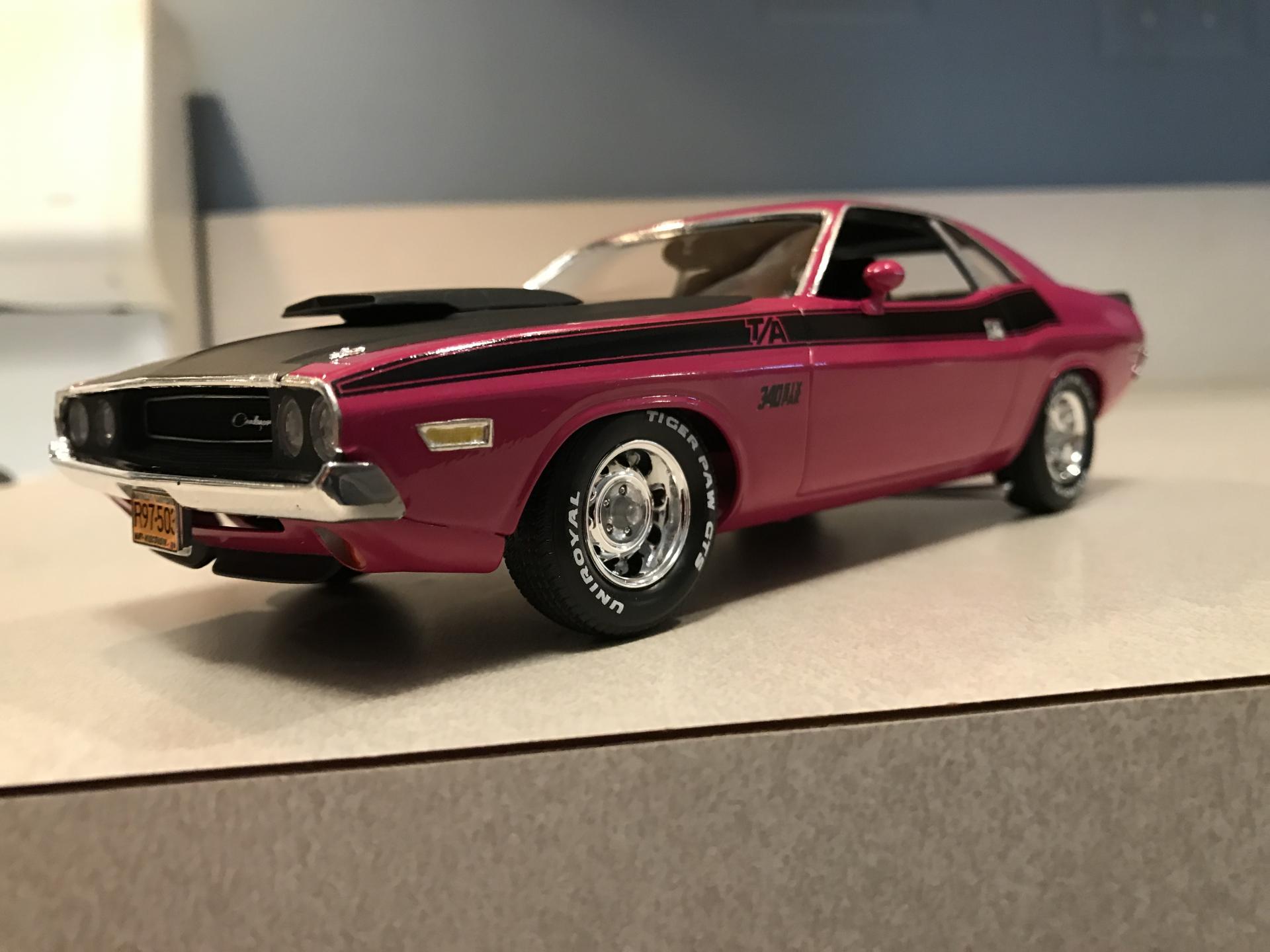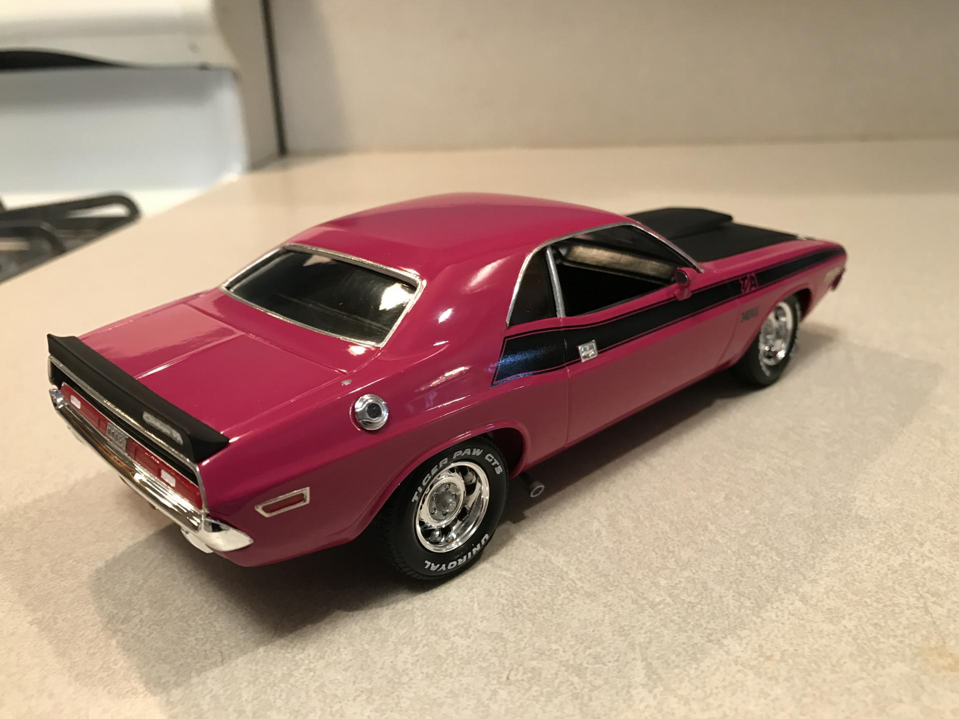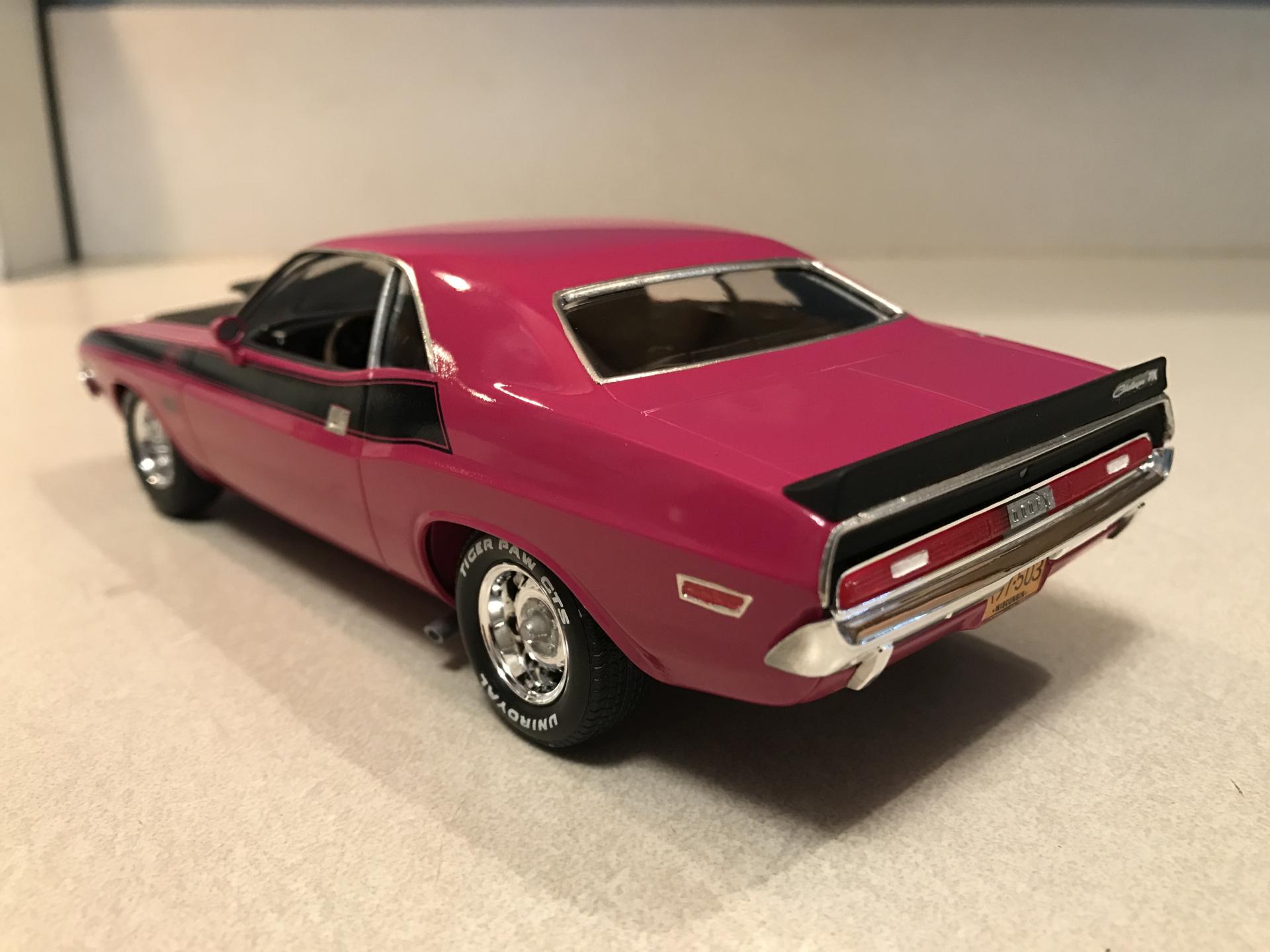 16. Panther Pink seems to be a popular color for this car! I've seen some nice ones here lately. Anyway here's mine. OOB except for BMF and Fireball Modelworks tire decals. Testors paint. Built a while back but it's held up nice. I remember the windows were missing in the box, but Revell sent me new ones fast. Going back in time I would've corrected the front valance among other things. Thanks for looking and Mopar to ya!!