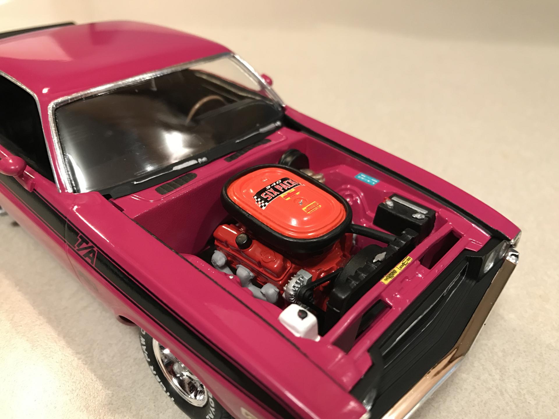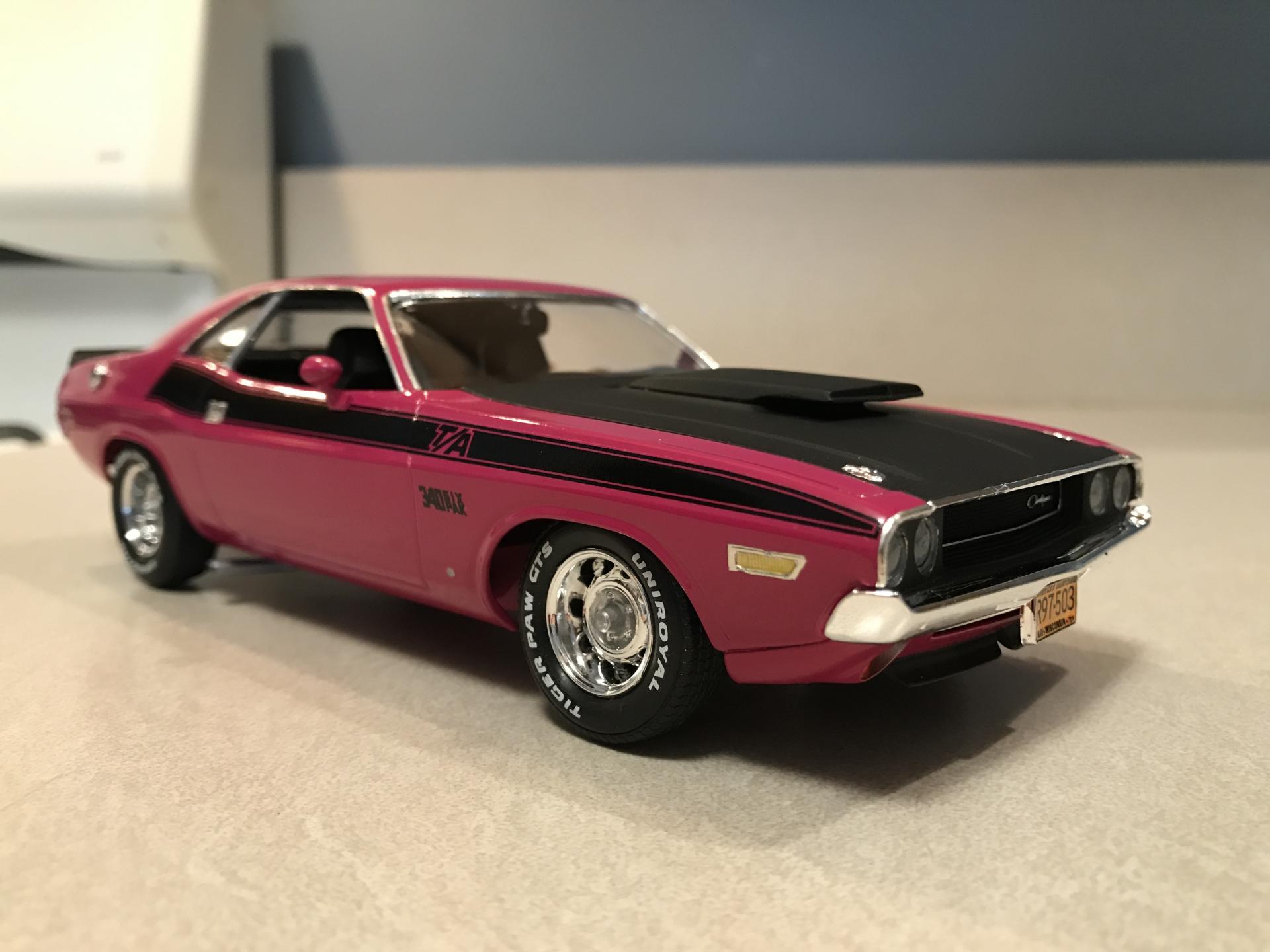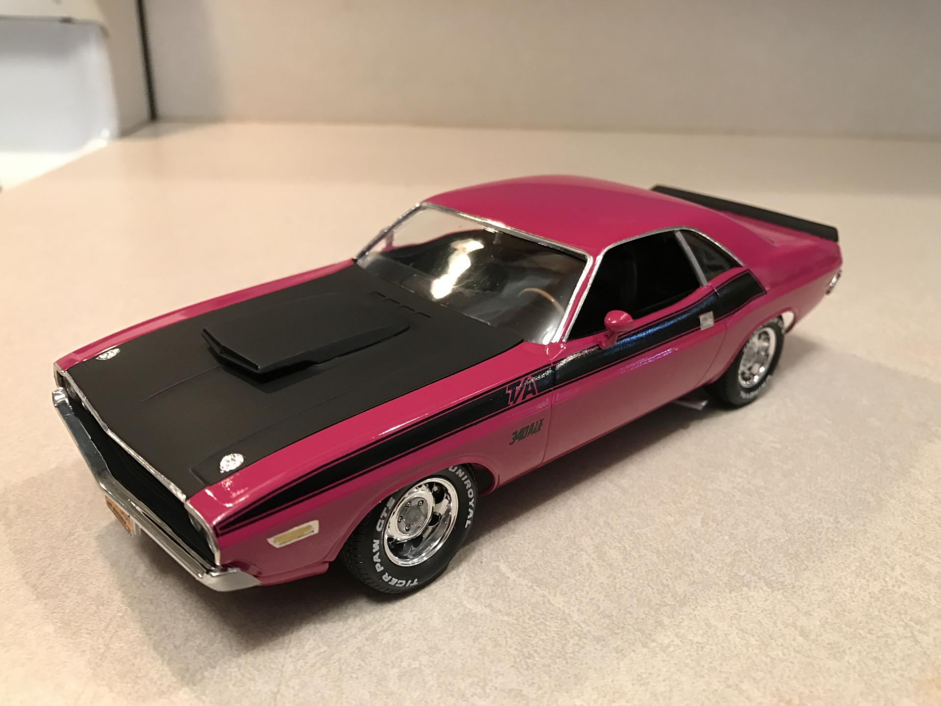 16. Panther Pink seems to be a popular color for this car! I've seen some nice ones here lately. Anyway here's mine. OOB except for BMF and Fireball Modelworks tire decals. Testors paint. Built a while back but it's held up nice. I remember the windows were missing in the box, but Revell sent me new ones fast. Going back in time I would've corrected the front valance among other things. Thanks for looking and Mopar to ya!!