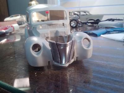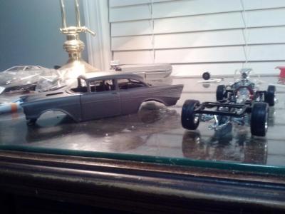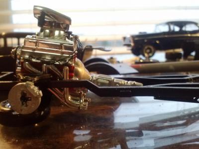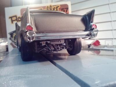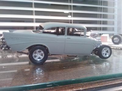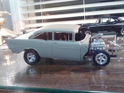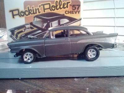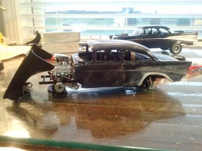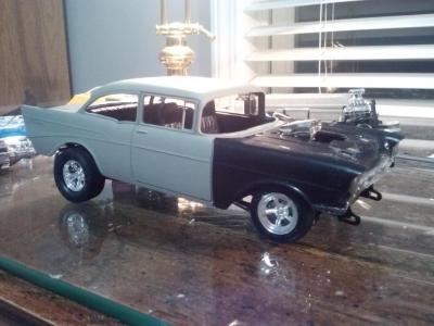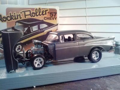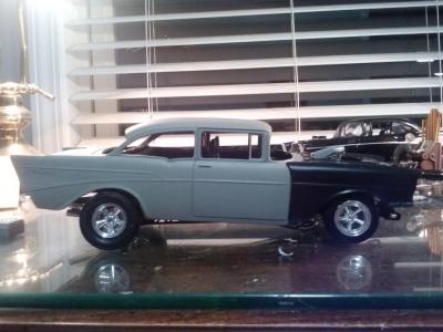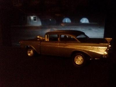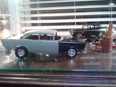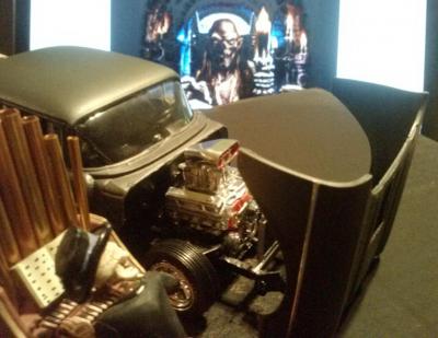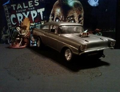 21. Thanks for the compliments. That 57 in the window is actually a survivor. It's a Monogram hard top kit. It was built in 1992 and is supposed to be the Tales from the Crypt car. That car was built from memory after I watched the show. Back then I thought the car was black, not gunmetal grey, and it has dual air cleaners because I didn't have the correct scoop. This was also one of my first attempts at bare metal foil. After 22years the only thing missing is the radiator.
