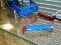 The thrusters hung too low so I cut the rear of the frame to make room. The Corvette nose will make the housings for the thrusters and make a roll pan.