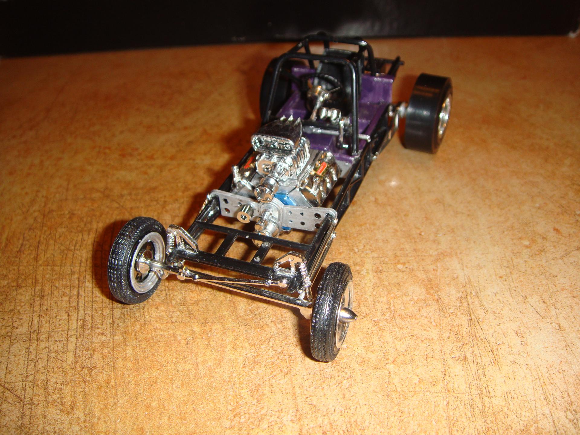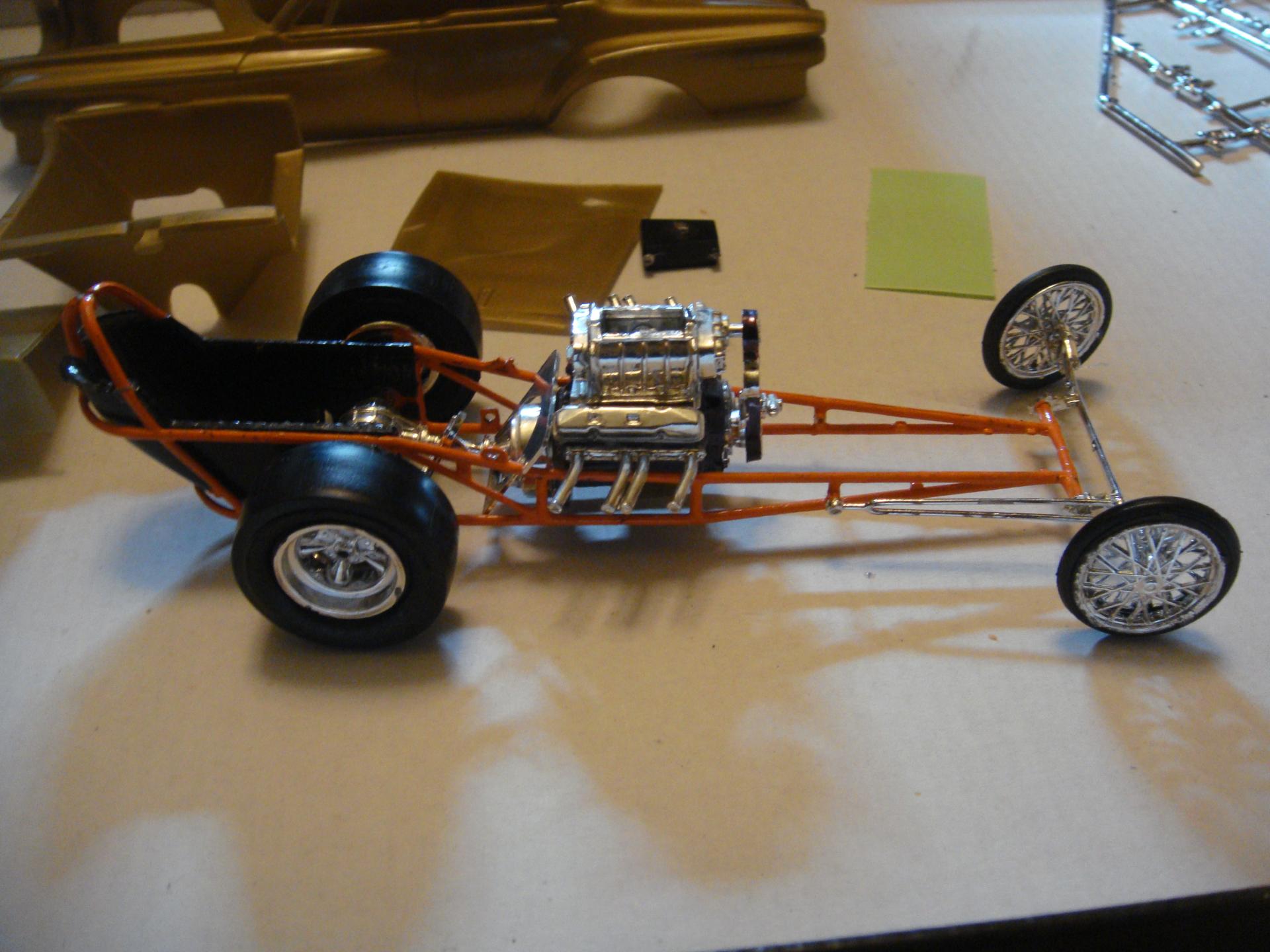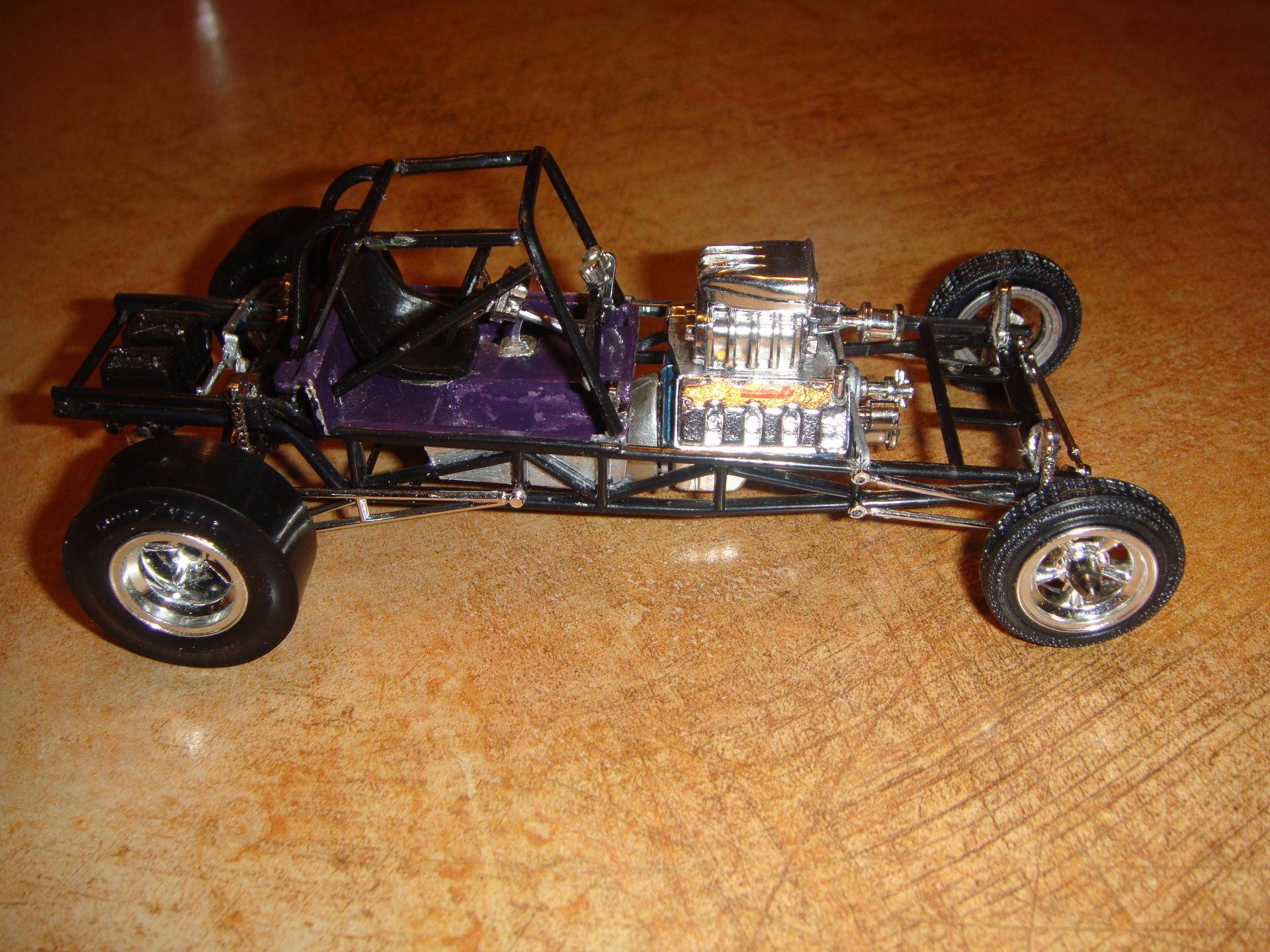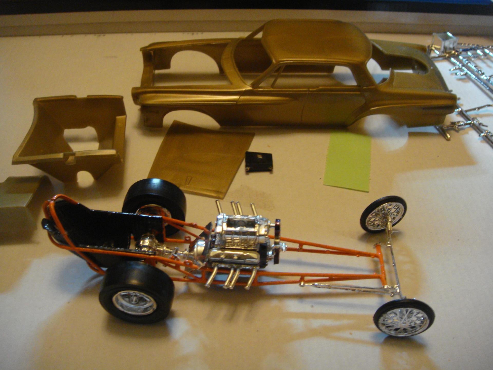 4. Well, it looked good when I took it out of the box then the 45 year old glue fell apart.... I had only built the rail dragster for display when I was a kid. I did not like the looks of the Dart so it remained untouched in the box. Somehow though the decals are not in the box...I have to figure out what to do... the plastic wire wheels seem to be getting soft maybe a reacion over time with the rubber tires. I used the wheels from my Pinto Crazy Horse to replace them though they are a little smaller... I have popped it all apart and glued it back together..... it begs a question though as with the other models I am resurrecting do leave them as done or detail them plugs etc...? If I find the decals I will paint it lik the box art cover though just the red I now like the gold plastic it almost looks metallic...