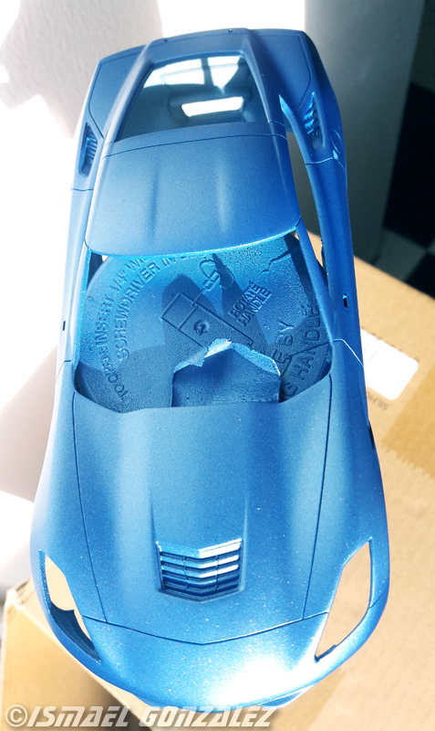25. Hello? Anybody here? Hi! After 7 months, I finally got some workbench minutes. Why I keep fighting this stupid model is beyond me. Maybe I don't want to be beaten by a chunk of plastic. So Anyways, the repairs on the roof were not that smooth. The only way to fix it was sanding down to the primer and leave a huge ugly primer spot. This is how it looks after 2 or 3 light paint coats. So after careful sanding and prep I started applying light coats. I lost count but there are more than 10-12 coats here. It is getting there. I'll let it dry. I plan to do maybe a final color coat on the whole car before masking for painting the black. The more I work on it, the farther the finish line looks... Stupid model Thanks,