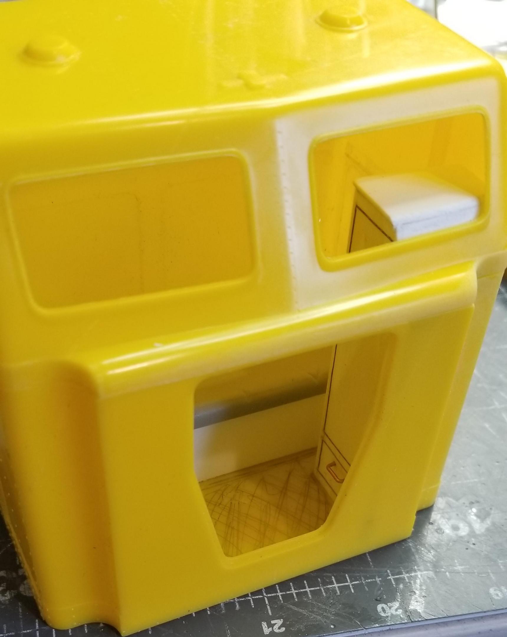 Hey guys Here's the final art work for the mural. I'm going to add a round tag under his collar that will be red with a white "U" on it. I also did some work on the Mack Superliner cab interior. I took the left hand drive dash from the Western Star and cut it up to fit in the Mack. It's not as wide and way deeper then the original dash for the Mack, but after some plastic magic...lol it fits great. this view shows the Mack interior with the driver figure that I kit bashed together. I also removed the arm rests from the two seats snd added them to the driver's seat in the down position, the passenger will not have them. This was not easily done, I had to cut the boots off of one set of legs in order to add them to the seated set of legs, after I removed the feet with the sandals off of those. I put the torso withe the cowboy hat onto these, then I added the arms from the seated figure to the final figure. After this I had to use a soldering iron to heat the arms and legs to bend them into position...wheh! this view shows the driver figure in the driving position. closer view of the driver. He actually looks a little like me...lol this view shows that his hands are on the steering wheel. this view shows that he just barely fits in the cab. I had to lower the seat mechanism and make a depression in the roof interior panel to make this work. this view from the rear shows that his feet sit on the fuel and brake pedals. this view shows that his right foot sits on the clutch.pedal. well that's it for now be back with more updates soon. Ron G