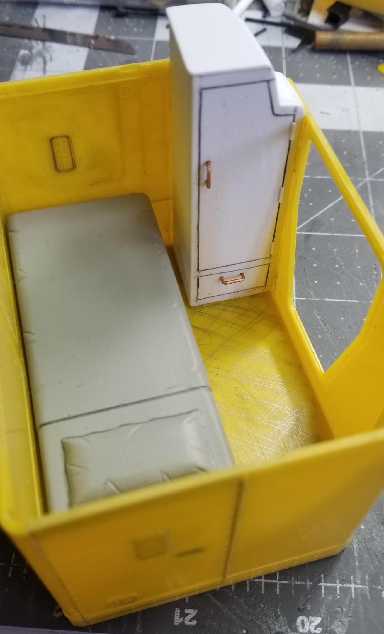 Hey all I kinda redid the mural for the back of the sleeper. What do you think? I tried to make him look a little more like "UnderDog", except as a bulldog. I did some work on the sleeper. I made a close closet with a lower drawer out of some 0.04 plastic sheet. I also made a lower support for the bed. this view shows the bed and the closet. this top down view shows the bed and the closet. There will be a refrigerator and cabinet on the opposite side. view looking through the sleeper at the closet and bed. Ron G