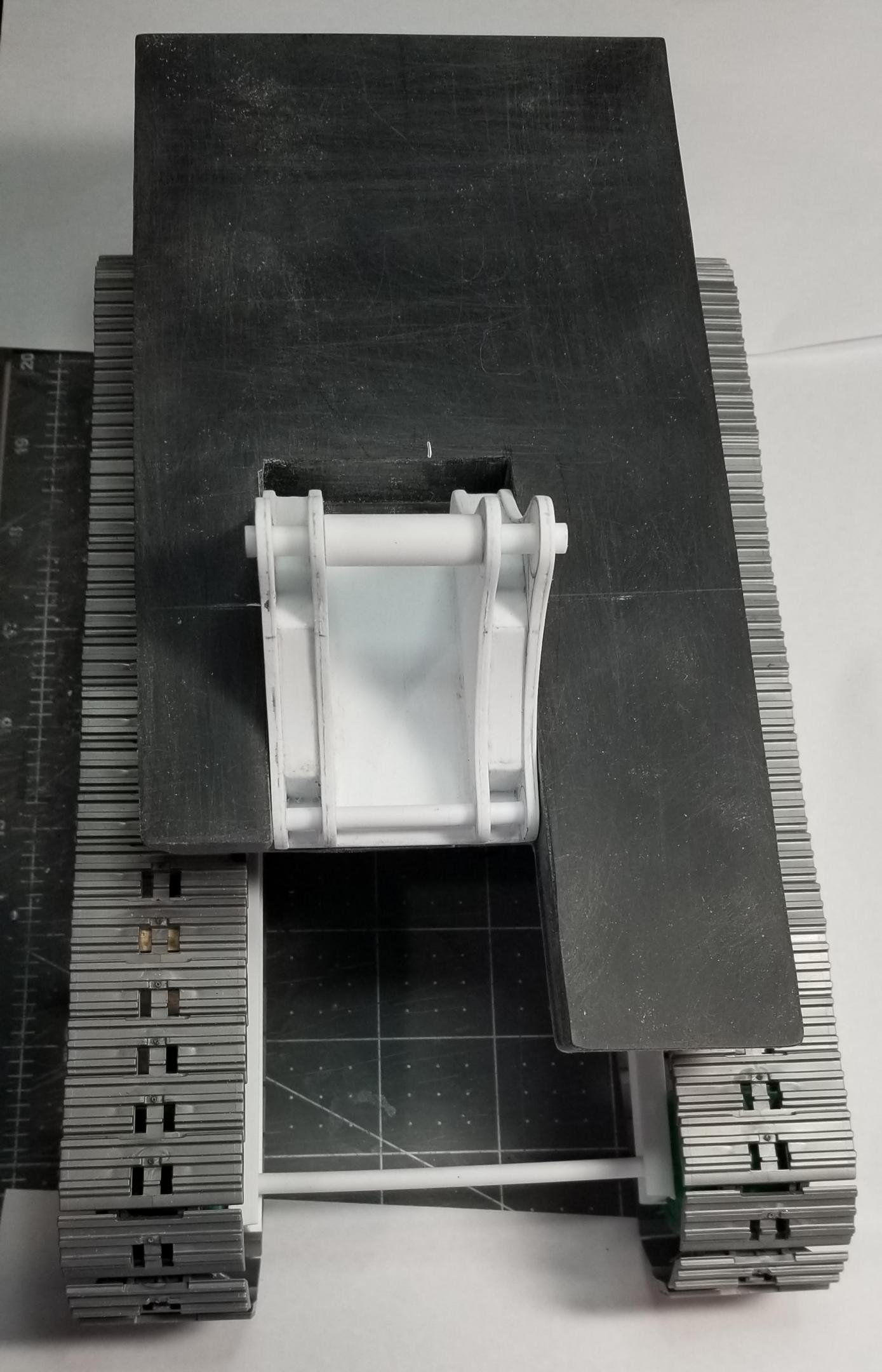 Hey all Small update for you all. I have the bodys base pretty much done. I made it out of some 0.06" thick black plastic sheet. this view shows the bodys base from the operators side. same view but more from the side. rear view of the base. view from the front of the base. this view is from the side opposite of the operator. top view of the bodys base. The operators cab area is in the upper right. Directly opposite of the cab is the hydraulic tank. Then behind that is the fuel tank. In between the cab and the hydraulic tank is were the boom pivot and boom cylinders will be, also the swing motors will reside there. The rear most area is were the Cat C15 engine will be. Well that's it for now be back with more updates soon. Ron G