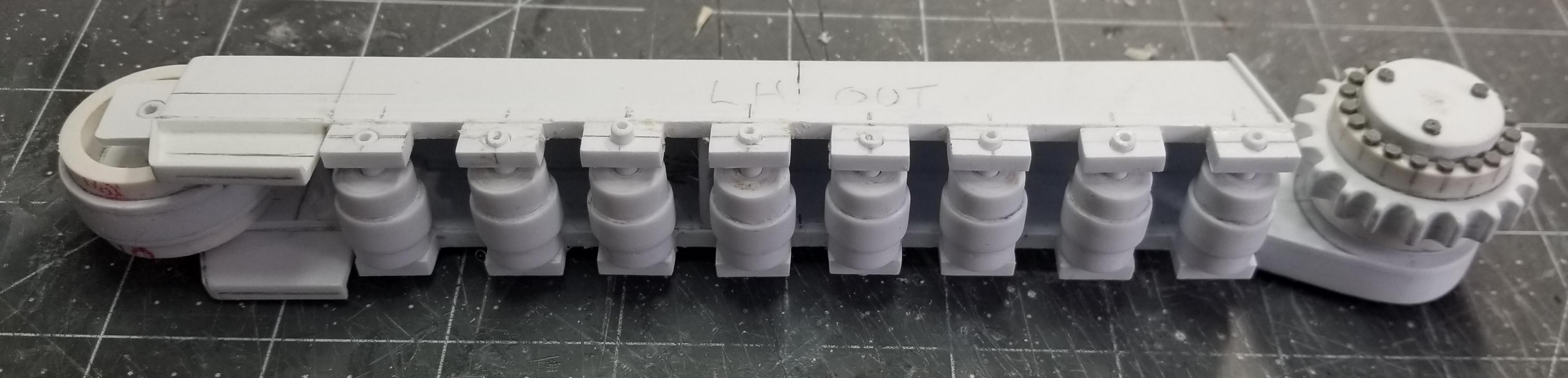 Hey all Another update for you all. I have one of the drive sprockets done. this view shows the idler and the drive sprocket. I made this from the same 3/4" diameter PVC pipe that I used for the idlers. I made the sprocket teeth from some 1/8" thick plastic sheet glued together to make it 1/4" thick. I then ground out the center of the teeth to the OD of the pipe. I then drilled out the notches for the track link pins, all 20 of em, then I sanded the OD of the teeth to the correct size diameter. I then made the inner peice out if three peices of plastic sheet glued together to make it 0.18" thick, then sanded it to the ID of the pipe and glued it to the center. I then made a peice for the outer edge out of some 1/8" & 1/32" plastic sheet glued together and then glued to the outer edge of the sprocket. To this I added some 2.6mm Meng bolt heads (20 of em, plus three) and voila you get a drive sprocket...lol more of a side view of them. end view of the idler and the sprocket. view of them next to a scale. this view shows them sitting on a piece of the track links. this view shows the idler and the drive sprocket in place on the tracks. Well that's it for now be back with more soon. Ron G