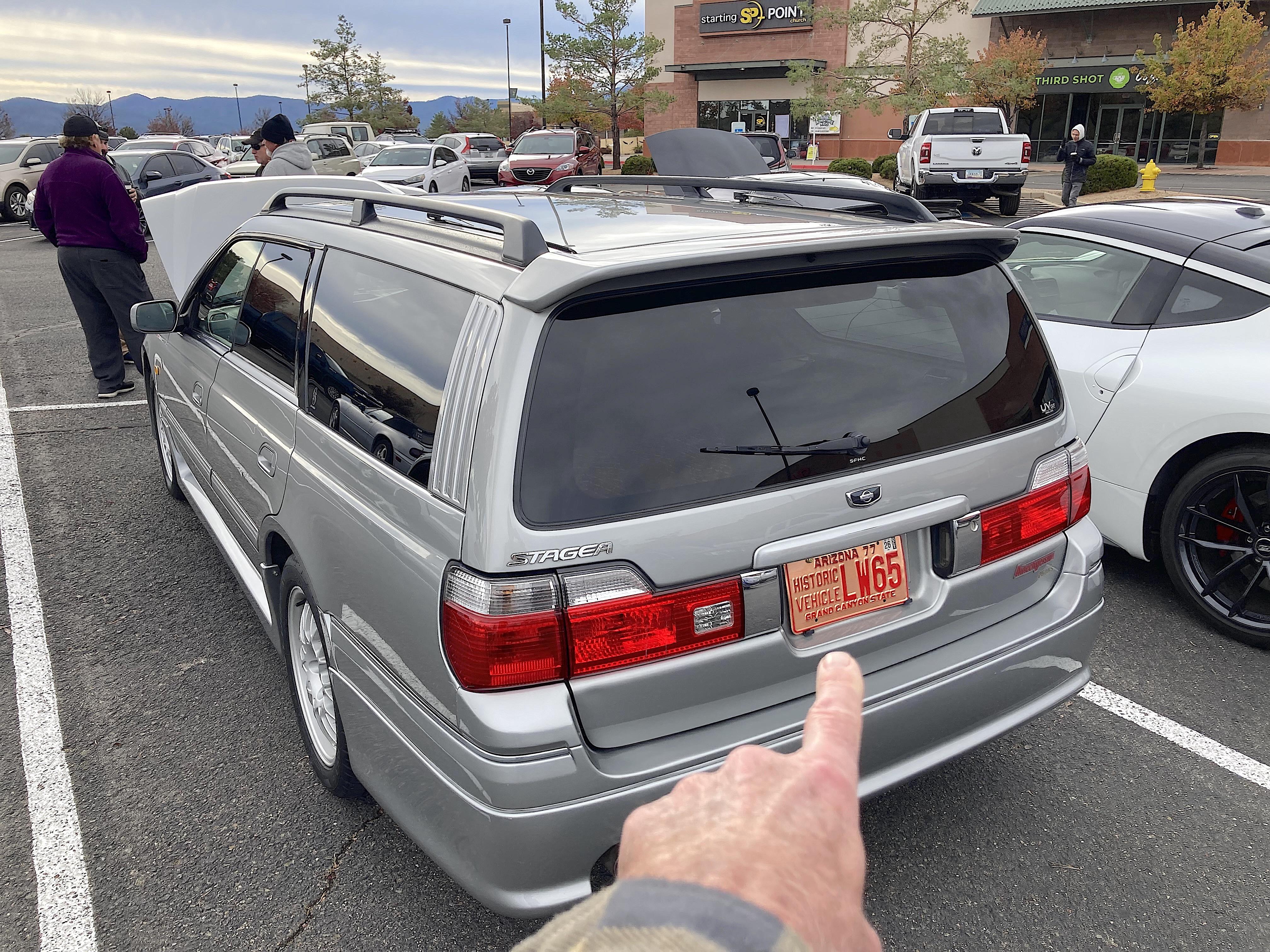 Pictures or it didn't happen. ðĪŠ (the traveling abroad tangent is interesting) JDM at the Prescott Cars & Coffee. There have been a bunch around lately, Embry Riddle University is here. I know Skyline is a halo car. But I never heard of much less seen one of these wagons. At first I thought it was a custom Volvo TR5. The young man with this Subie seemed excited that I knew something about Imprezas. Different engine. Notice I'm pointing to the Arizona Hysterical Vehicle copper plate, anything over 25 years old. Makes me feel really old, I read about these in magazines when they were new. It's just funny to me seeing Japanese cars with these plates now. But I'm glad to see the next generation being into them, better than some alternatives like hoarding model kits. ð -