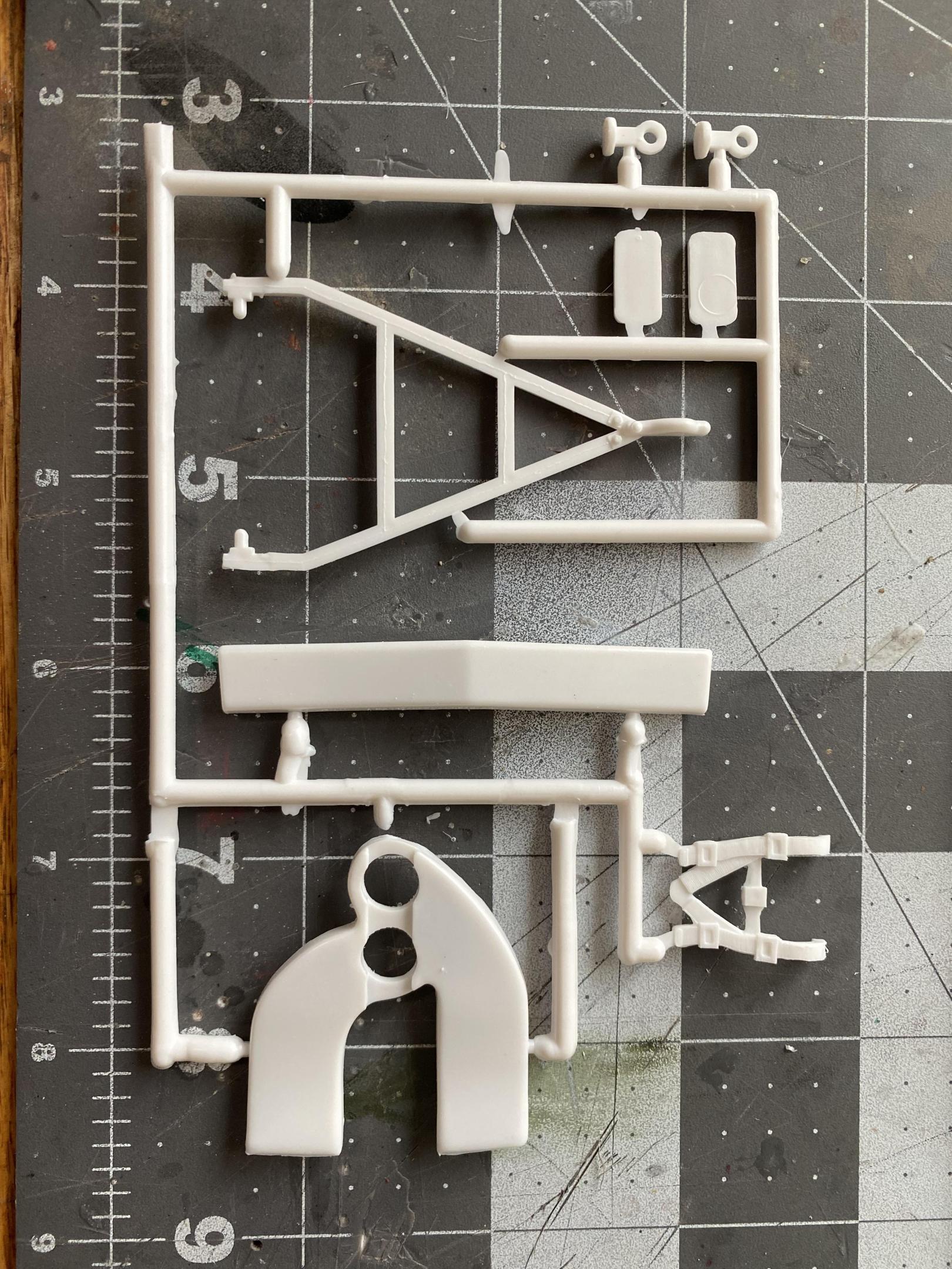I got an AMT Fruehauf trailer kit recently. When I opened the kit there were some parts from another kit, they don’t go to the trailer. It looks like a tow hitch, seat harness and a duct of some sort for a race car carburetor. There is also possibility a roll pan? Any idea what kit they are from?