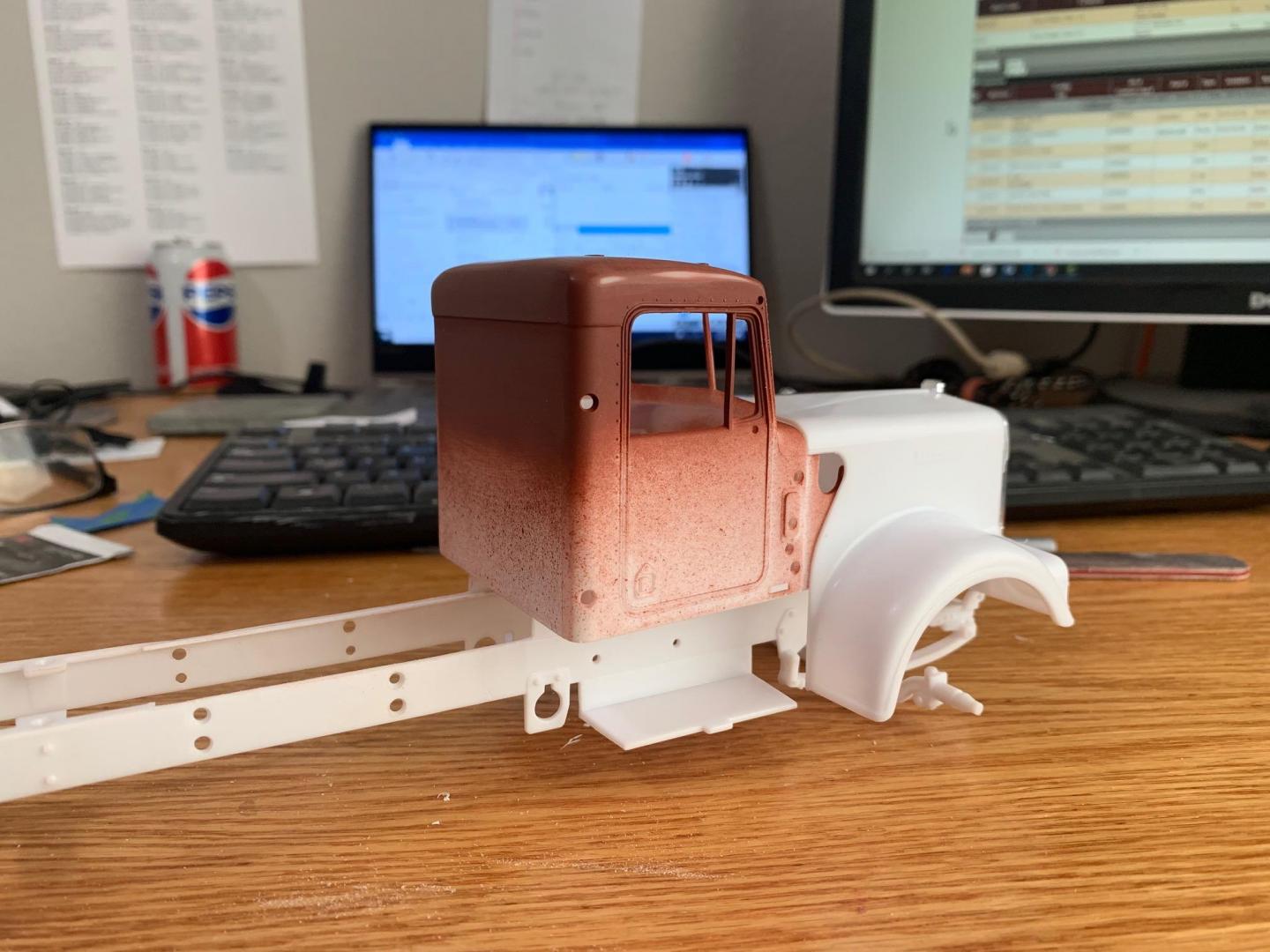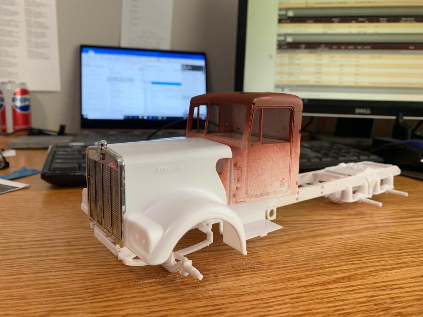 I picked up this Revell Snap KW W900. I realy don't like the Aerodyne sleeper it has on it and I am looking for a nice day cab for a future trailer build. So, I am cutting this one down into a day cab. I have the cab cut, the back wall installed and most of the body work done. I still have a few minor spots to finish up, but I will address those after I get thew rear window cut out and installed. I did a search for the back of the cab, day cab, and could find 1000 pictures of the front of a W900, but I think I only found 2 pictures from the back, but that is all I need. I still need to figure out about the wheelbase. It seems like it is a bit too long, but unless I use some custome step type tanks, I can't cut it down too much.