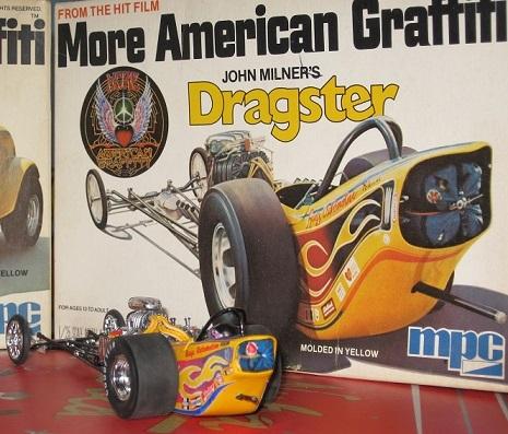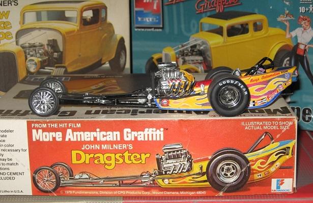 This is my More American Graffiti replica dragster model I built. This is not the original model from 1979, it is a replica. I turned a Jaw Breaker model into John Milners dragster. I cut, reshaped, trimmed. and angled the body corners just like the real car. I made my own decals, lines, plug wires, and even detailed the parachute. I made my own decals from a original scan of the decals I found online. I used from that set the red John Milner and blue tail piece. I printed them out using Testors paper, and made my own set of flames. I tried to make the flames as movie accurate in the shape and style. If the flames, didn't look right, neither does the model. I gave the car a modern line, and cut it where it should be orange. This was a replica body, Jaw Breaker model kit, and replica decals with many hours of work. This is my first custom model I have ever built. This goes for building a driver that fits in the car. This model looks like what the fans should have always been sold in the first place. I hope, I didn't disappoint any Graffiti fans out there. One more thing I will point out Jawbreaker's kit has many flaws, and needs a bunch of work. You have to sand, drill out areas, and the frame is constantly coming apart on you. I put a rod into the motor, and used JB Weld in the transmission. This way it is well hidden but gives the motor extra support to stay in place. On the angled areas of the body, I used JB Water Weld to give them a nicer rounded look. This build took me 3 months to do in the winter months for a model contest. Only thing that gets on my nerves is the flash made the colors look lighter than what they really are. I even built the 2003 AMT American Graffiti/reissue of the More American Graffiti Deuce Coupe. Still love how the builds look with the original box art. issue