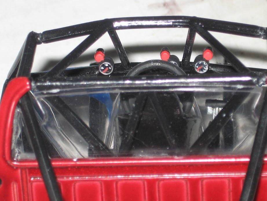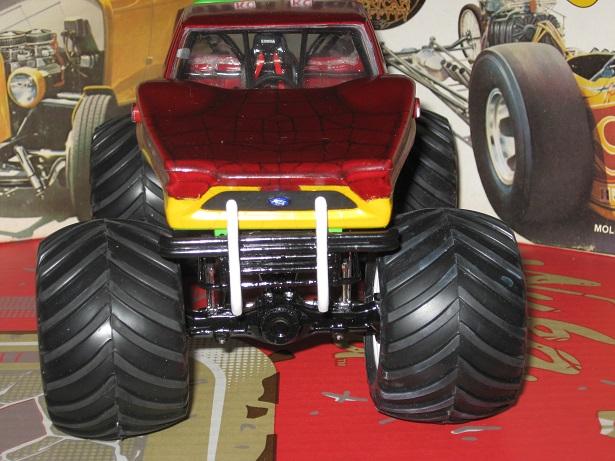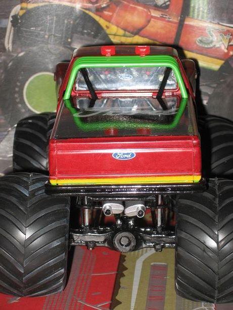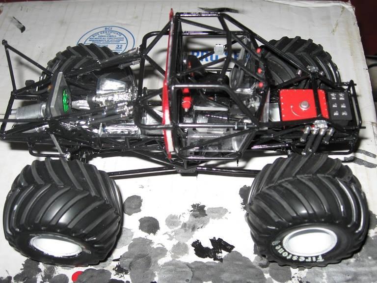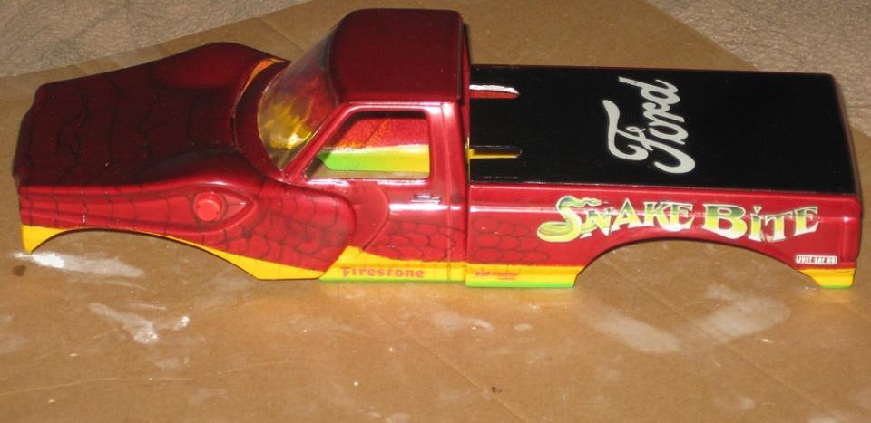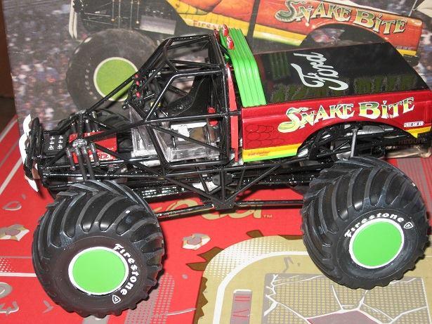 Here's my 1994 Snake Bite Monster Truck. I started this when I was a kid over 20 years ago. I stopped after I glued up the engine, and after some of the body was painted. I decided to finish the kit for a model contest. Sadly, Snake Bite didn't win, but it took 3 months to build and detail it. I built it with the body able to come off. So I can remove the hood/cab or just the box. The hood has all the scales/ridges outlined black to show thru the transparent red paint.I also switched out the metal axles since they were short and couldn't hold the weight of the tires. I used a coat hanger and that works just right to support the tires weight and is now long enough to work. I ended using the one of the axles on my Graffiti coupe since the plastic bars couldn't fit since they were too short over the motor. I filled in the gap for the grill with a cut piece of the spare hood for the Graffiti coupe. This is probably going to be my last monster truck since I forgot how much I hate kits with frames. Monster trucks now fail in the pain in the kits to build with dragsters, and NASCAR cars. .