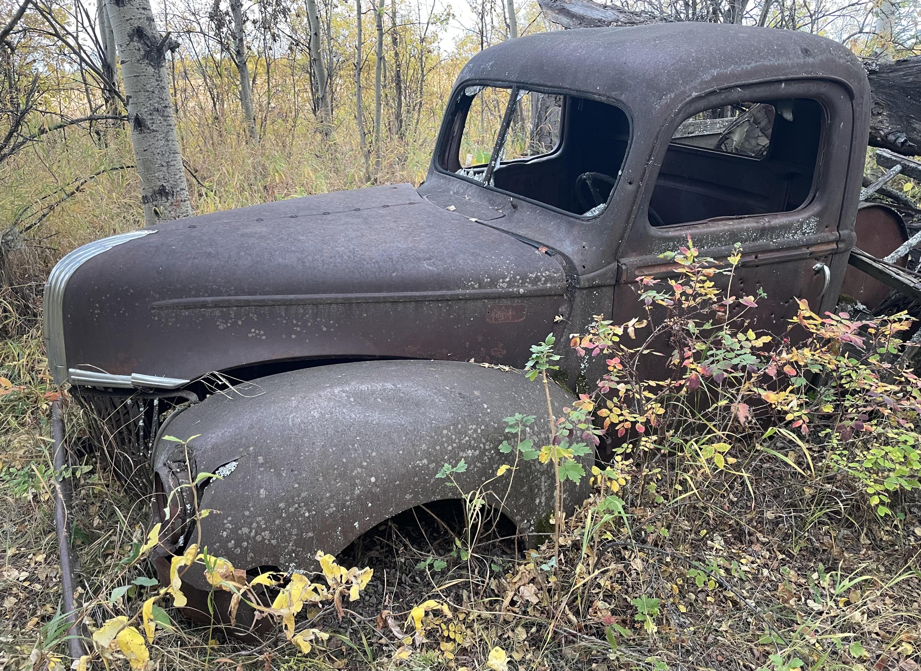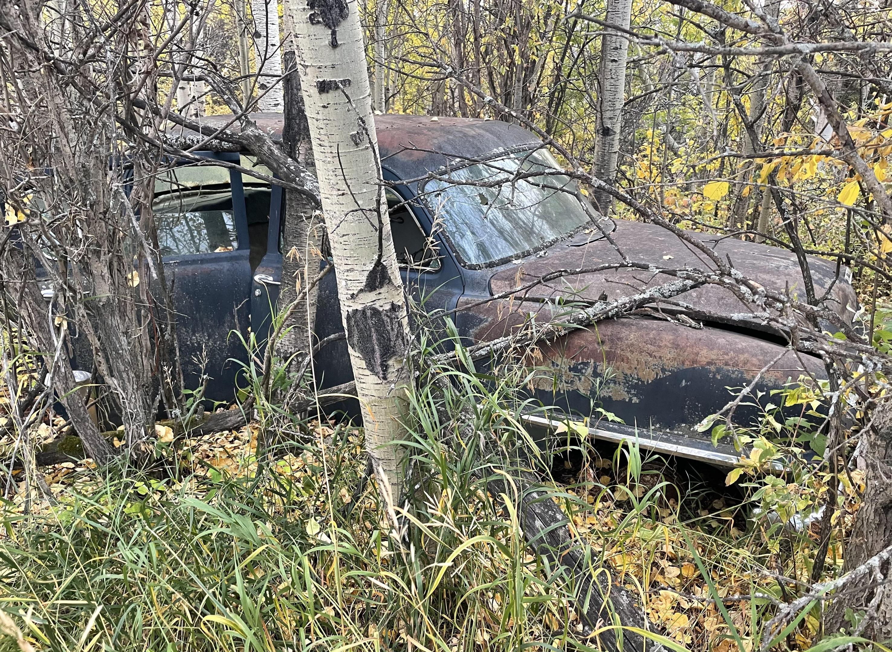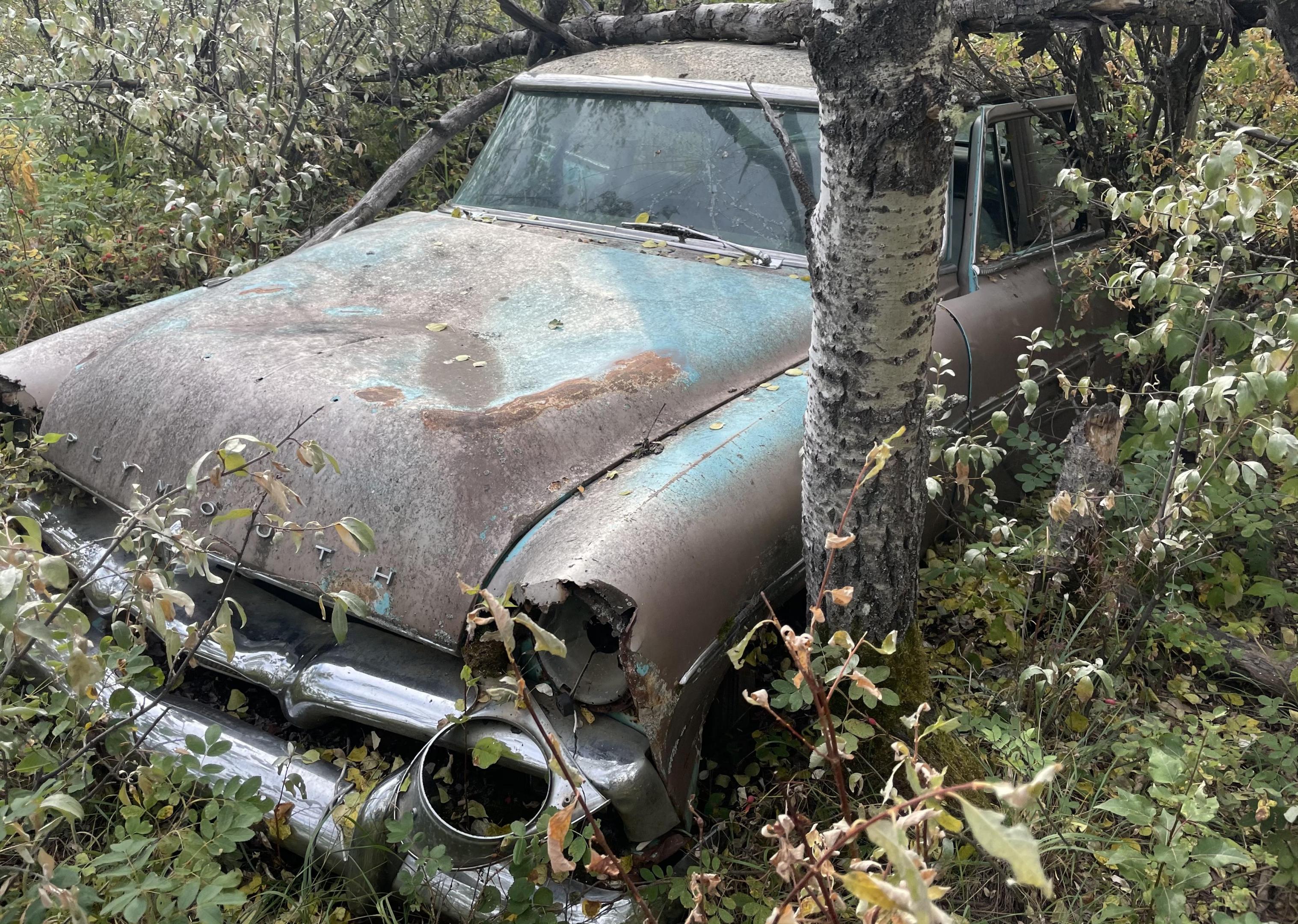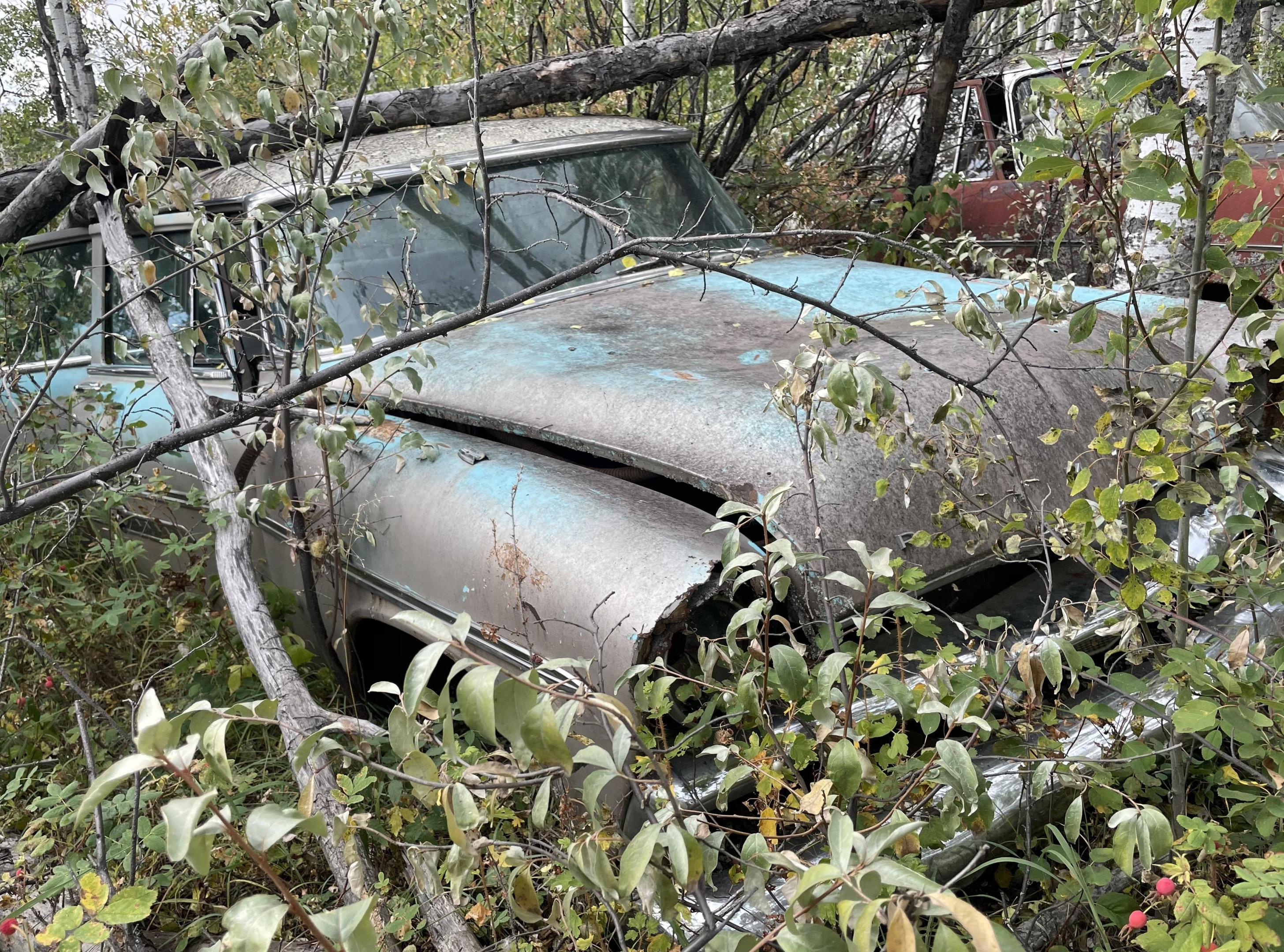 I spent the day adventuring through my great grandparents farm today looking for some cool stuff, do it every time I go there and always find something new. this time I found a handful of vehicles I never seen before on the banks of a small creek. Im not sure on the year of this one but it appears to be a 50s Plymouth and right beside it was something i have never even heard of before, a simca vedette made in France with a flathead V8 that looked a lot like a Ford Flathead (I didn’t get a picture of the engine) as well as a 50s Chevy cab that looked to be in pretty good shape I found the other parts of the truck in a steel pile quite a ways away in very bad shape. And then way off the edge of the valley there was a 50s Fargo cab that looked like it was rolled down the hill but in very good shape, the box and front clip were closer to the top in good shape as well. the best find though was a mint Ford super duty hood scoop (the same ones used on Pontiac super duty cars) off of an old mercury truck cab that I was able to get. It was missing the cast grill peace but after digging through the cab someone actually took and left it behind the seat. I am going to do my best to rescue all of the vehicles and more from the bushes and some old buildings that are full of stuff either this fall or next summer.