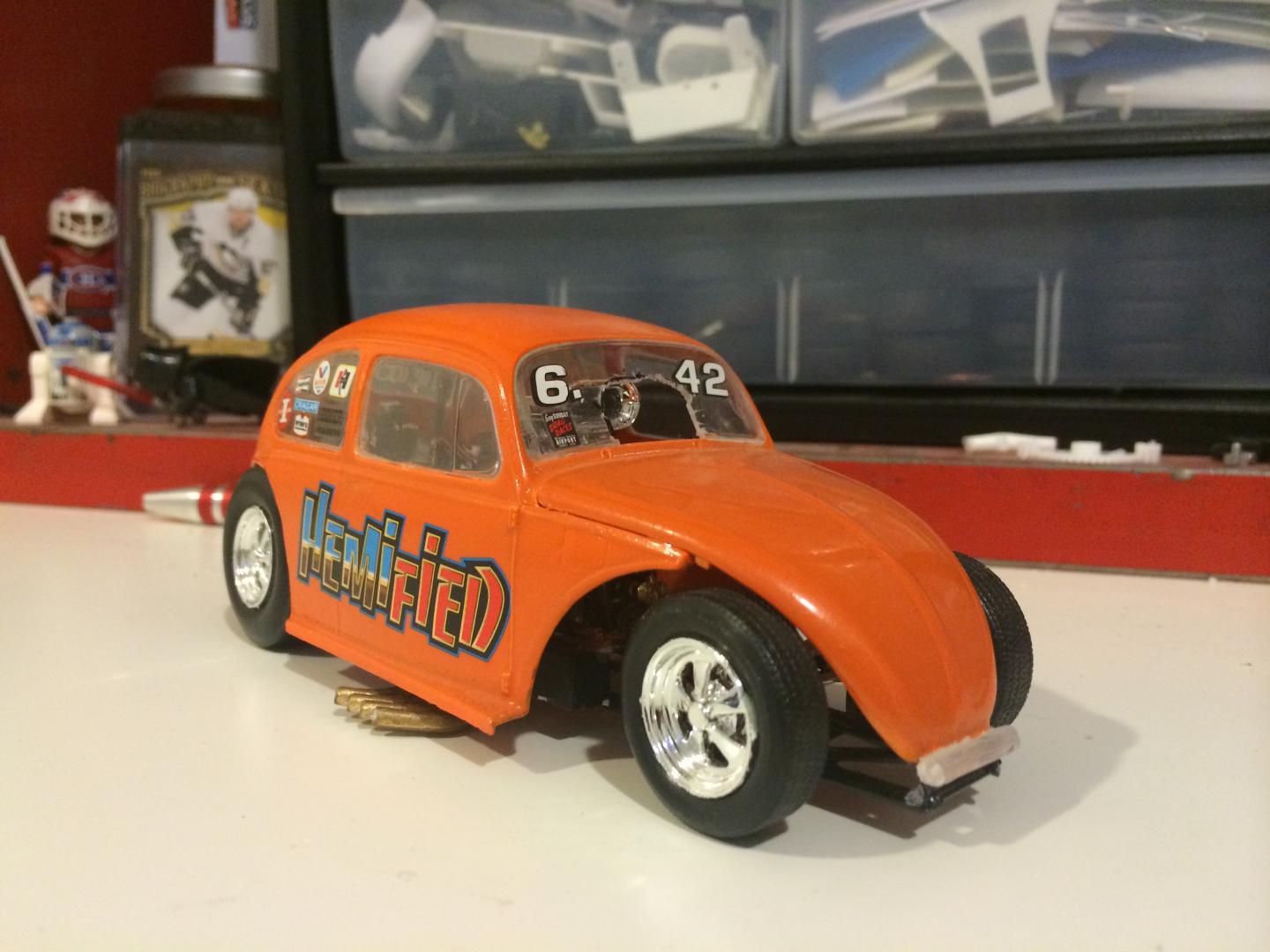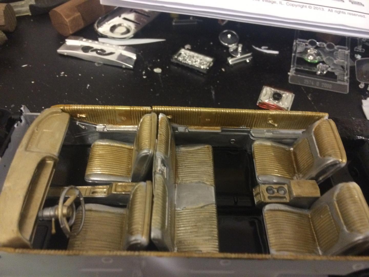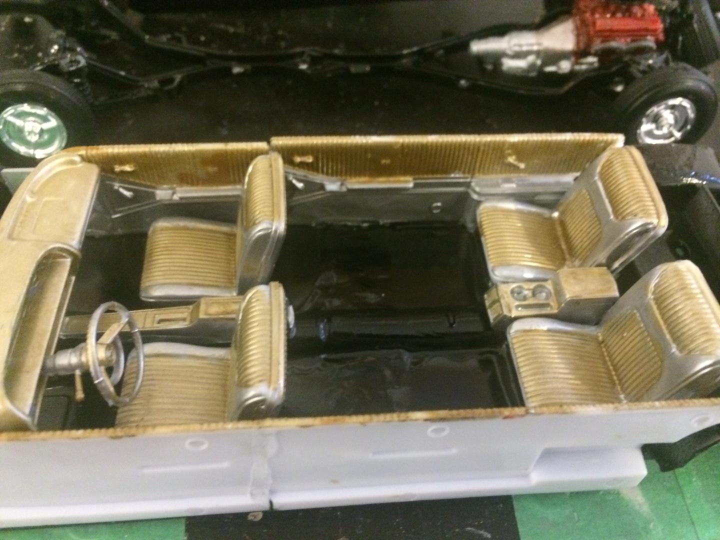 Got paint on it last night and the top where I did body work didn't turnout the best so it will need a second coat. I got the motor almost done just needs to be wired and interior done this morning. The space between the drivers seat and the back seats will ether have a 60s TV set or a table let me know what you think would be best tv or table???? thanks. Comments welcome