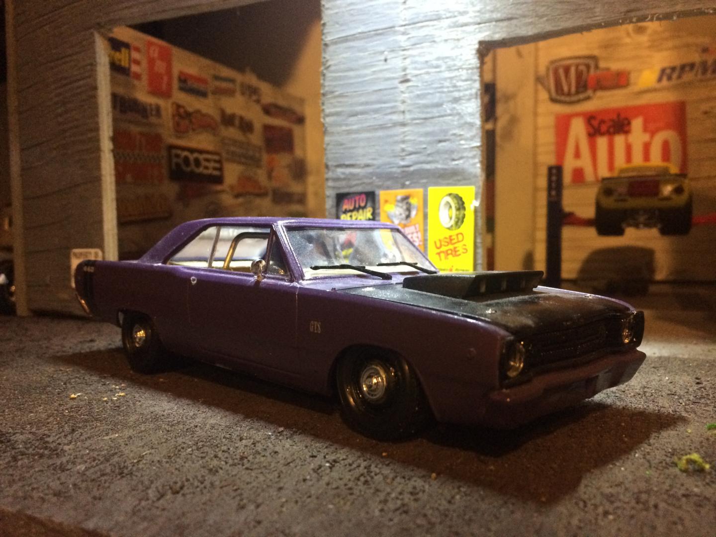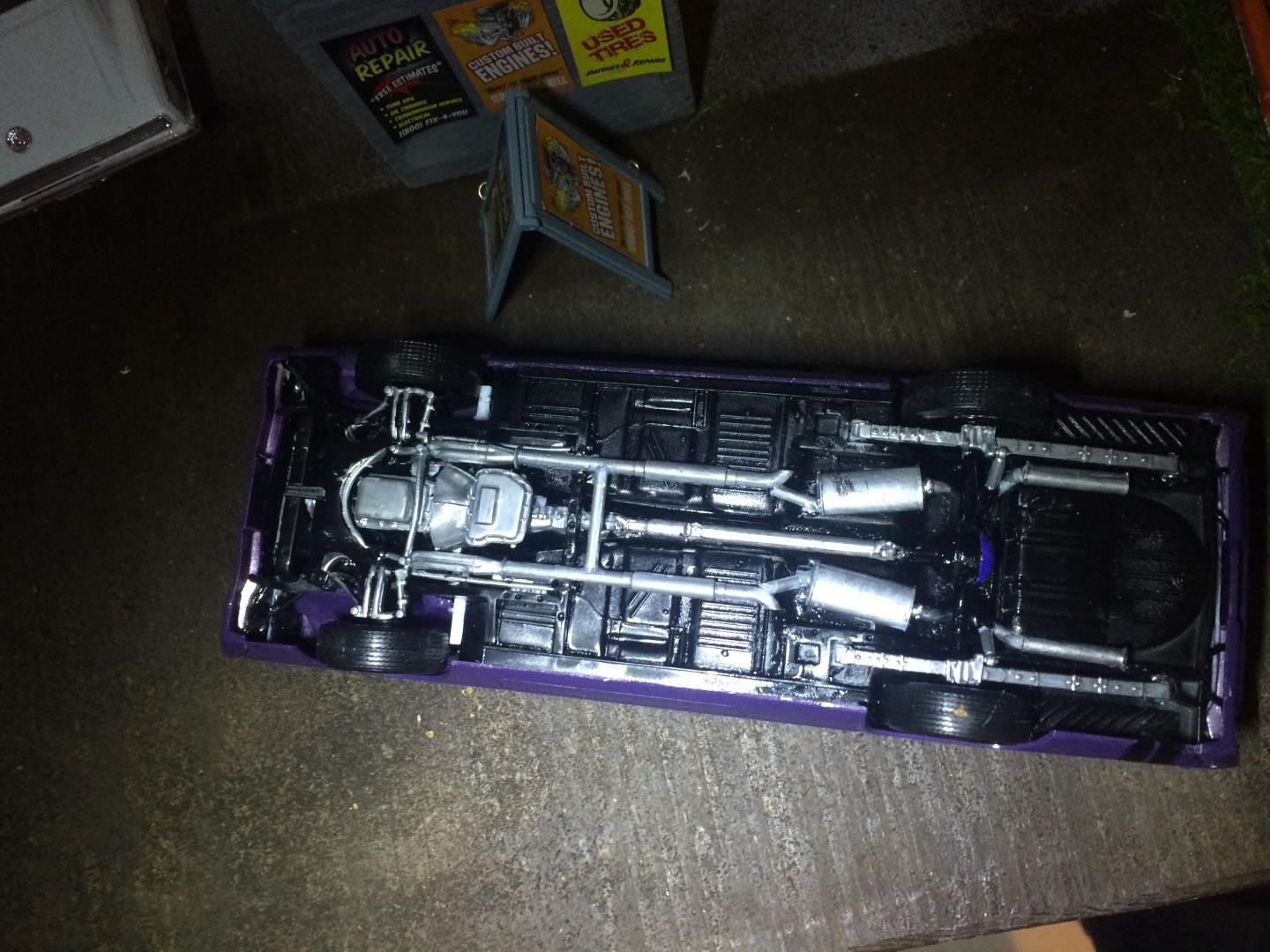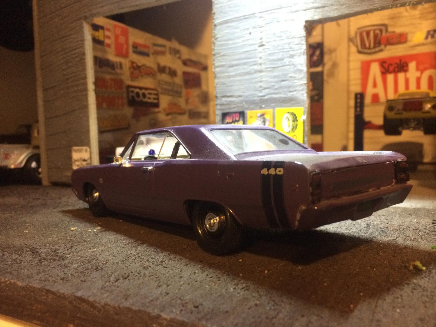 It is a revell 2in1 kit with a 440 bib block and the HEMI hood scoop.I flipped the front spindles around to get I lowers and stock rear suspension with the 8-3/4 rear end, exhaust dumps, factory rims, tires and most of the chrome blacked out. Comments welcome