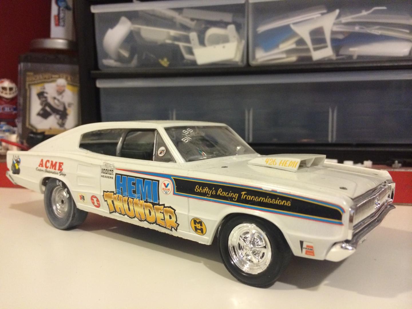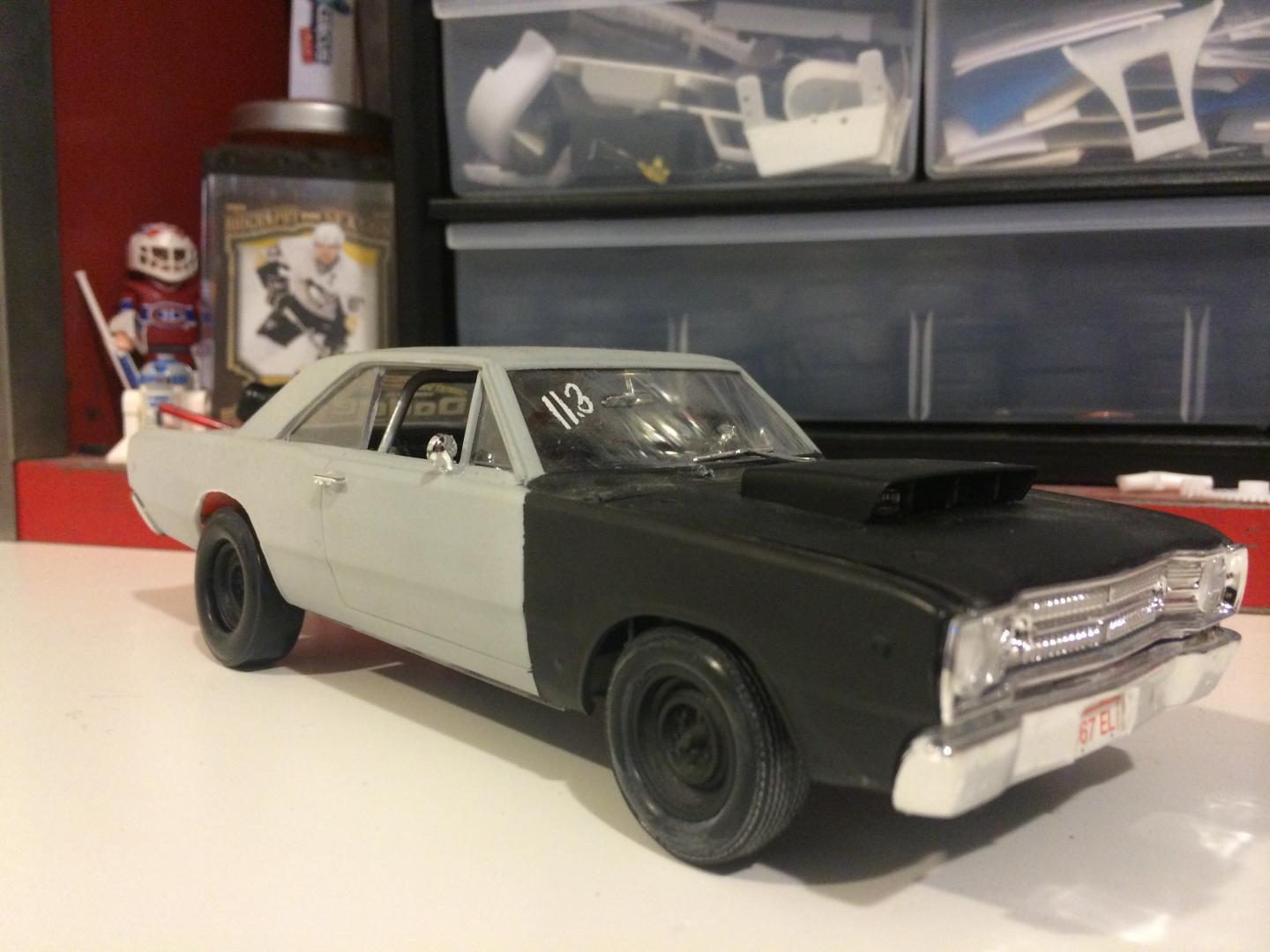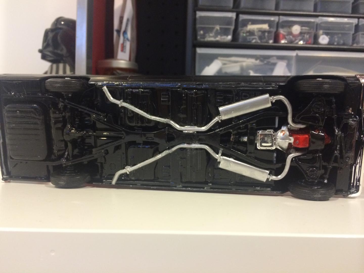 It is a revell 2in1 kit with a 440 bib block and the HEMI hood scoop.I flipped the front spindles around to get I lowers and stock rear suspension with the 8-3/4 rear end, exhaust dumps, factory rims, tires and most of the chrome blacked out. Comments welcome