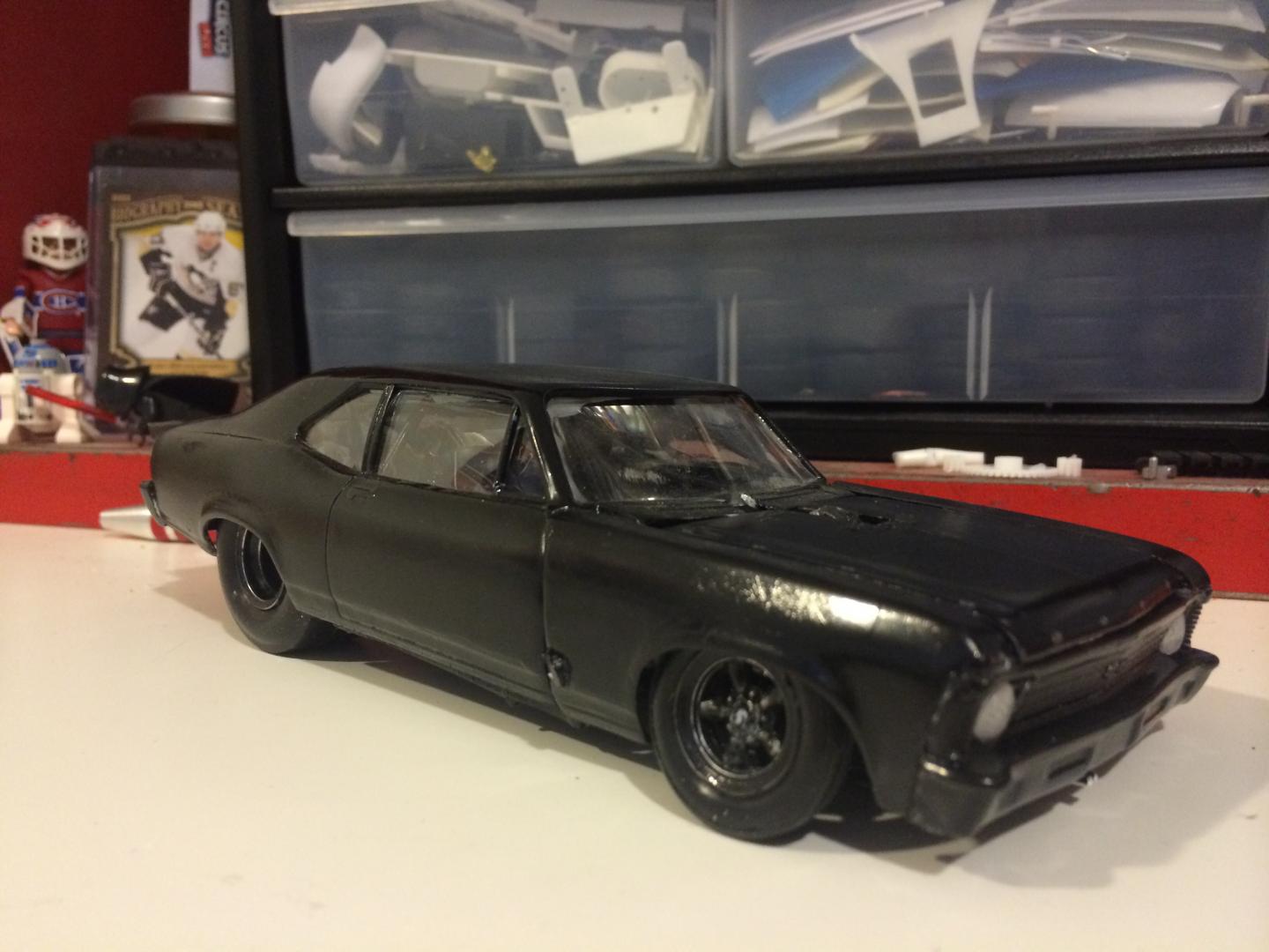 Just started body work today after getting primer on last night. This is my first time doing body work so any pointer or suggestion on what I should do would be great. I plan on painting the motor and interior today and maybe get the fist coat of black on the car. coments welcome