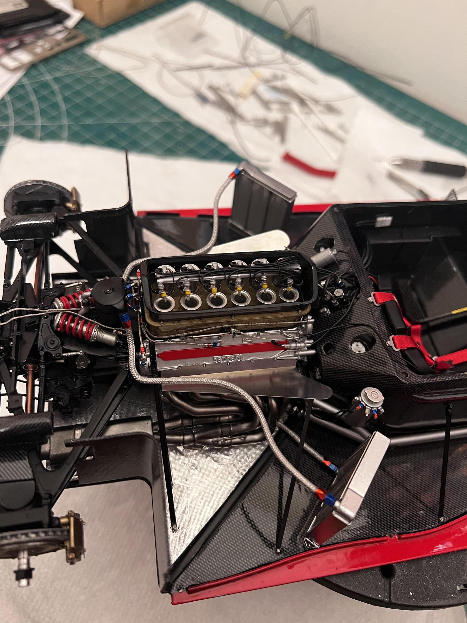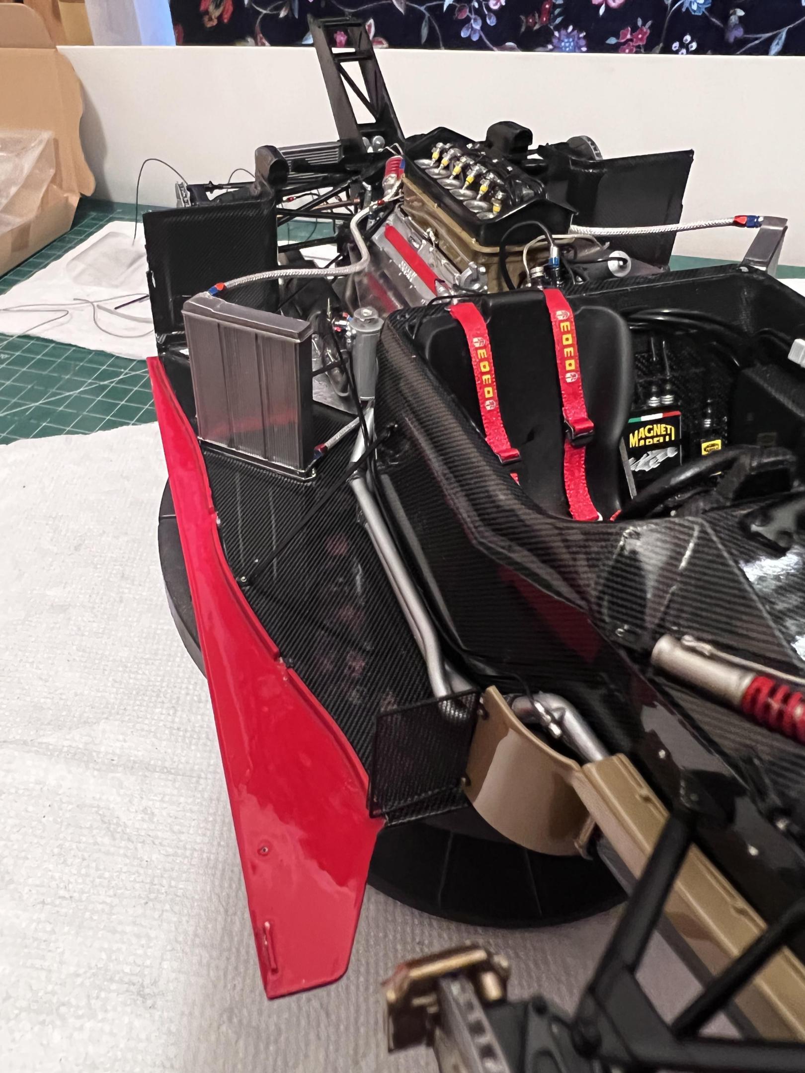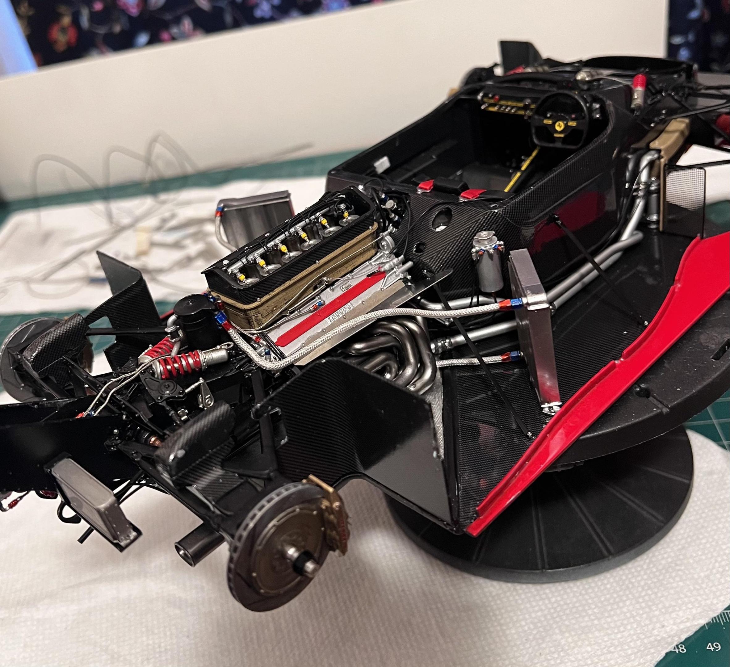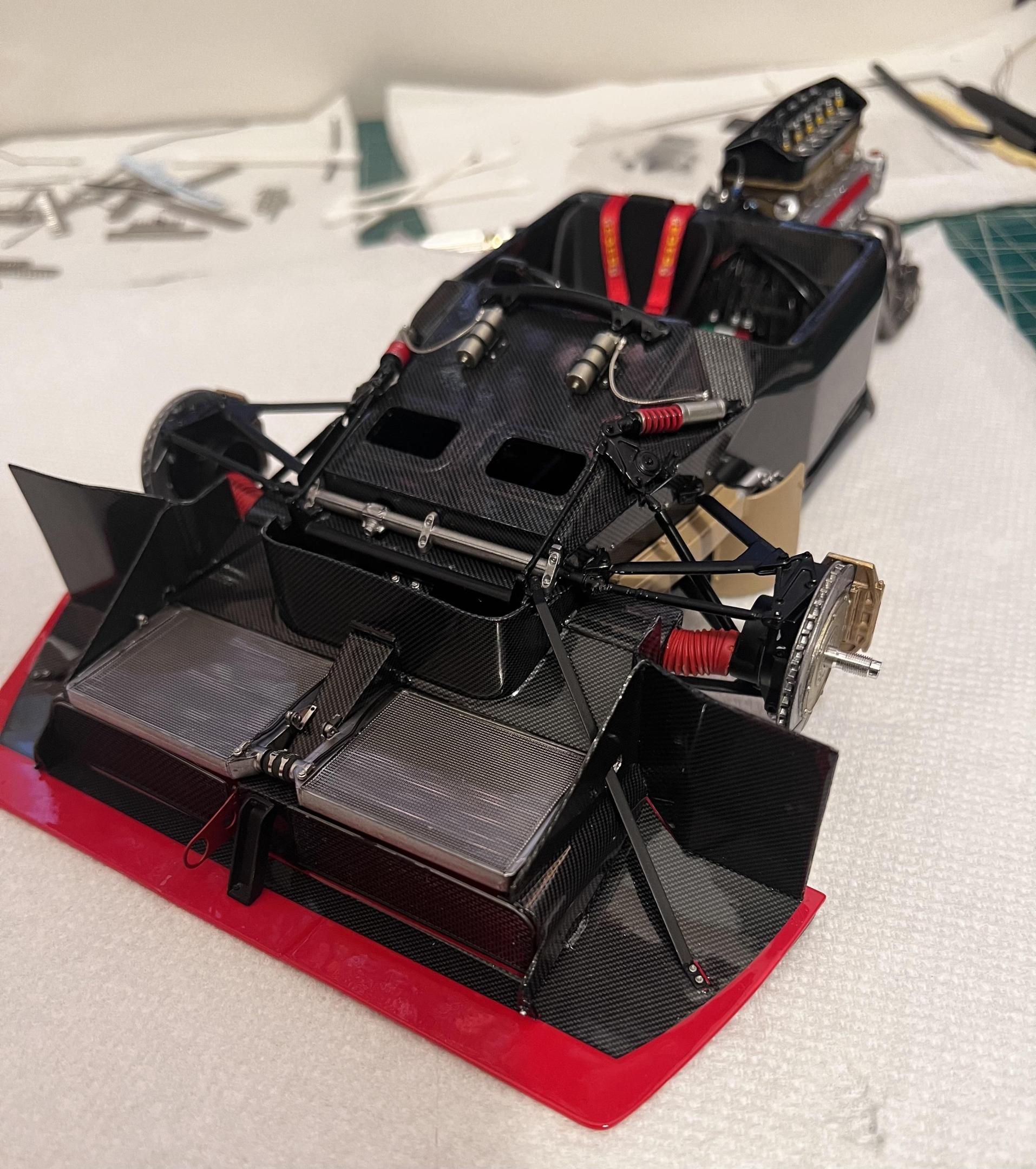 It’s been a wile since my last update. I hade to wait a couple weeks for a set of replacement decals, I re did the front, after looking at a couple other people’s build’s. I decided to add carbon decals to the bottom plate. As you can see the front suspension is installed and attached the engine to the tub. Then came all the little fiddley bits that add to the realism of the car. Next on the menu is to install the gearbox and start on the body panels. Till next time ? -