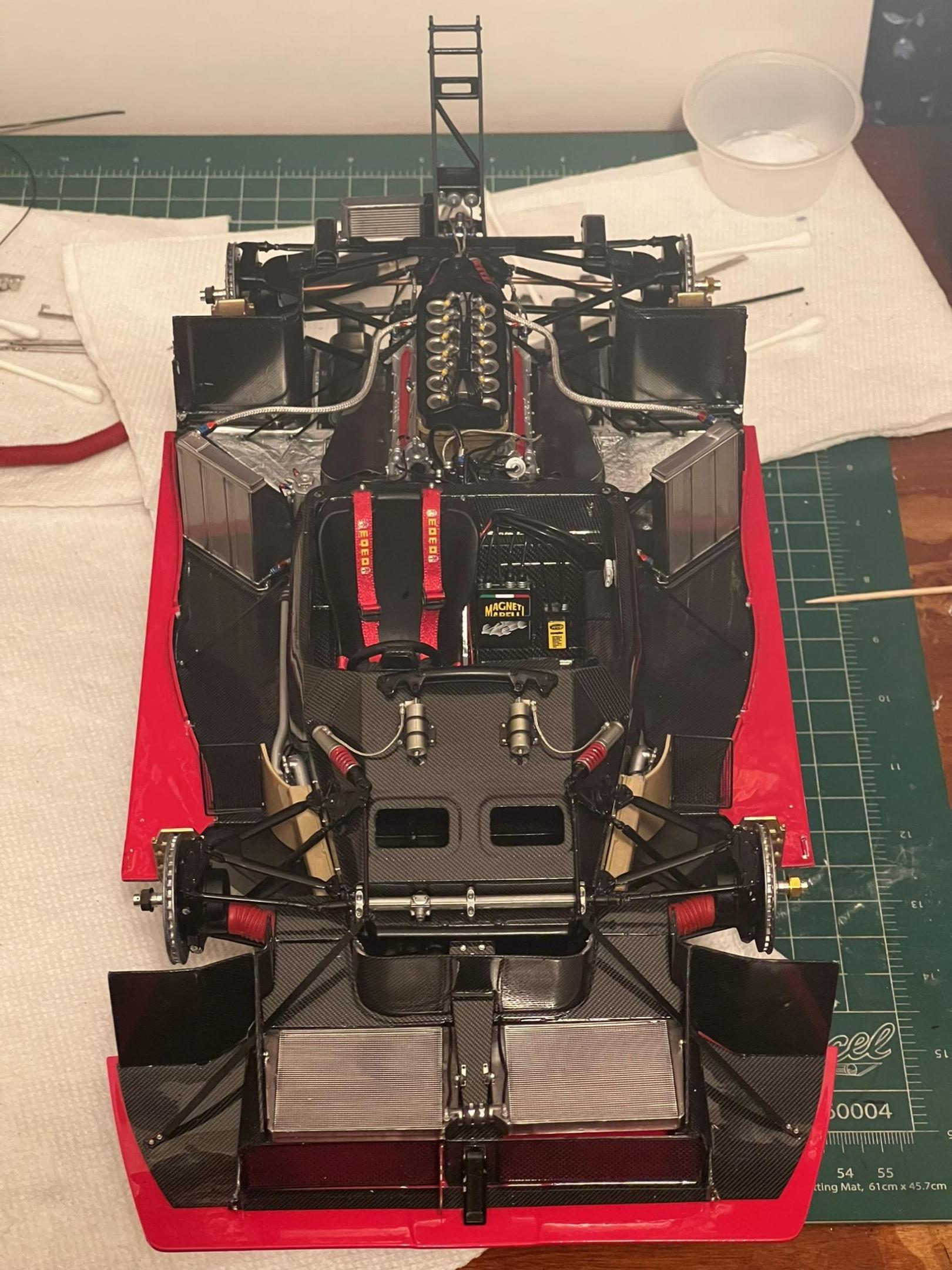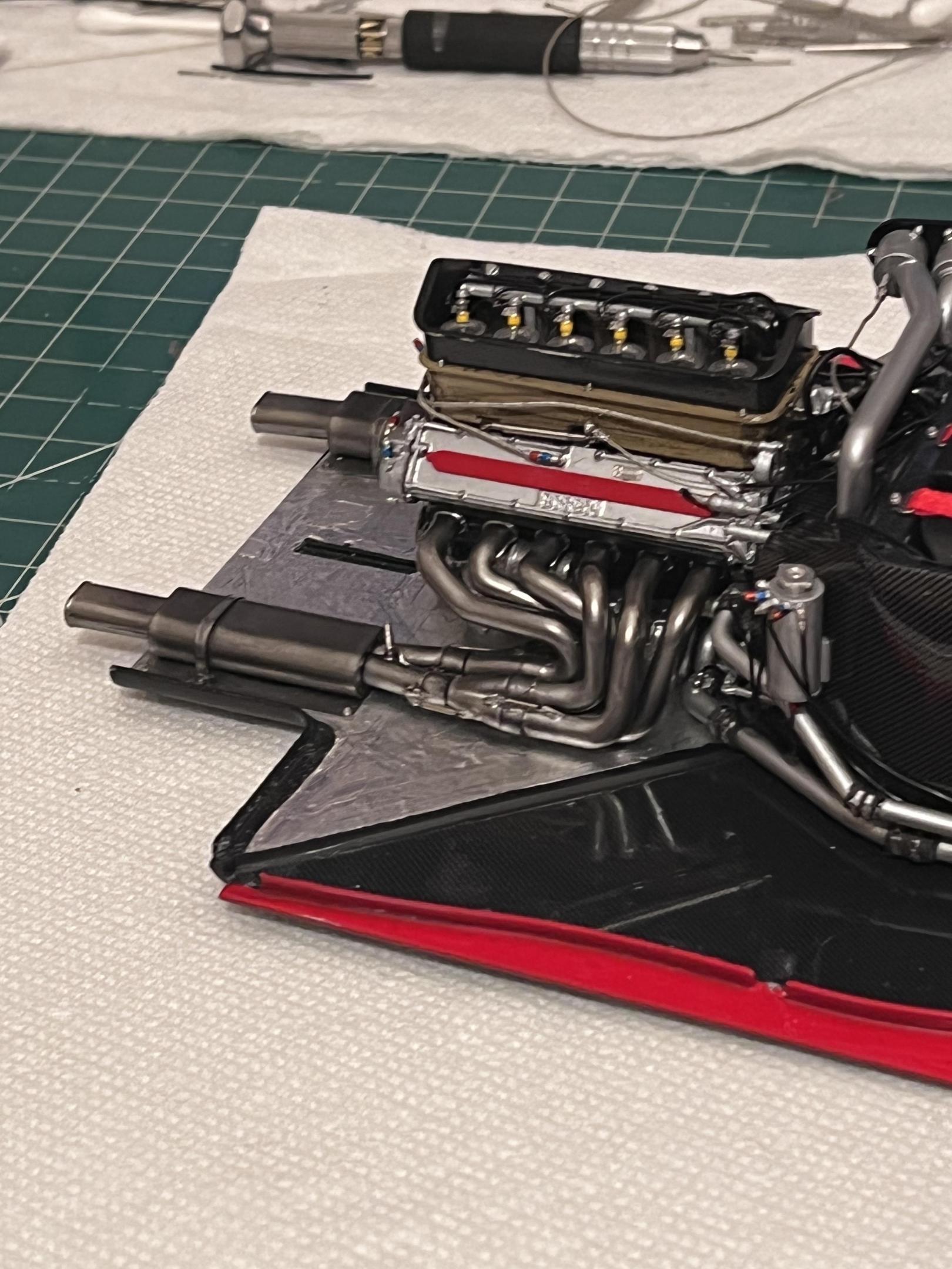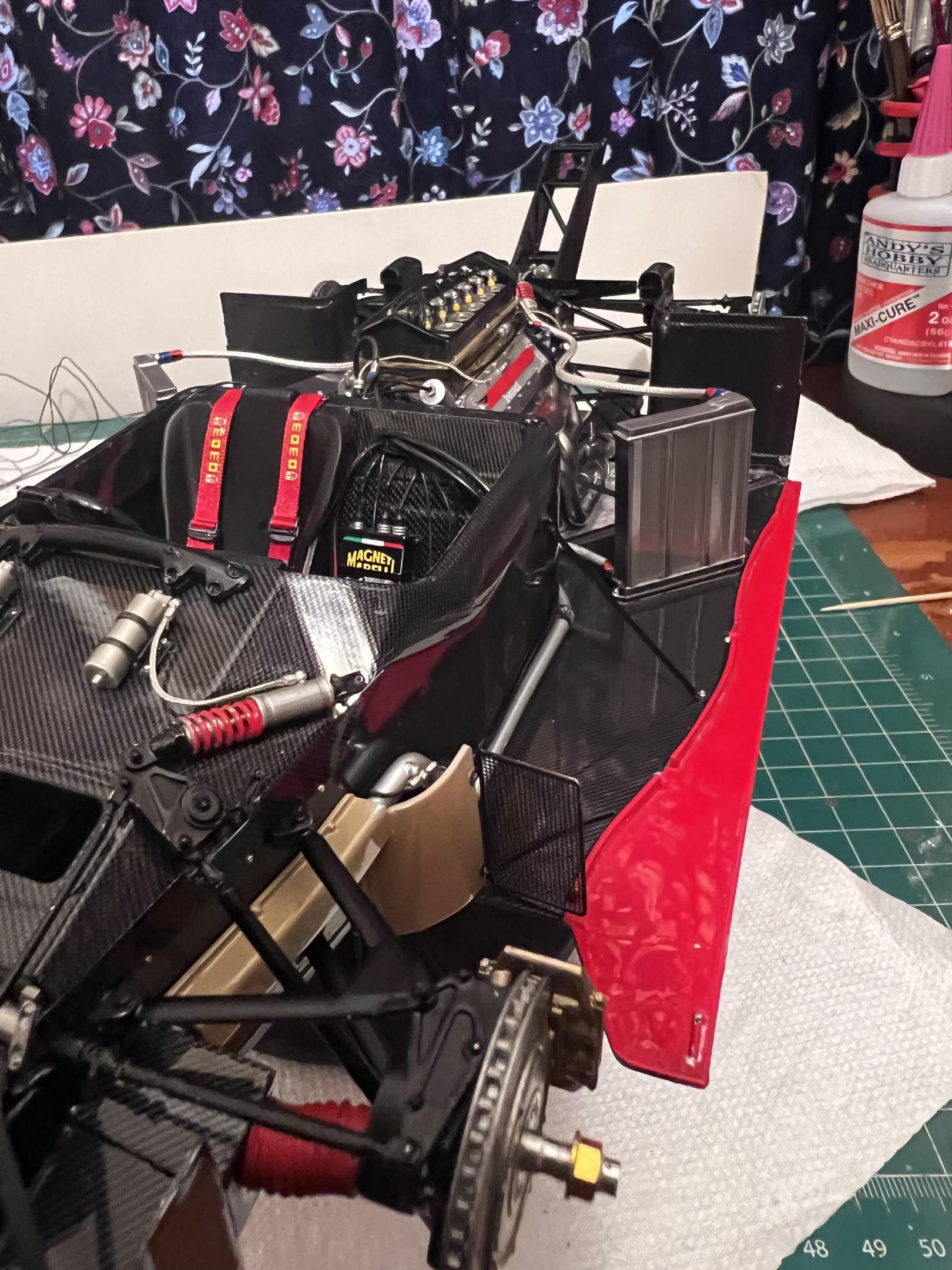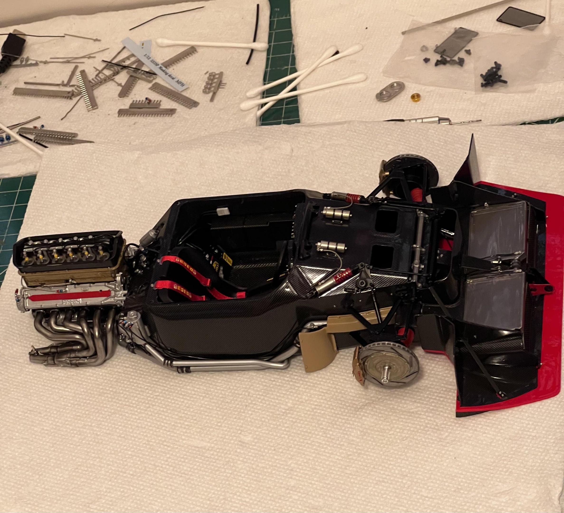 It’s been a wile since my last update. I hade to wait a couple weeks for a set of replacement decals, I re did the front, after looking at a couple other people’s build’s. I decided to add carbon decals to the bottom plate. As you can see the front suspension is installed and attached the engine to the tub. Then came all the little fiddley bits that add to the realism of the car. Next on the menu is to install the gearbox and start on the body panels. Till next time ? -