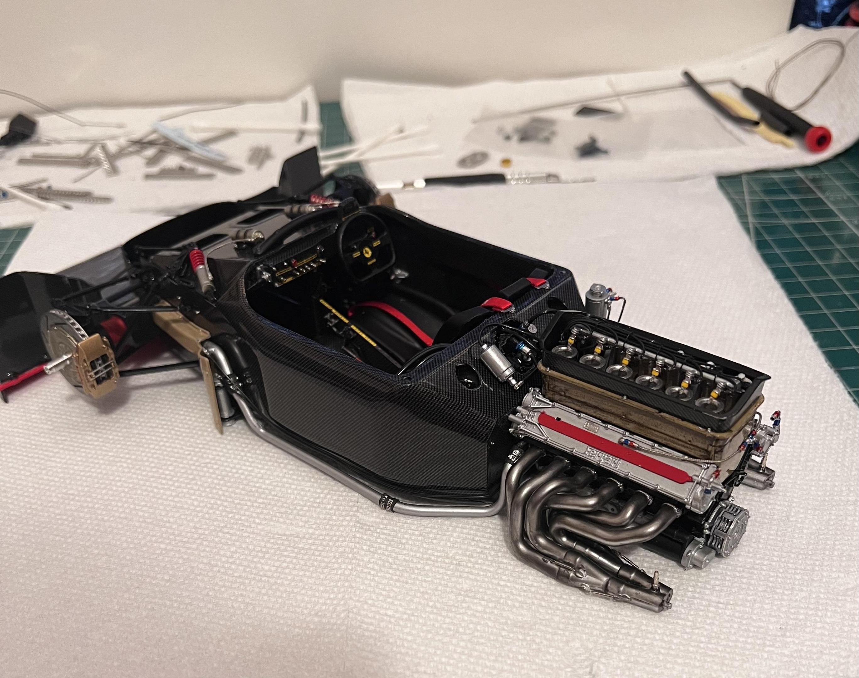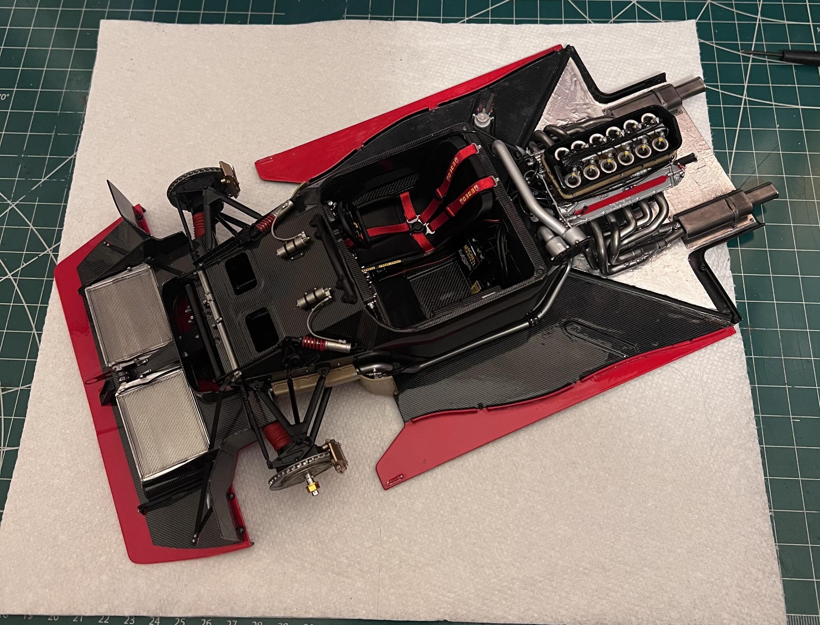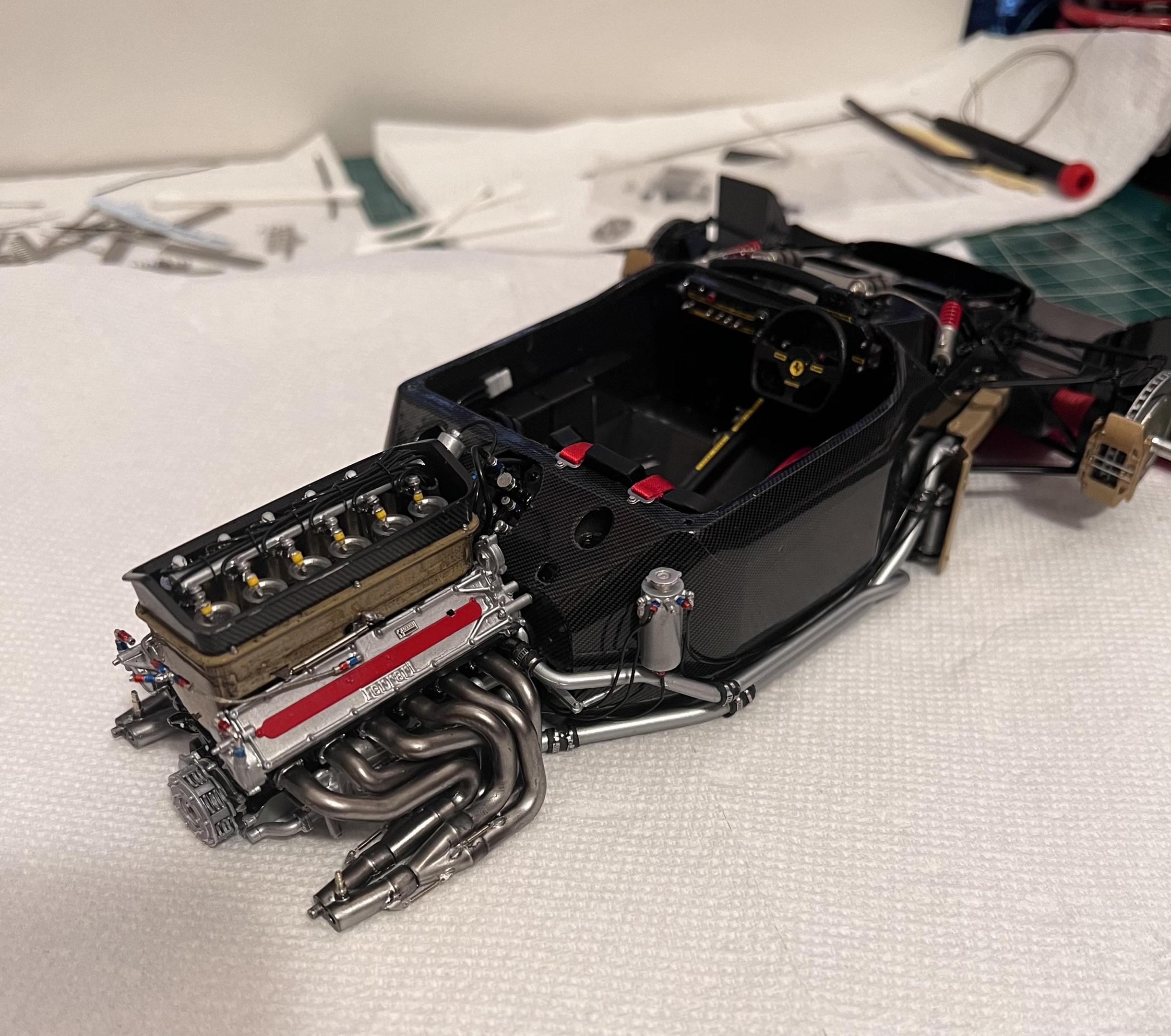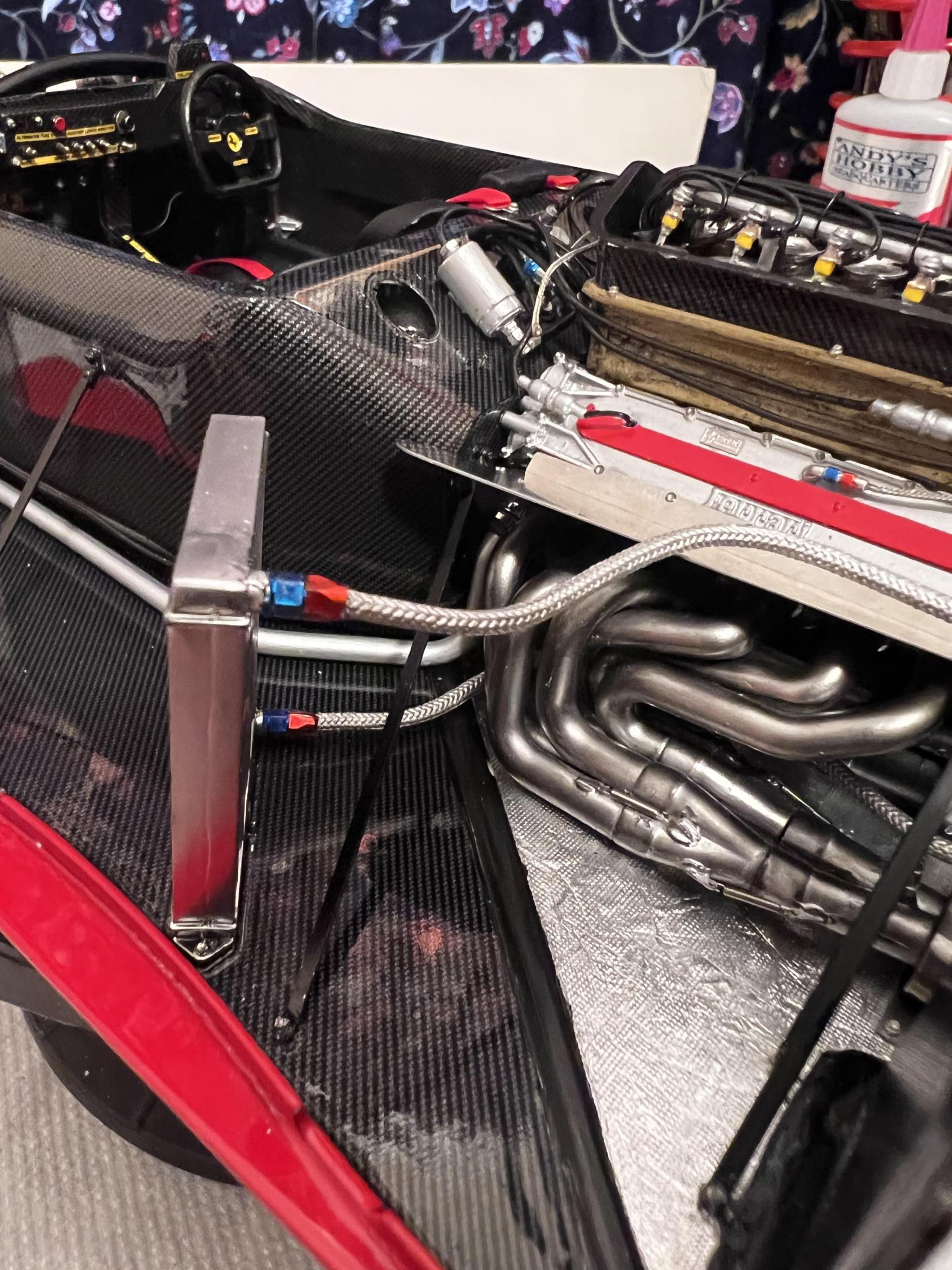 So now that the lotus is finished and I am back to the Ferrari! I managed to get the gearbox attached some support bracing and a bunch of little detail parts on. The side oil coolers also installed. Now onto the body panels ? -