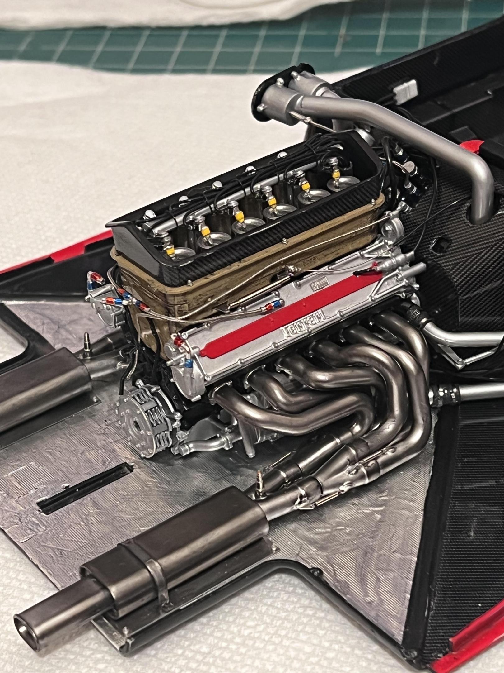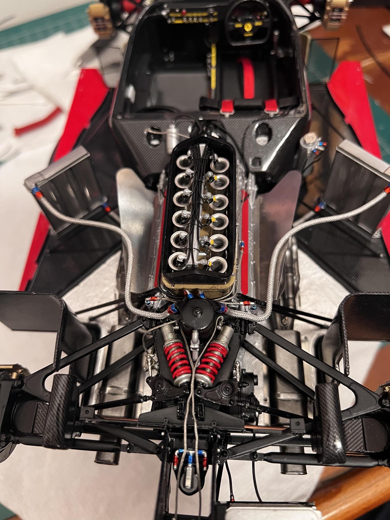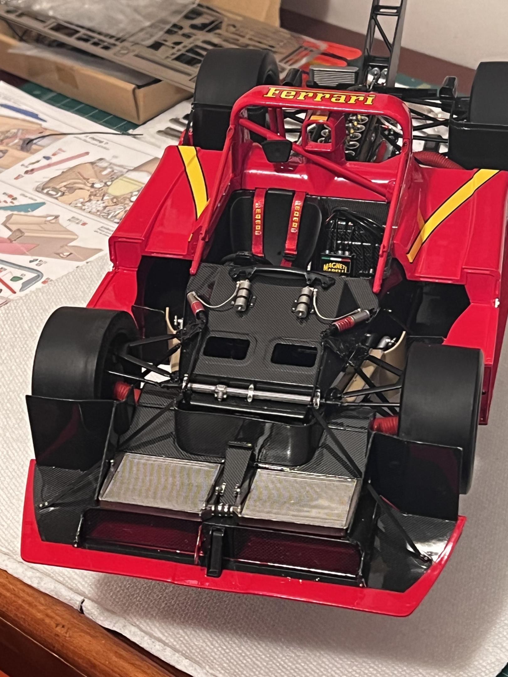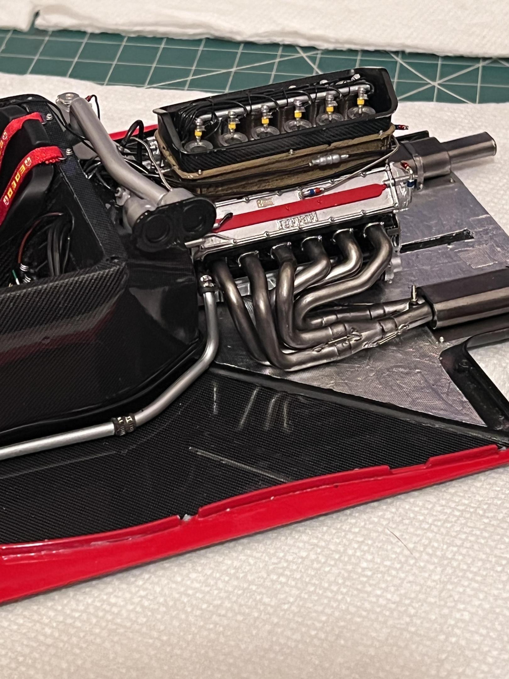 So now that the lotus is finished and I am back to the Ferrari! I managed to get the gearbox attached some support bracing and a bunch of little detail parts on. The side oil coolers also installed. Now onto the body panels ? -