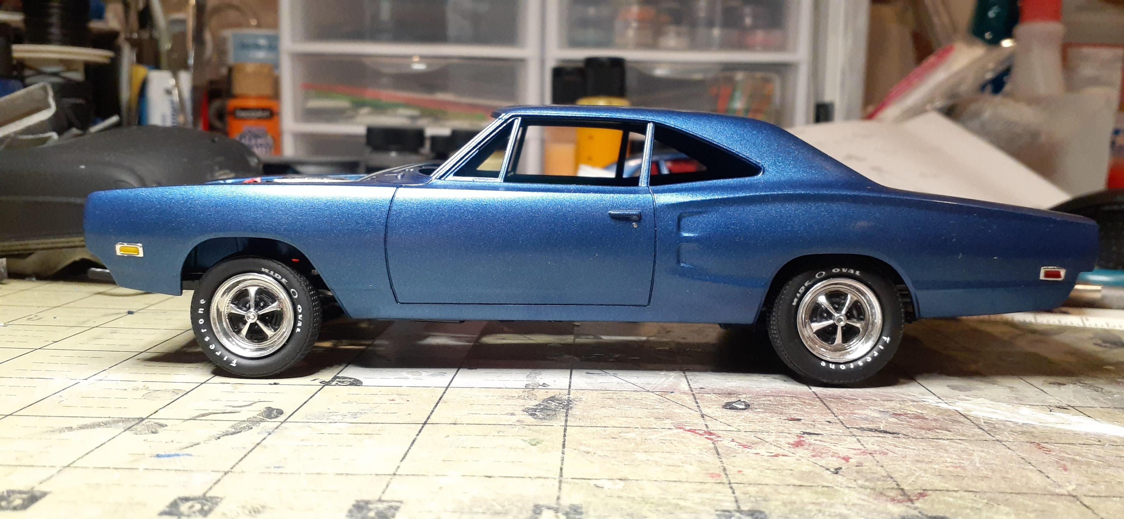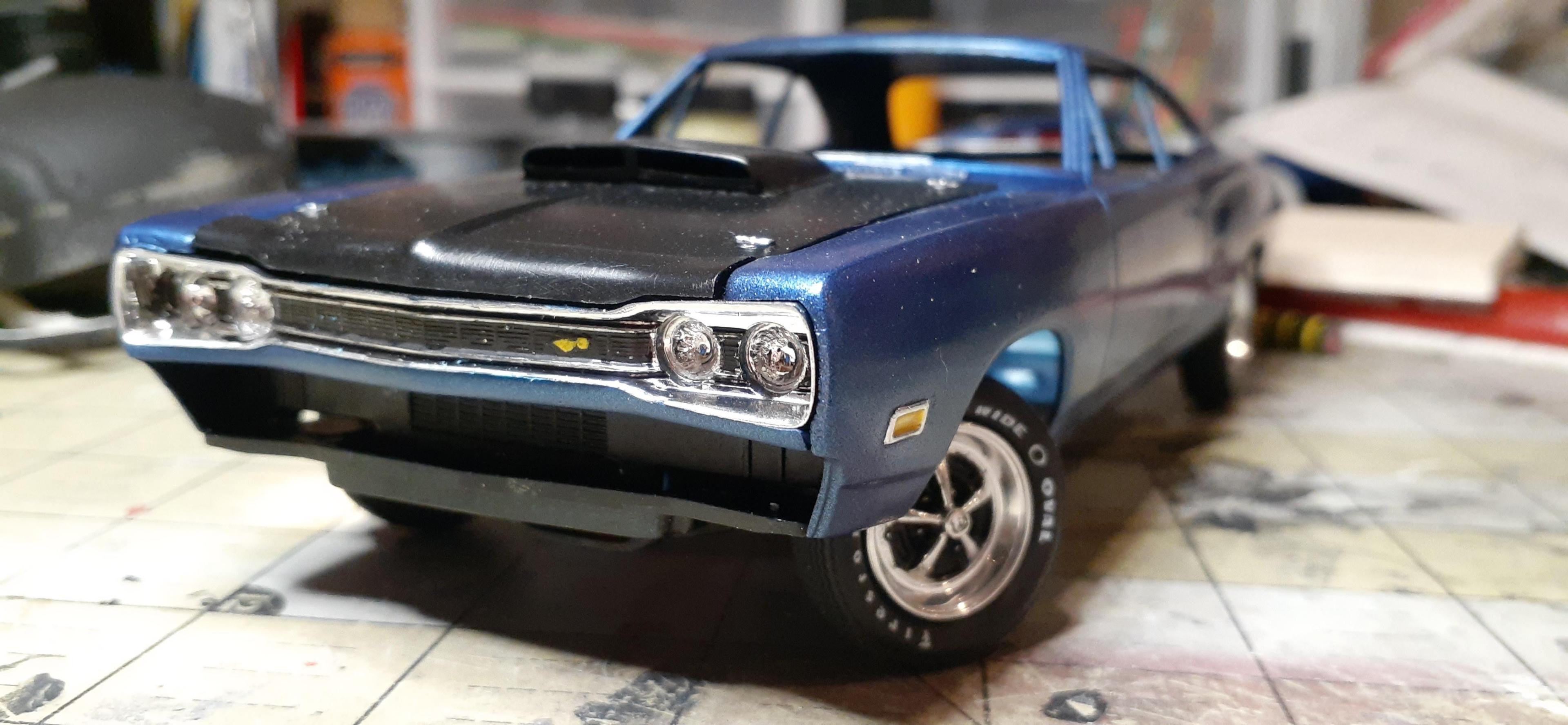 I picked this one up already built at a show last month. The body was painted a God-awful medium green. The interior was black with green stripes. When I saw the box, it brought me back to my teen years and I had to have it no matter what it looked like. It appeared to all be there so I went for it. The guy was asking 15 and I talked him down to 10. I took it home and began to put my stink on it. I stripped everything and began the transformation. The rims weren't too bad but I did replace the tires with the AMT aftermarket preprinted Firestones. I kept the interior color, just gave it a respray. I detailed the dash and door cards with the chrome pen. I foiled the window trim and side markers and detailed the grill and tail piece. I wired the engine and added a fuel line, carburetor linkage, return spring, throttle cable and heater hoses. Also detailed the master cylinder by adding a couple curlies. Sorry to disappoint Rusty, I didnt get to moving the rears. It really doesnt bother me that much. One day... I've always liked the way the 69 and 70 Coronet and the 67 Fury looks. They have that scowl that says "Get out of my way!". This was a fun rebuild. Thanks for looking.