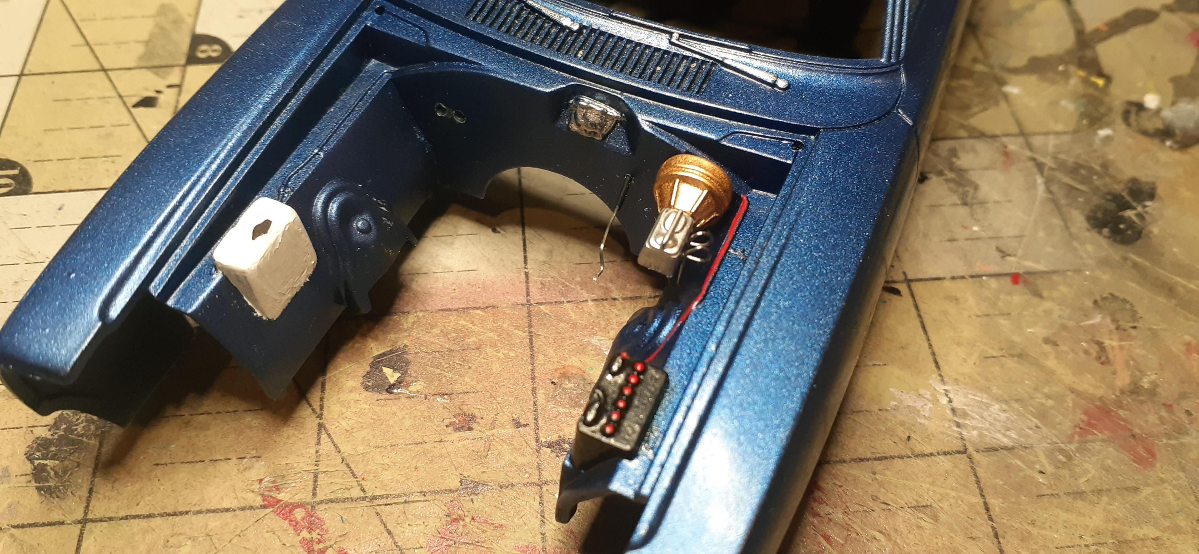Got the rest of the body buffed out as best as I could and did some under hood detailing. Drilled holes for the heater hoses and throttle cable. Inserted a throttle cable, painted up the washer bottle, battery and cables. And added some brake line curlies to the master cylinder. Next I'll add foil to the trim.