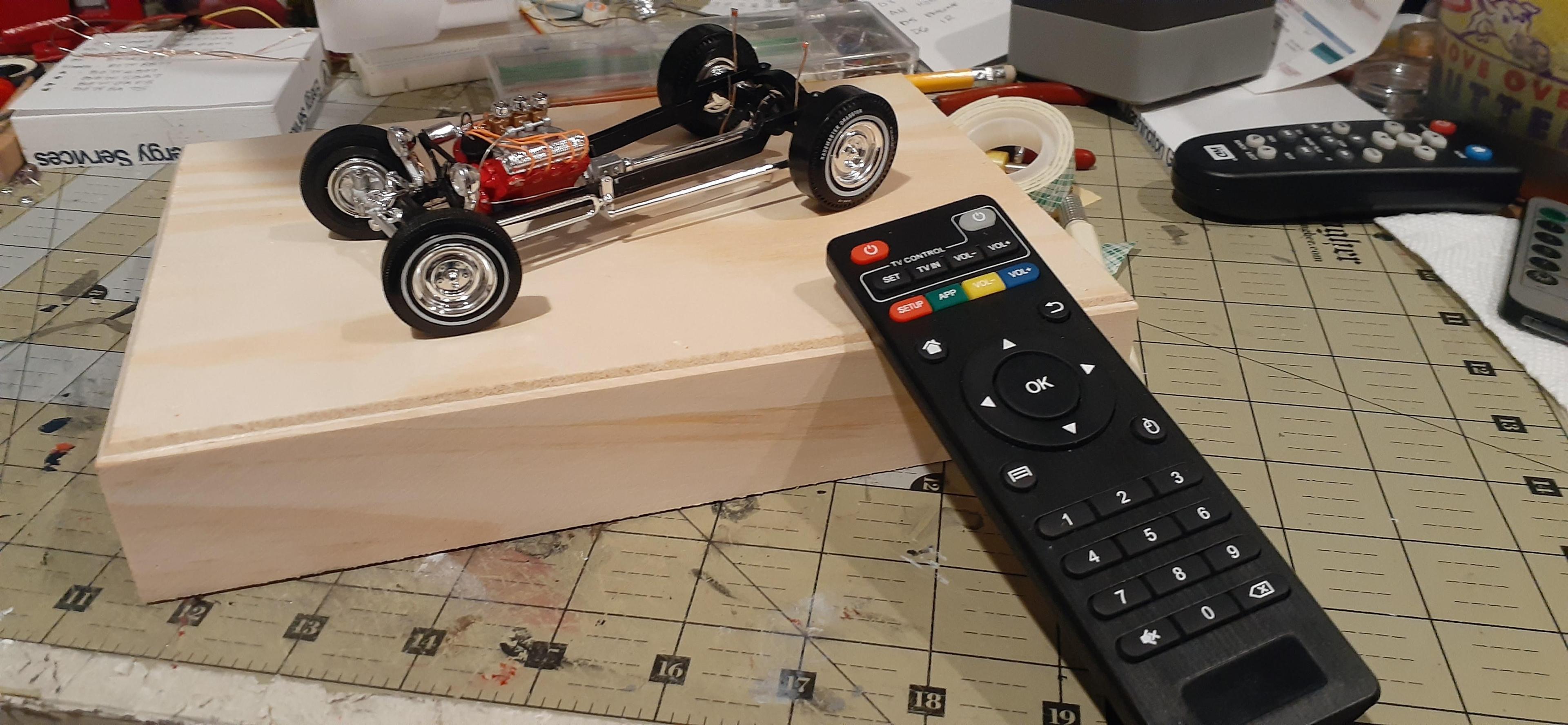 I picked this up a few weeks ago from our new Hobby Lobby. Lately I've really been into building prewar cars. There wasn't a whole lot to this kit but it did contain 2 complete cars. At first I bought it because of the coupe on the box top. But after I finished the frame, I started looking at the bucket body. I used the mini truck bed opposed to the turtle shell option. Mainly because I thought it would accommodate the taillights better. The body was painted with acrylic craft paint and the clear was minwax poly. The most difficult part wasn't the electronics but fishing the wires thru the base to feed the circuit. I really enjoyed building this one. I may build another one but next time have it closer to the ground I could have went all out and have crazy sounds and complete wackiness with the lights but I kept it mild and classy. The mini lights came from Amazon and the base was a wooden display box from Michael's. Showing the fan spinning here. The electronics consists of a mini Arduino, 4 lights, a buzzer for the horn, a 9v battery, jumper wires, an old remote control and of course the mini motor for the engine fan. How the sausage was made here Thanks for looking