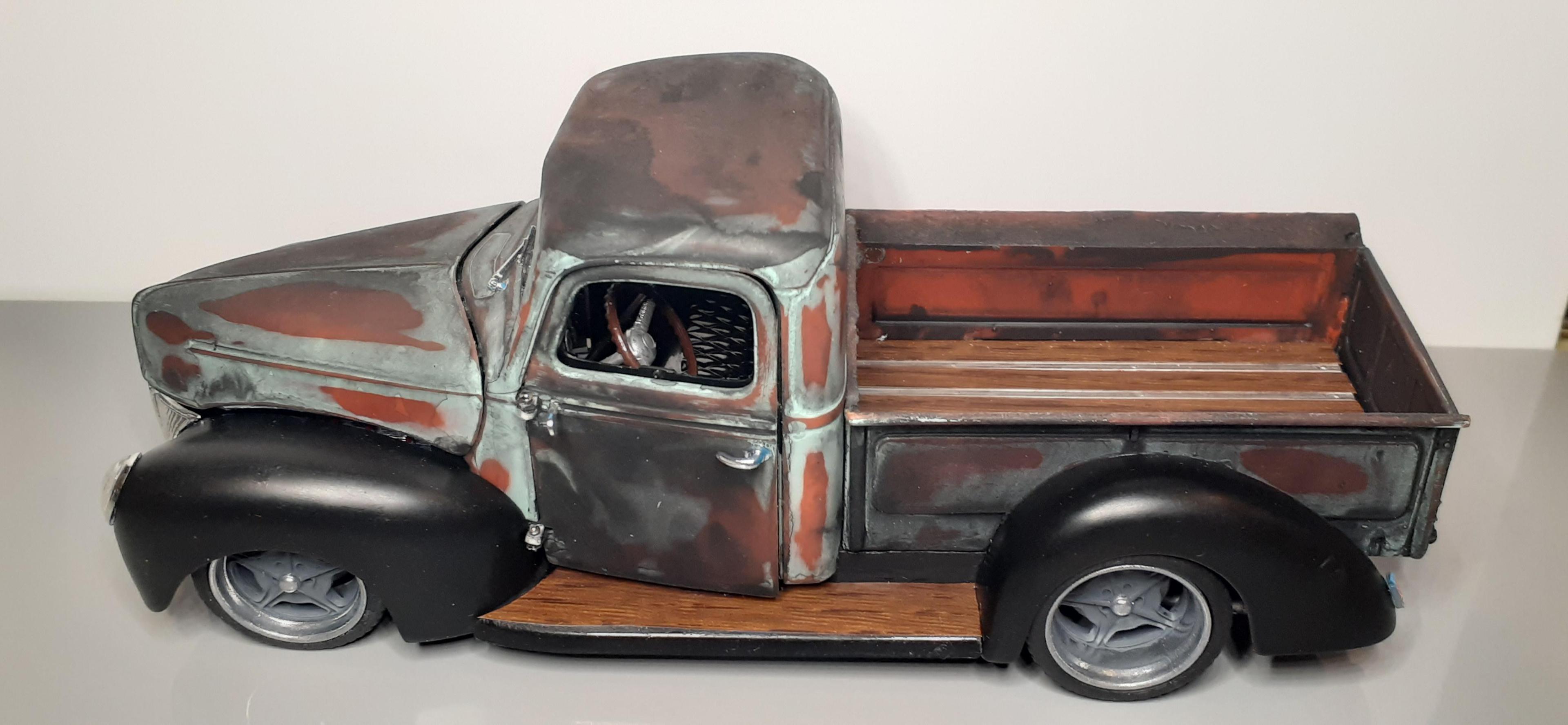 My inspiration is this... I know, it's a '36. The paint is olive green with a little black mixed in. The body was then sprayed with Krylon matte clear. I managed to detail up the headlight buckets and running boards and install them The frame is just about done without the suspension. Engine is painted up and partially assembled. I guess next I'll finish up the engine and set the ride height and work on the suspension Painted up the headers and exhaust I brush painted the air filter and taillight assemblies because I was too lazy to shoot 2 smalls. It wasn't worth it to me to spray them and clean the gun. The 2 red dots are the taillights. Stay Tuned...