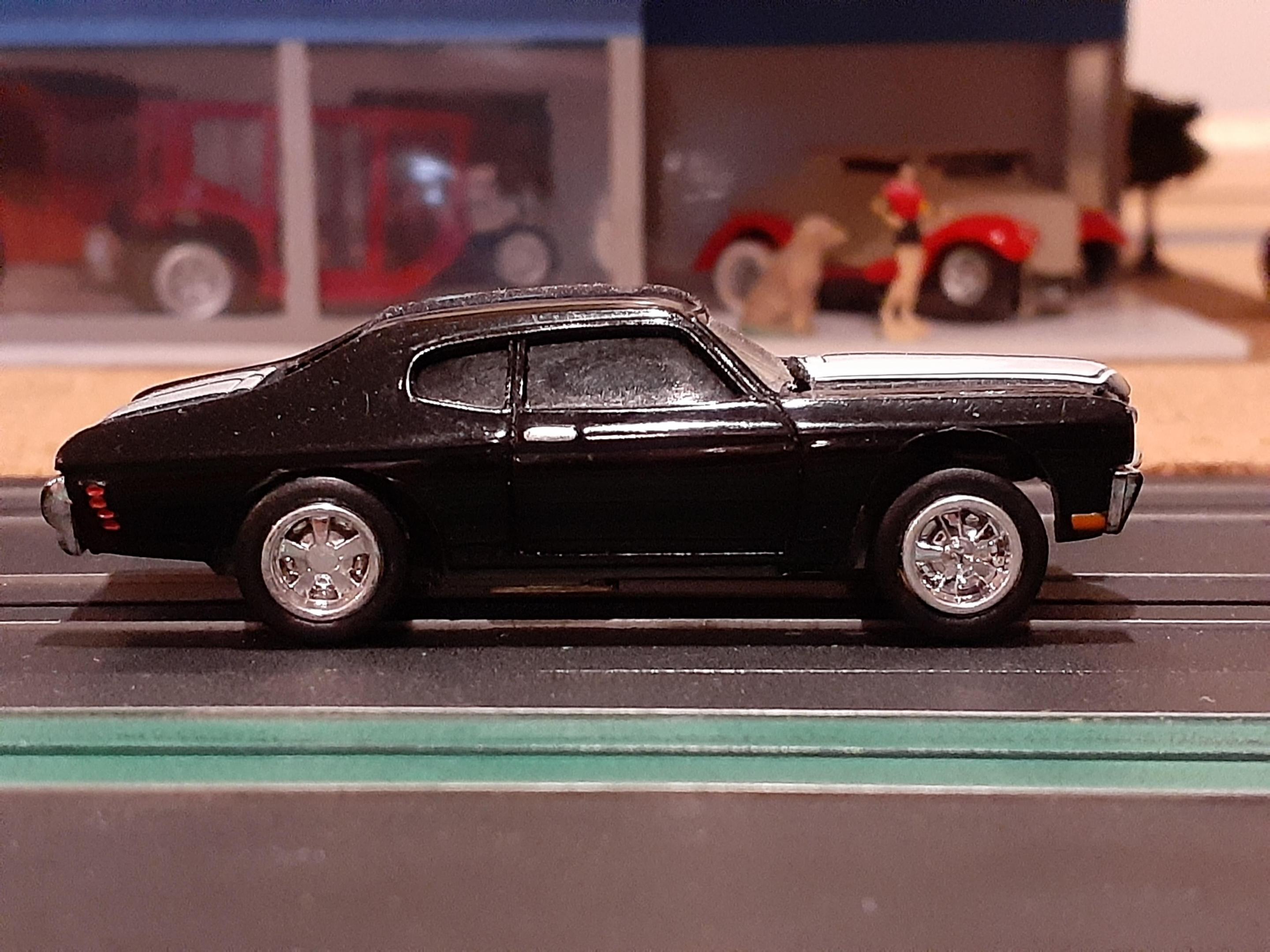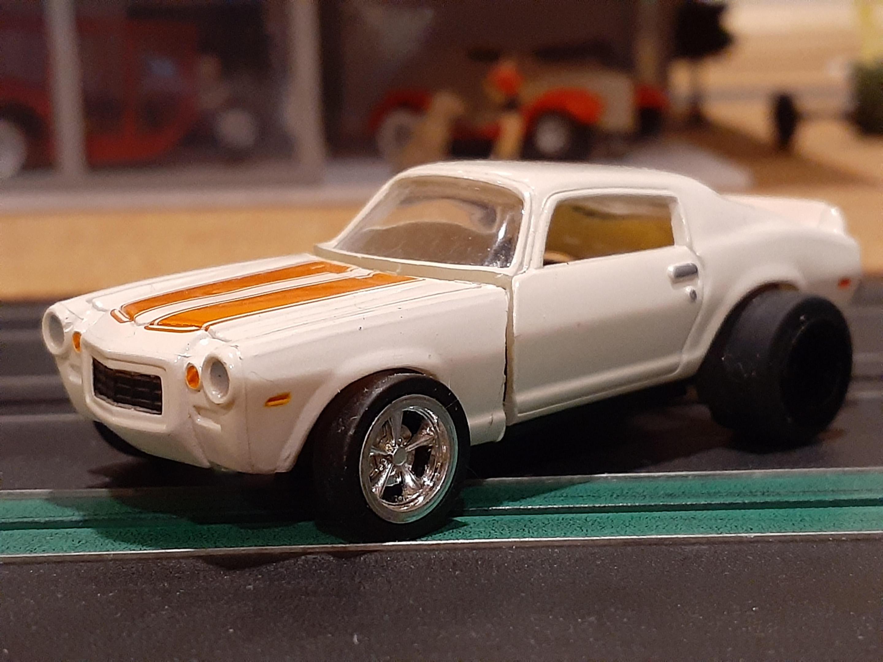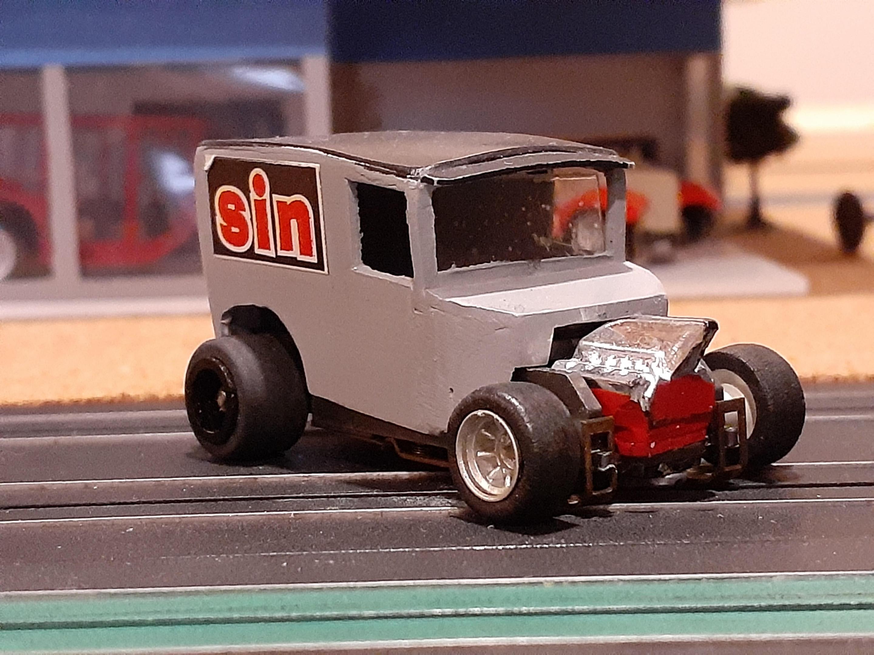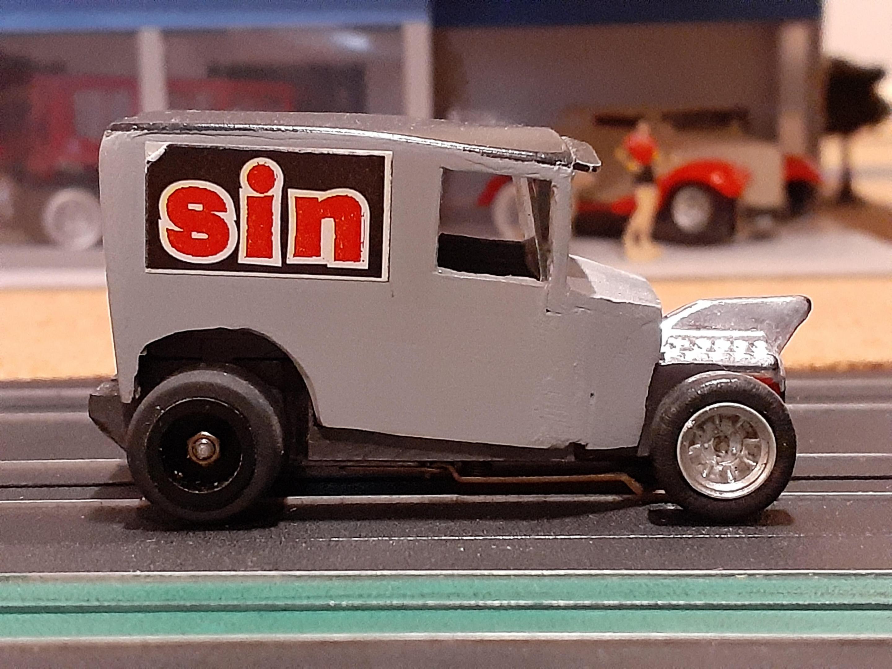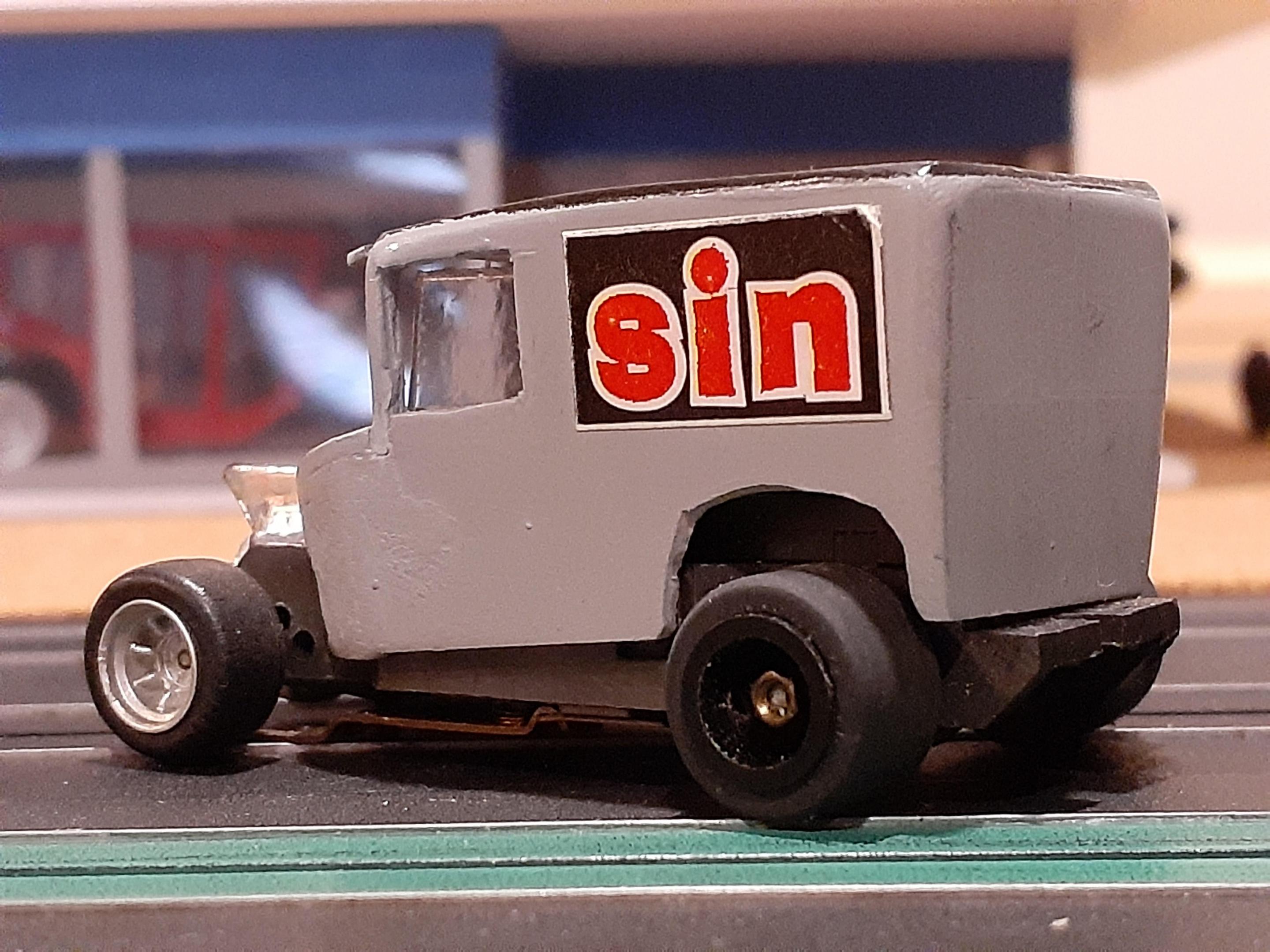 I made this with sheet styrene to fit an Aurora ThunderJet chassis. The Sin stickers are courtesy of my daughters Sunday School.