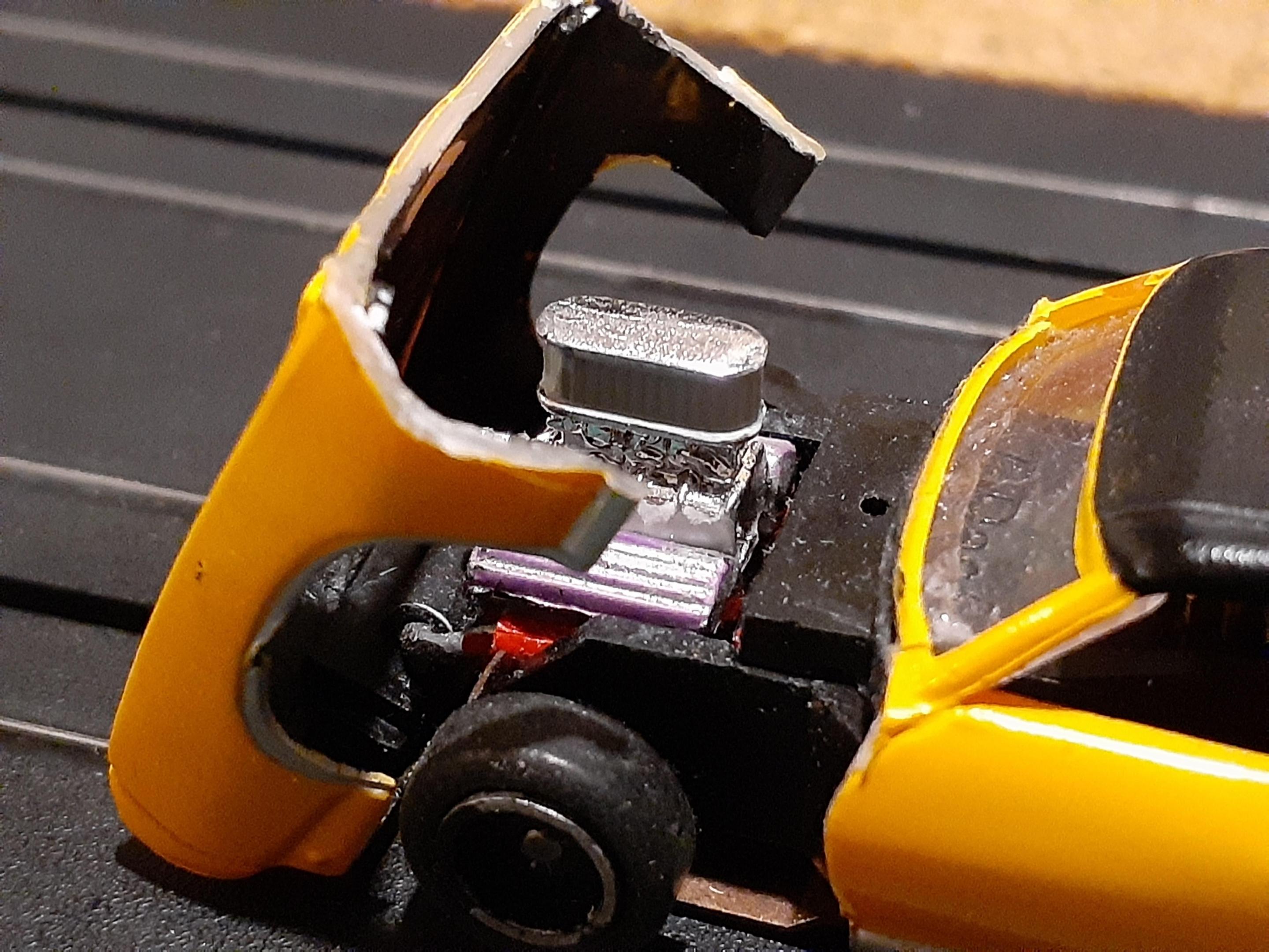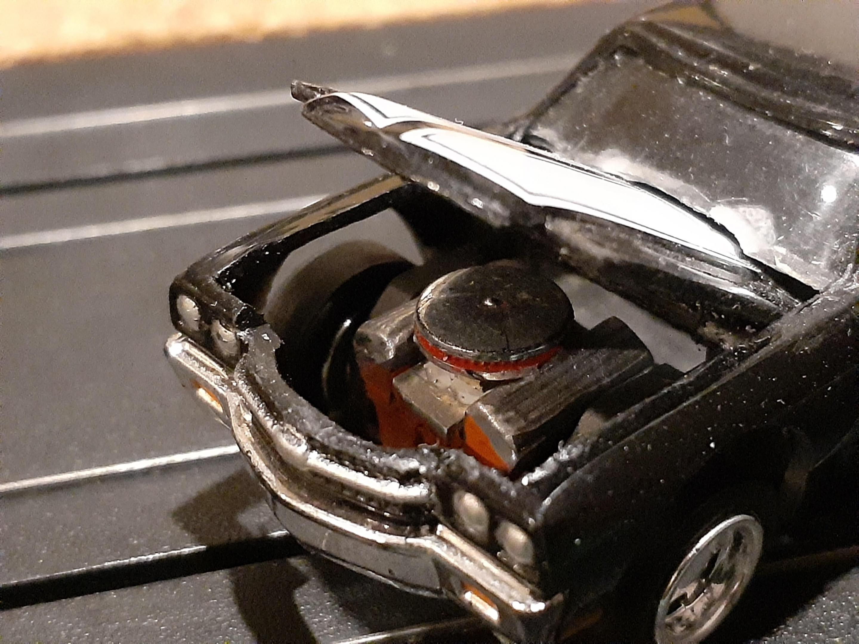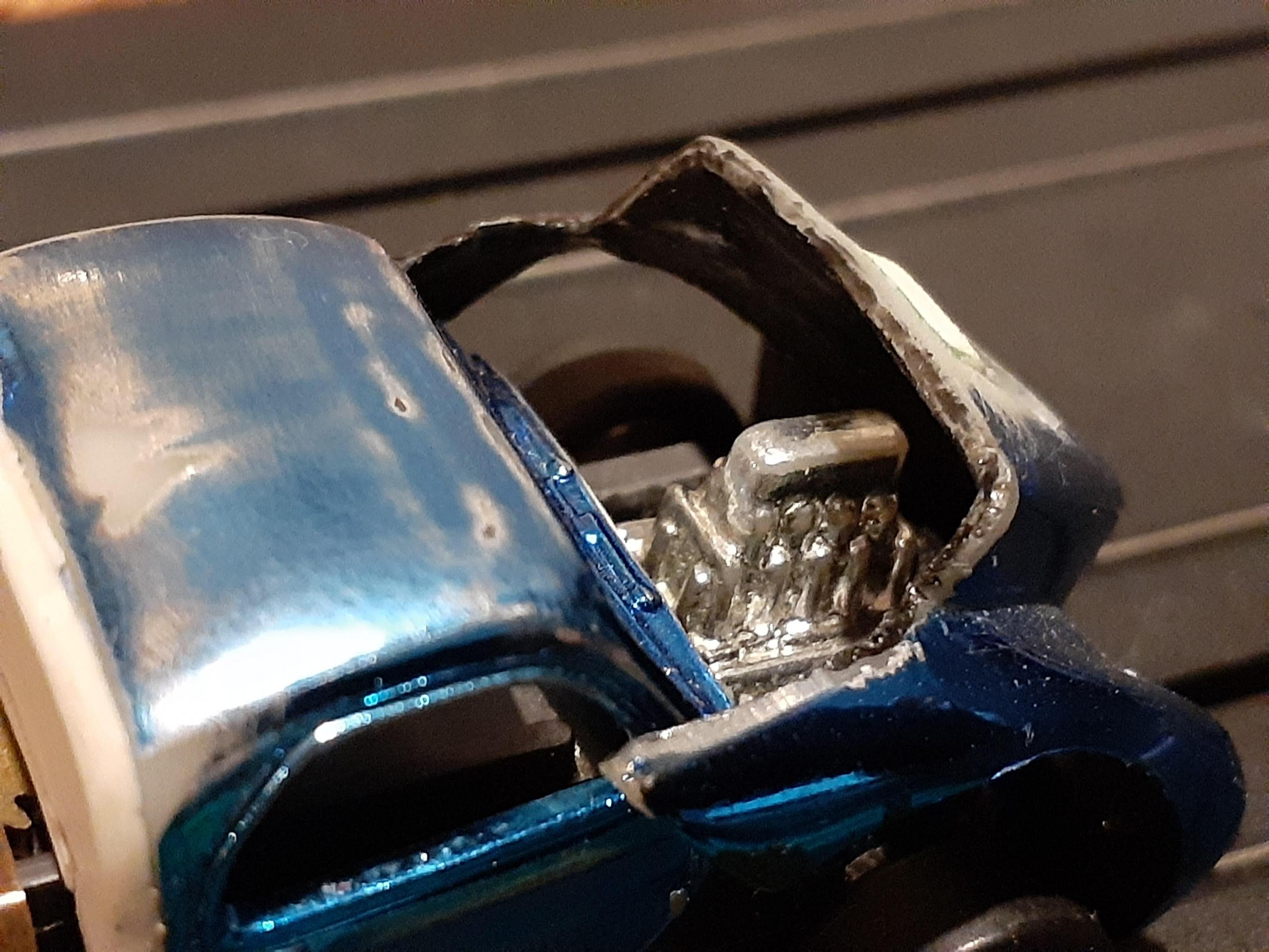 This was one of those Johnny Lightning pull back cars from the early 2000s. I carefully trimmed off the hood and added a hinge and a big block motor.