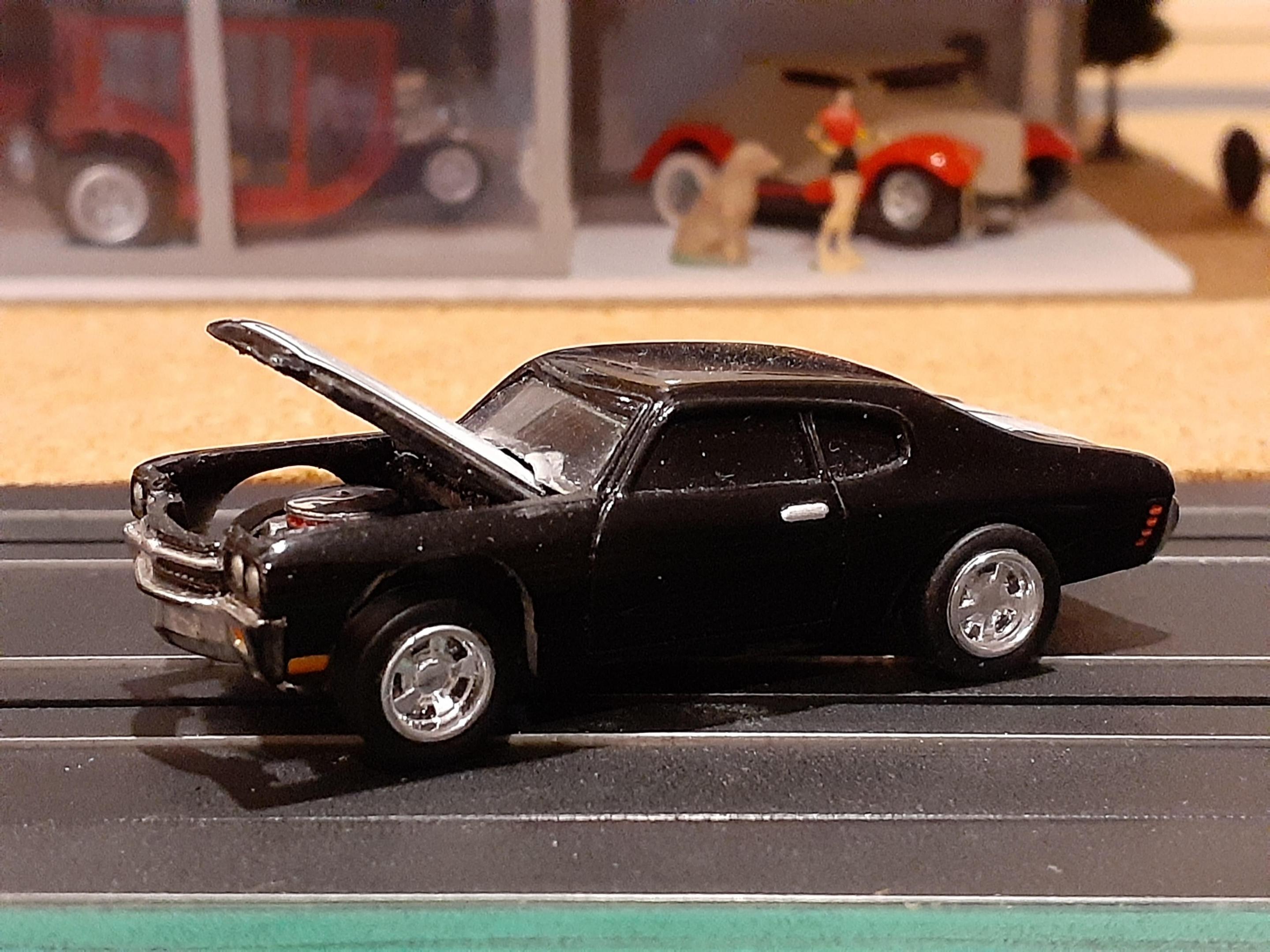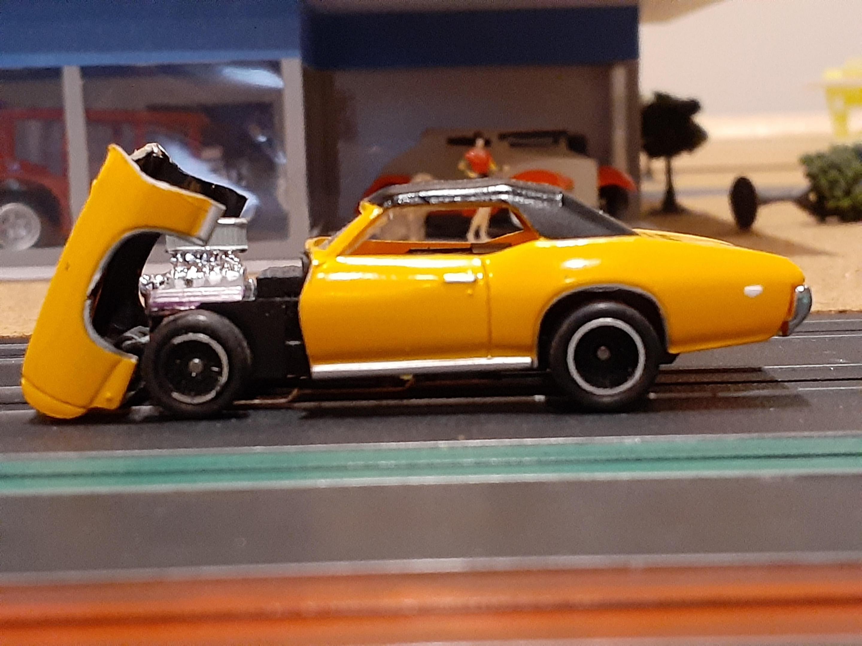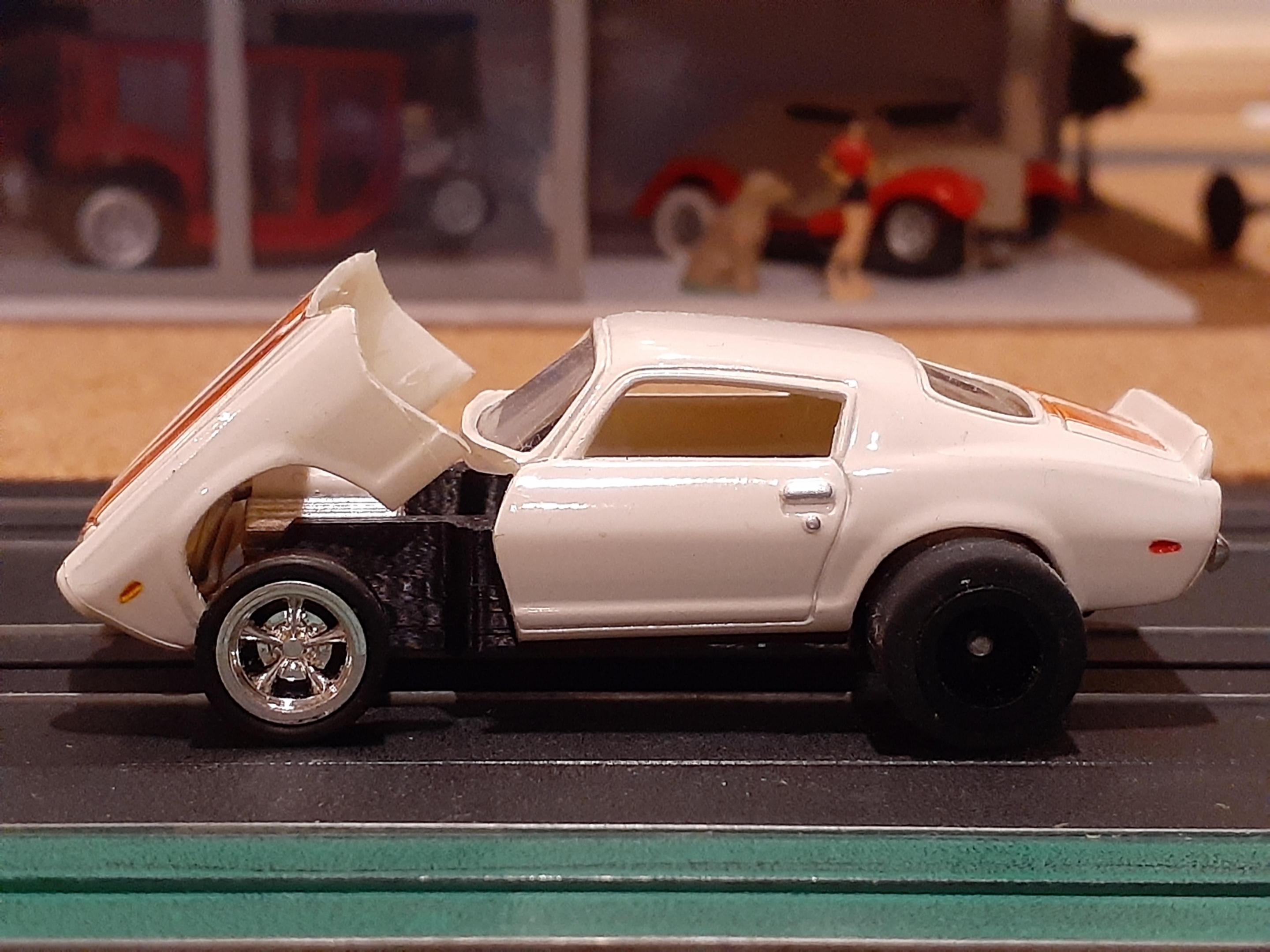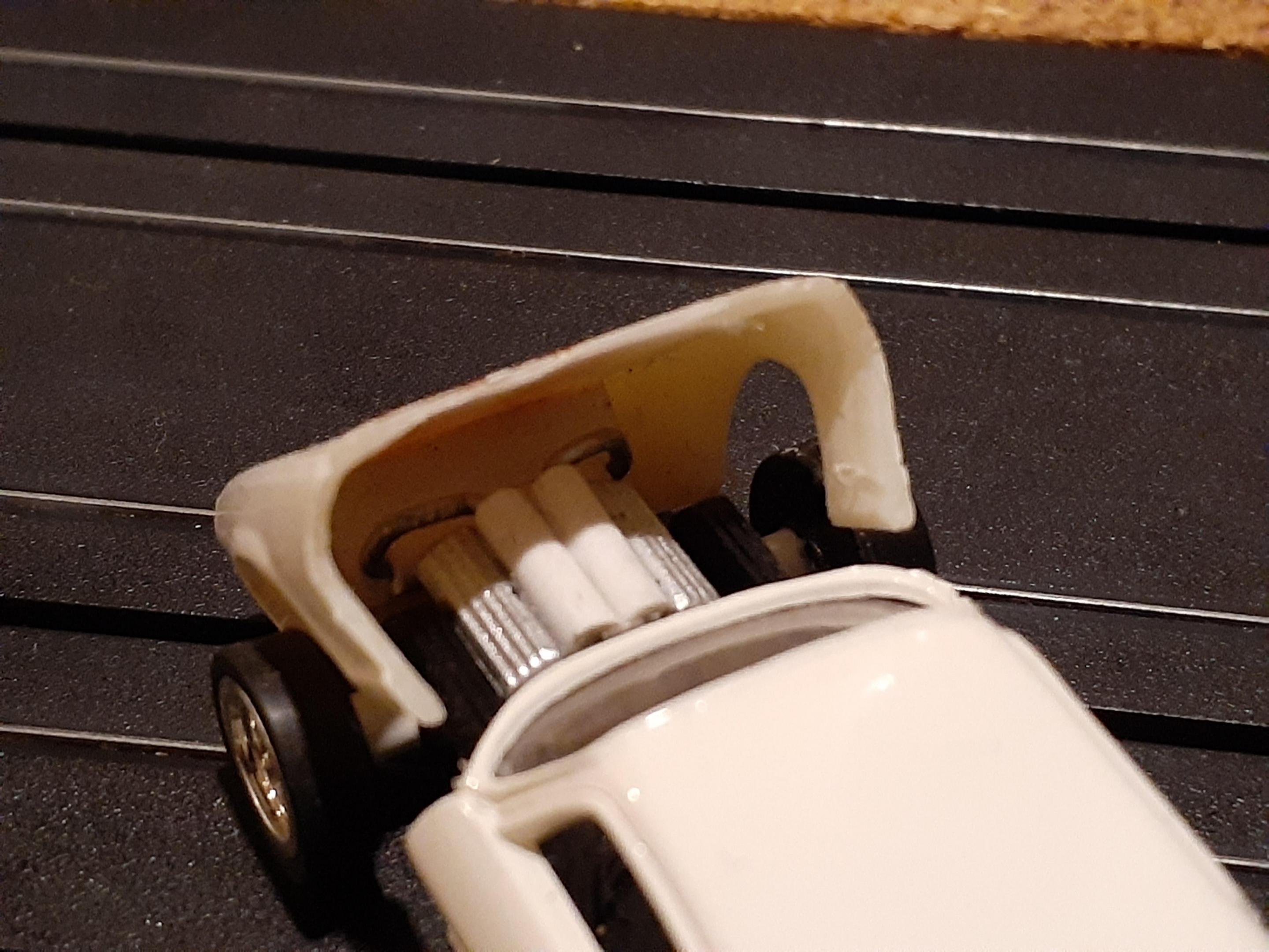 This was one of those Johnny Lightning pull back cars from the early 2000s. I carefully trimmed off the hood and added a hinge and a big block motor.
