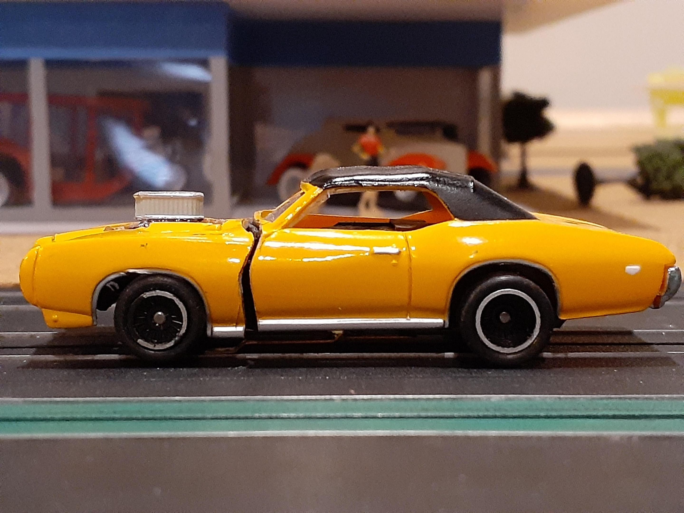 This was originally one of those Johnnt Lightning pull backs from the early 2000s. I cut off the back half and melted in the roof and sail panels. The tonneau cover is sheet styrene. the rear window is from this car just squashed a little.