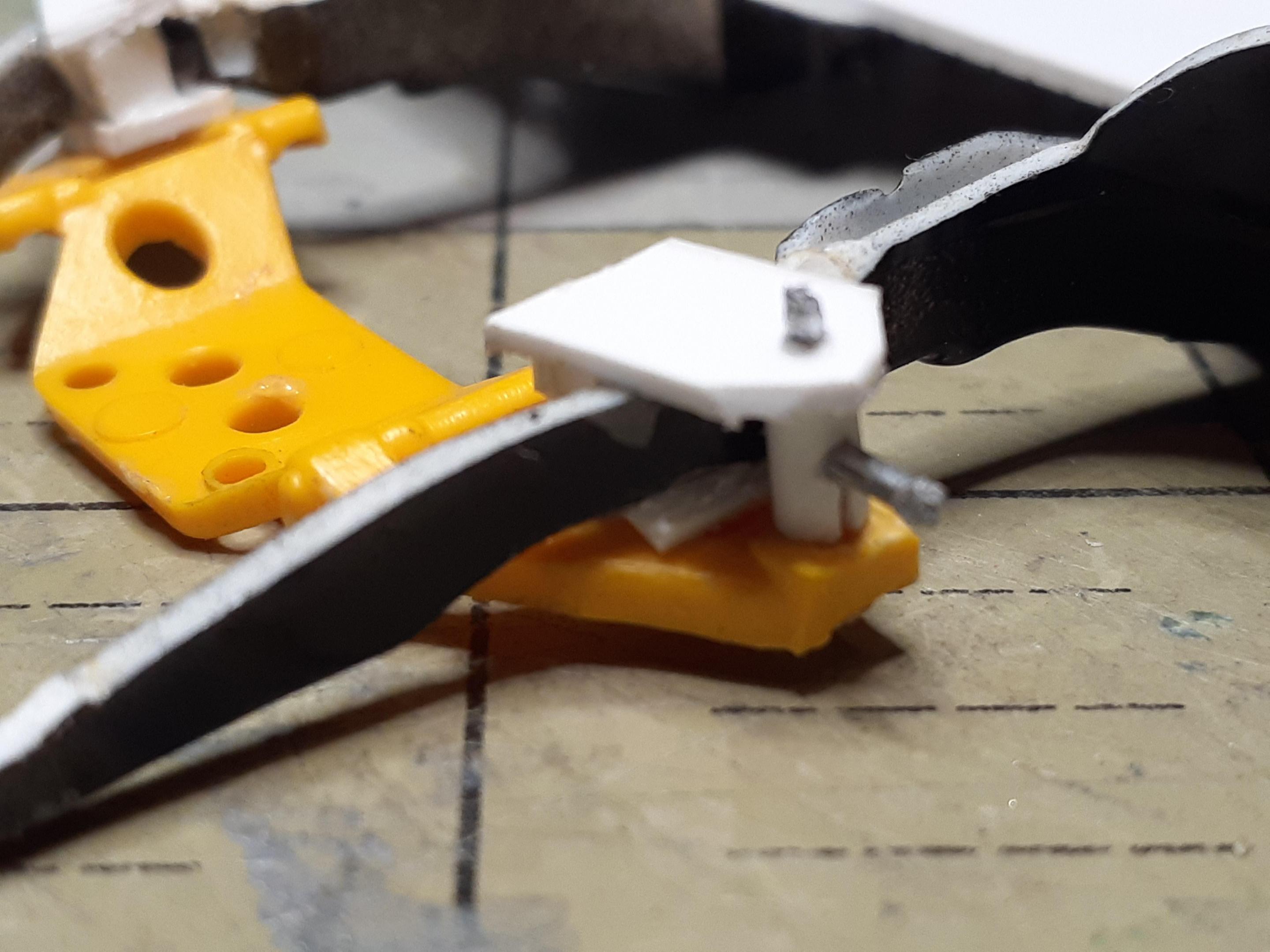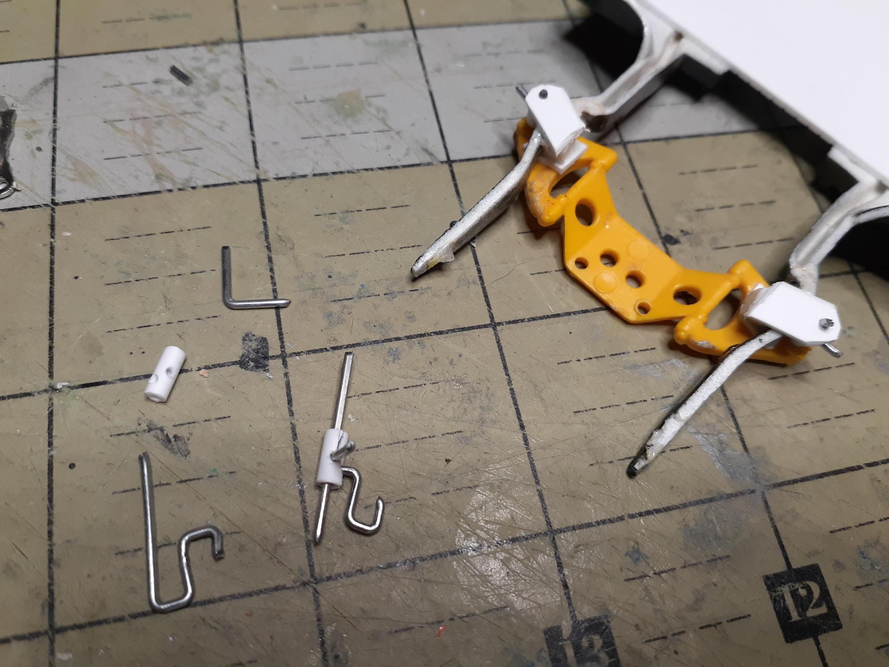 This occurred to me while driving home on Sunday from Pennsylvania. If you take some small tubing, drill some holes in it and cut slits to the holes, you could essentially slide 2 bent paper clips thru to create spindles. Shown here in place is the tubing and paper clip assembly wedged between the lower control arm and a fabricated upper control arm. This will allow the front wheels to turn. After I built the contraption it occurred to me that if you make a few extra bends, you could get the wheels to turn in sync. You would connect them with yet another bent paper clip. This creates a sort of tie rod. On this one will have to have the ends rounded to fit over the hooked lower region. It worked for me. Your mileage may vary.