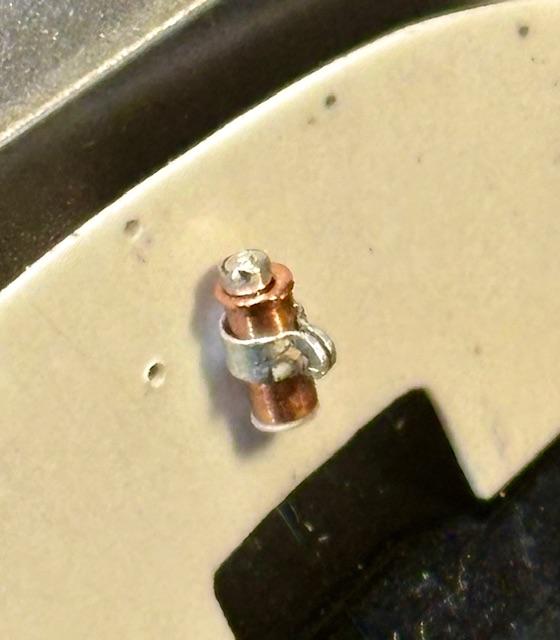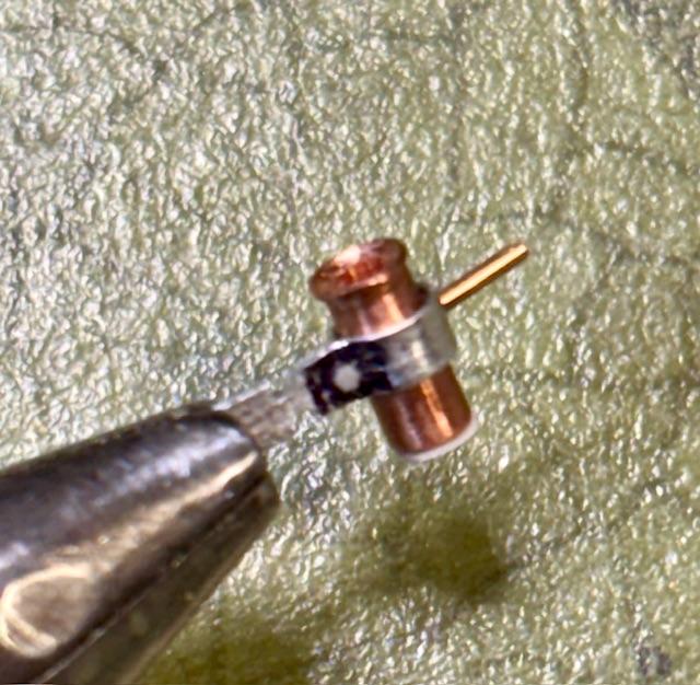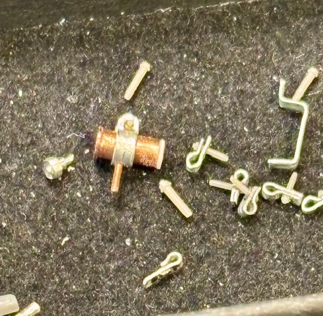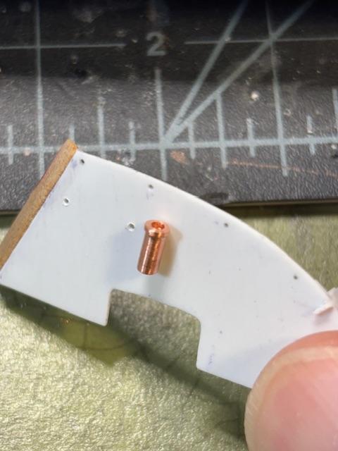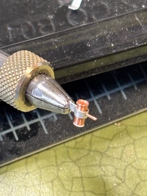 7. The brake fluid bottle is attached to the left panel - made from some copper scrap tube and a length of crushed alu tube for the bracket - the cap is turned from alu stock - the bottle will be painted fl black -