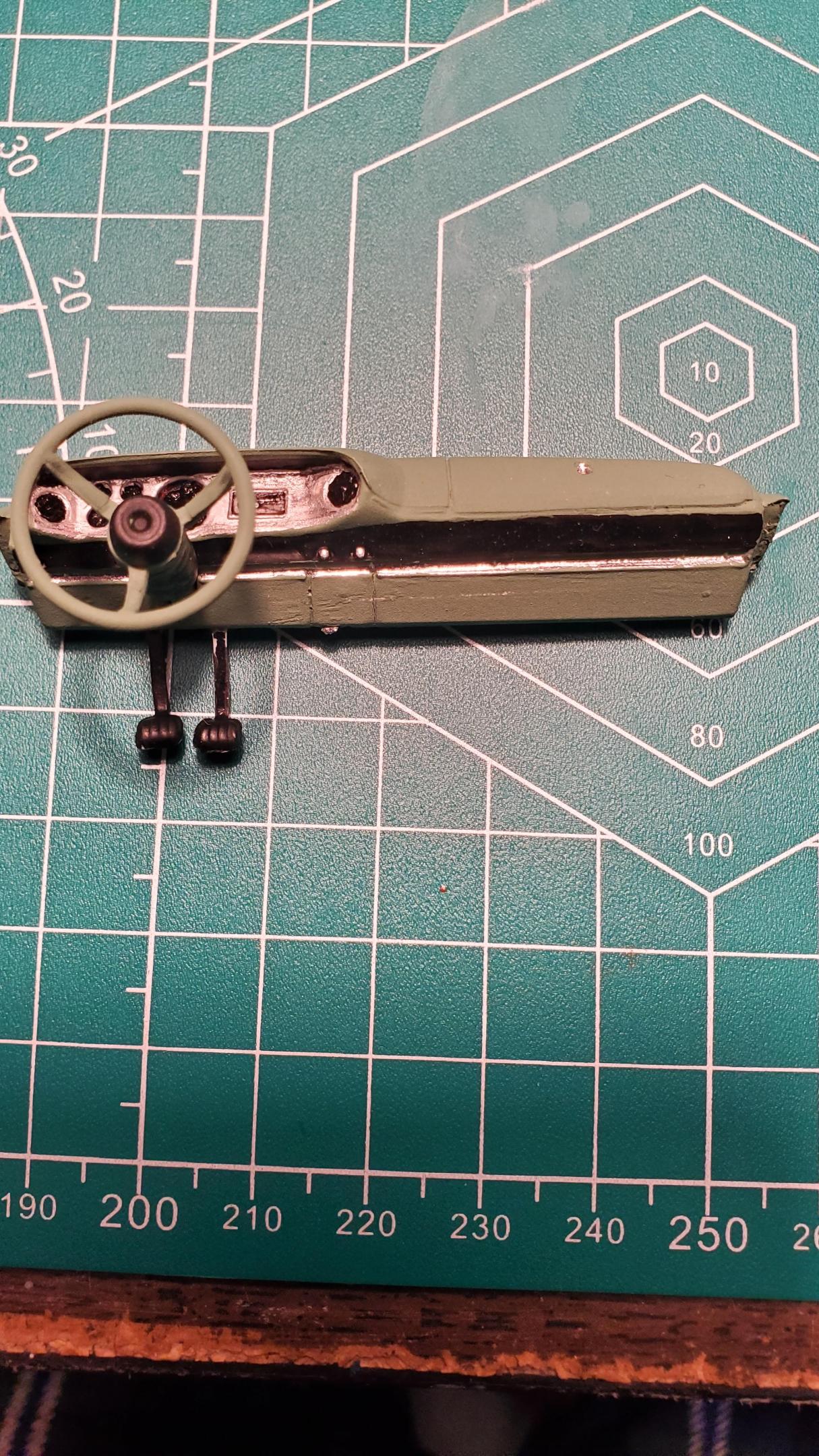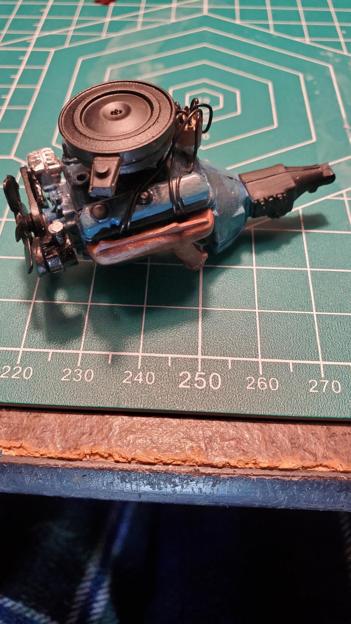 I got some painting done on the dash and steering wheel. Also the engine is detailed and ready to go in. I used the air cleaner from the '71 Charger with one snorkel removed. Fan and belts are original to the truck. The alternator is from the Revell '69 Dart. -