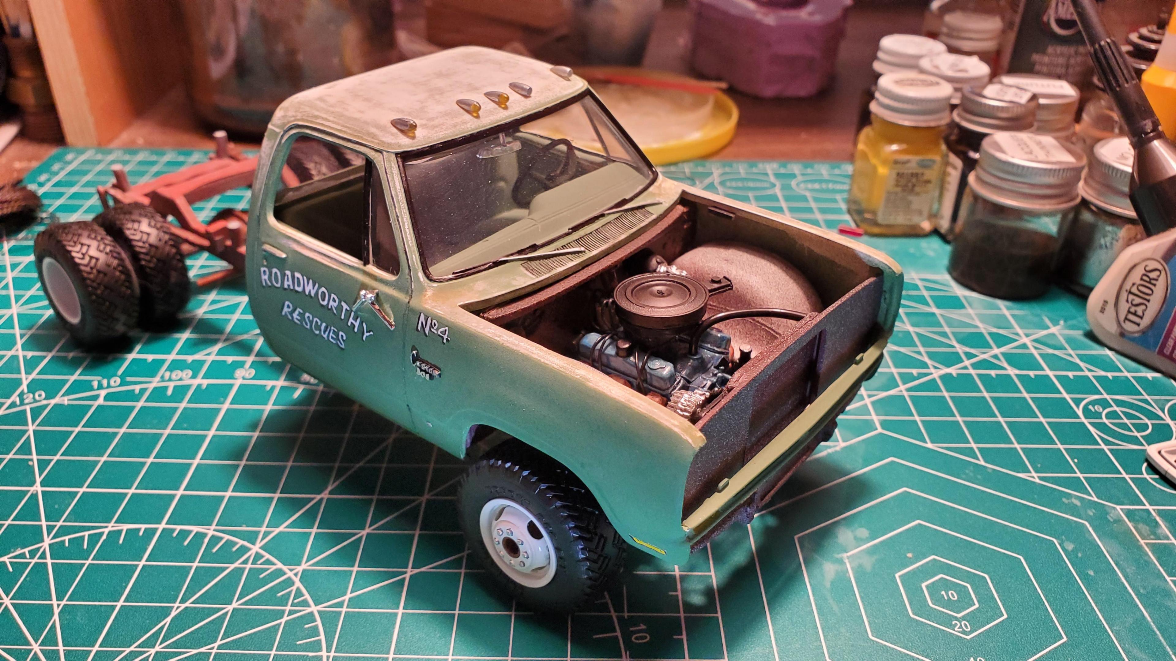 This is the '79 Dodge wrecker from the 2nd episode of Roadworthy Rescues on the Motor Trend channel. The base model is the MPC 77 Dodge W250. All that remains of the kit is the cab, interior, rear axle and springs, and front half of the chassis. The wrecker is mostly 3d printed, including the rear half of the frame, bed floor, bed sides, winch, frames and all towing hardware. The engine is from the AMT 340 Duster, with air cleaner from the AMT 71 Charger (one snorkel removed.) 2wd front suspension and crossmember is from the AMT Little Red Express. The '79 grille is 3d printed from my own design. The 1:1 has 2 broken cab marker lights, so I did the same. Paint is acrylic craft paint, sanded to reveal the primer underneath. Dually wheels are all 3d printed from my own design. The tires are cloned in resin from the (old) MPC Dodge Warlock kit. All the lettering is done by hand as I am not very good with decals. "Bring the Thunder" on the front bumper is not true to the 1:1 but I couldn't help myself! There is a build thread in the WIP section if you're interested. Hope you like!