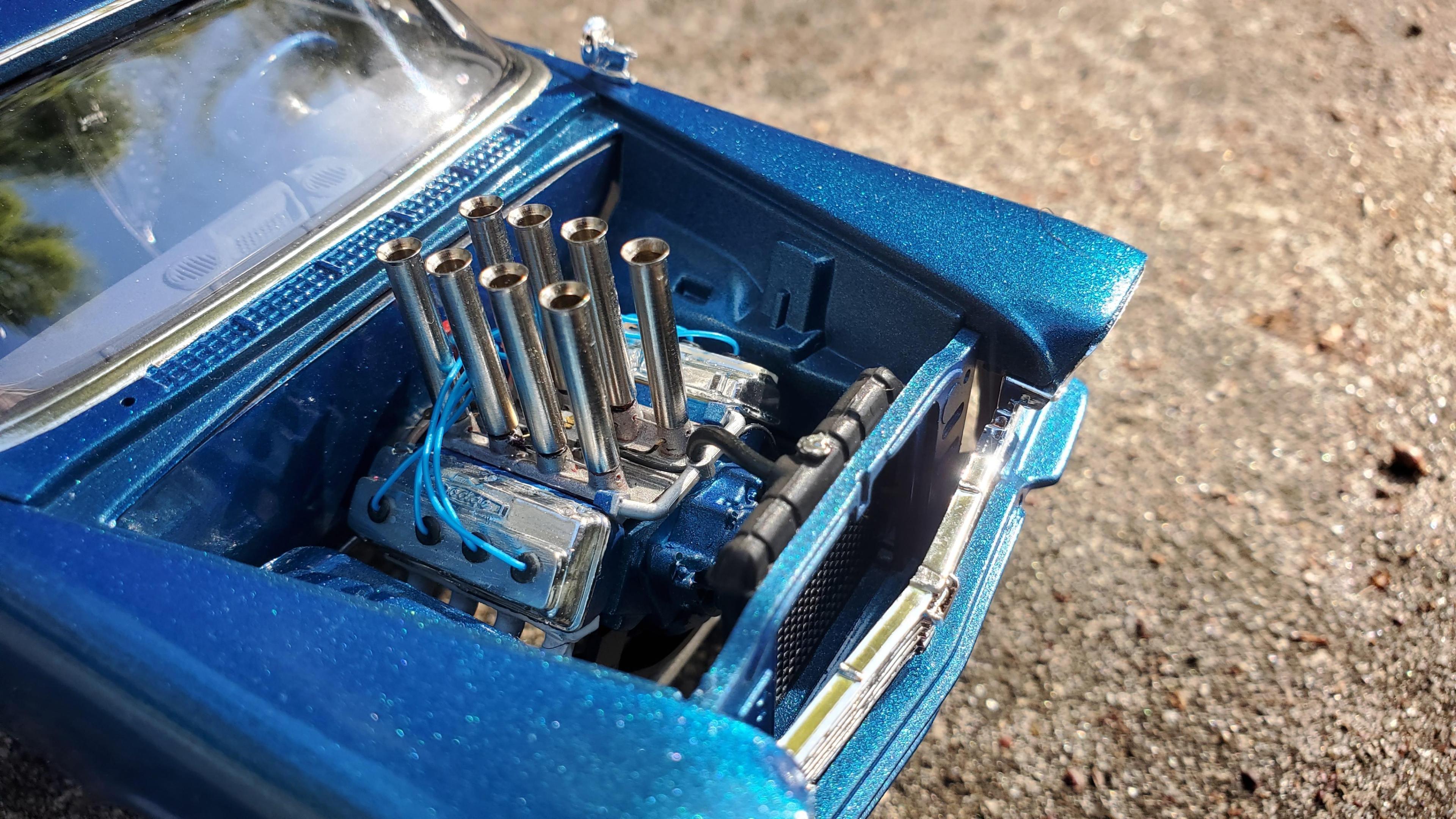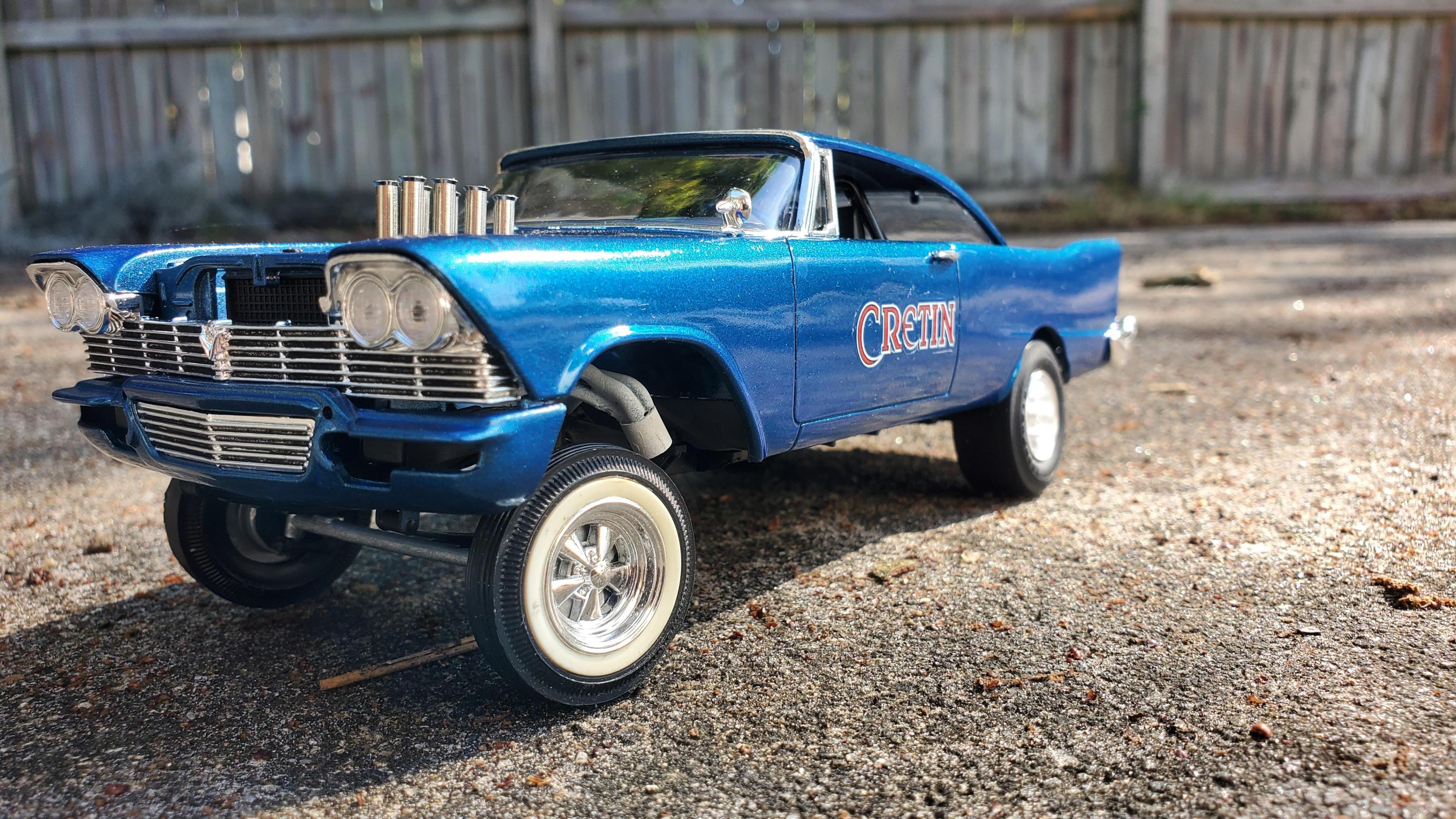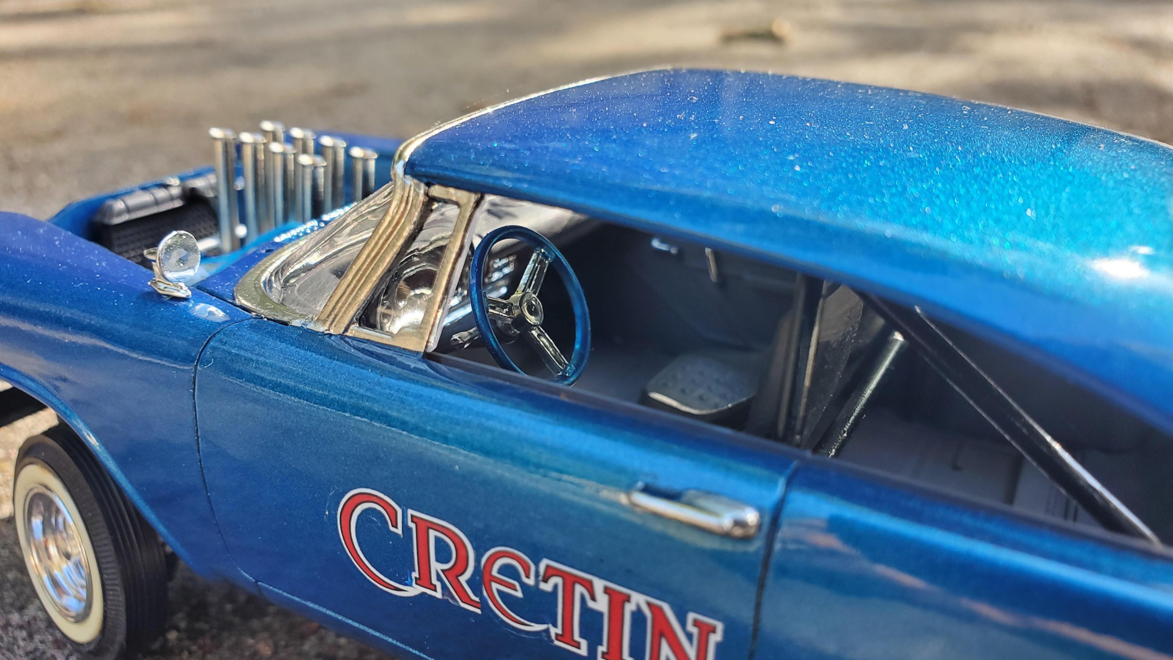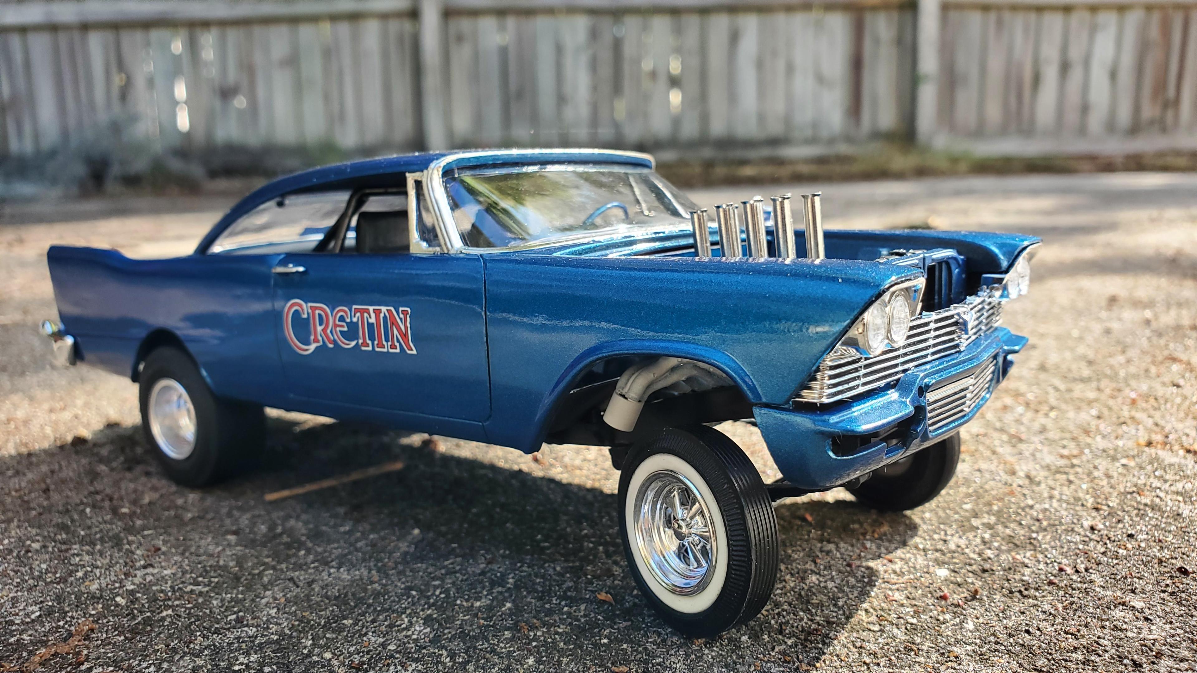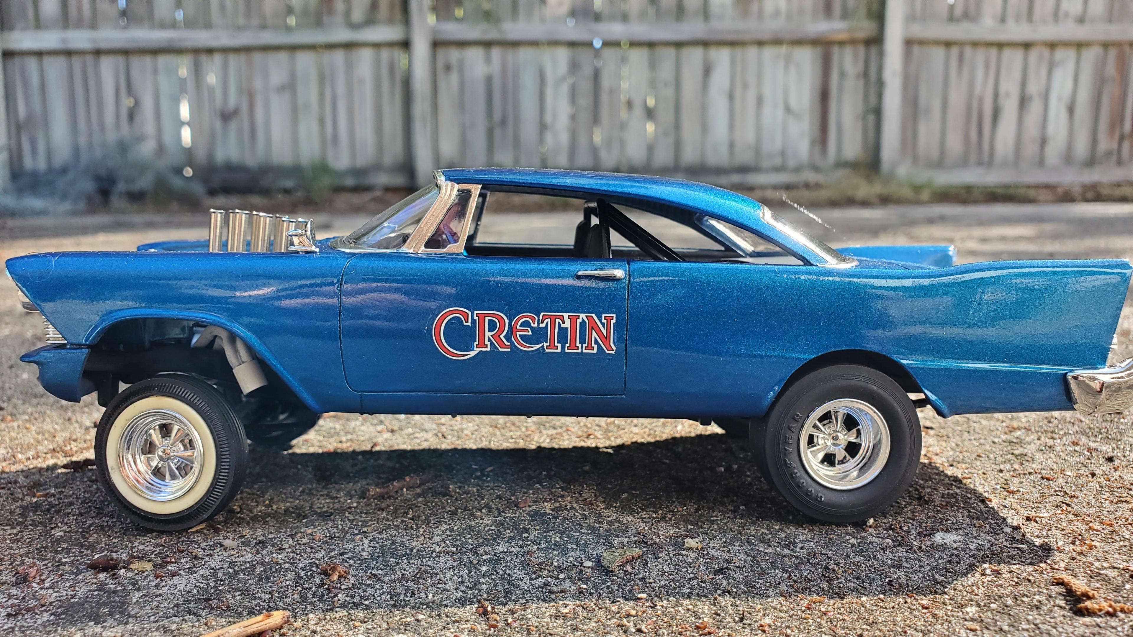 Got this one as a Christmas present. A member of our local model club asked me what I was going to do with all that chrome, and it made me think of stripping it down and making a gasser. It took me all of a football playoff game to sand off all the body chrome, which I guess would have been about half the time it would take to do all of the BMF! The paint is airbrushed Createx blue pearl covered with Duplicolor 1K clear, which seems to be a near foolproof combination. Decals are the "Christine" decals cut up to make "Cretin". The engine is cloned from the AMT Chrysler 392 hemi, but using Dodge rocker covers. Fuel injection stacks are Detail Master (I think) left over from another project. Parts box wheels and tires. Not too many 3d printed parts this time, just the front end components, gasser headers and the roll bar. Thanks for looking!