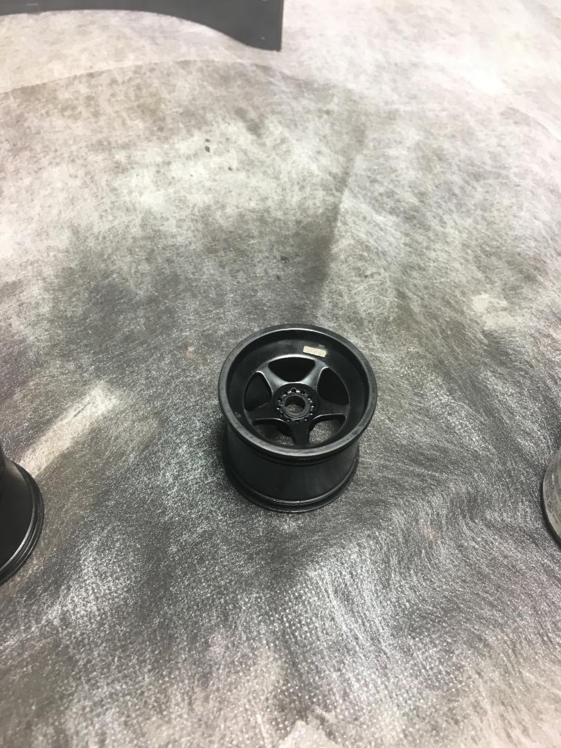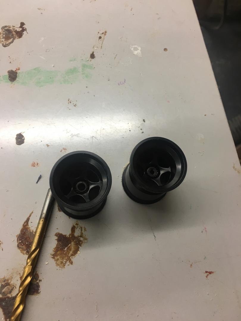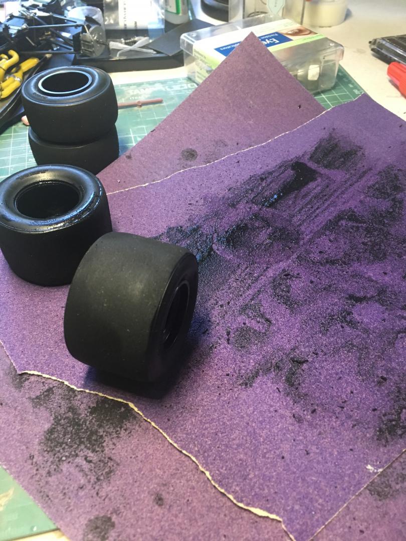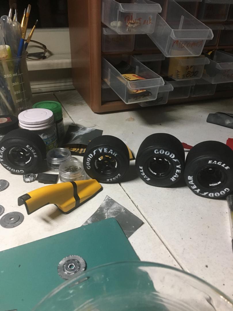 Thank you all for your welcomes! Sorry for the delay, but I am actually an MD/surgeon in training and will be rolling this out slowly by subassembly. I'm calling the wheels done. WHEELS: The perfect parts set above is an excellent improvement on the wheels and brakes. Specifically for the wheels, a 4 mm hole needed to be drilled through the center axle, then countersunk from the medial aspect with a 6 mm drill to accommodate the brake disk. For this, I need to have a perfectly centered drill, so I went to my local high school and borrowed the drill press for an hour to get perfectly parallel drilling. I wet sanded the tires using 200 grit sandpaper until the mold seams were no longer apparent. Before and after, left vs. right. 6 mm countersink Here I have attached the tires to the rims and applied decals. The stencils were painted using Tamiya fine primer through a 1/12 Goodyear stencil I managed to scavenge on eBay. The tires have yet to be weathered in the above picture. Wheels as finalized. I elected to weather the tires by scraping some paint away with a #11 blade and sanding lightly with 1000-grit sandpaper. I then applied thin layer of Tamiya X-19 smoke to de-whiten the logos. My camera is acting up today. CR