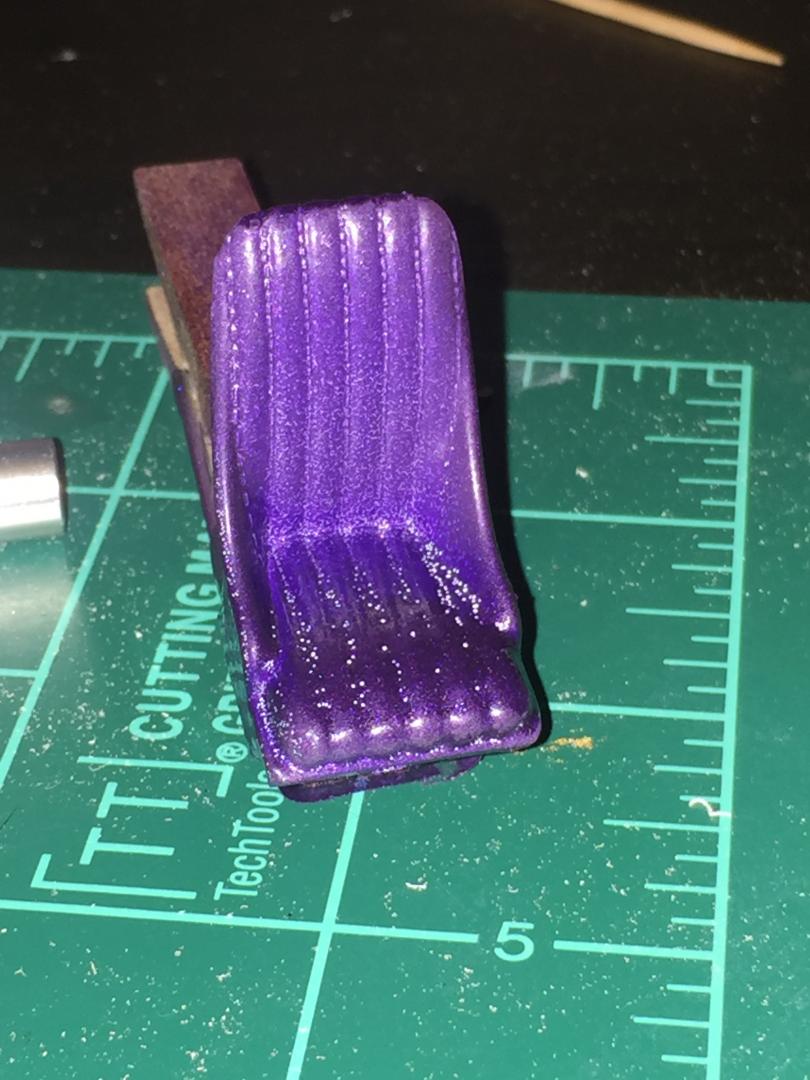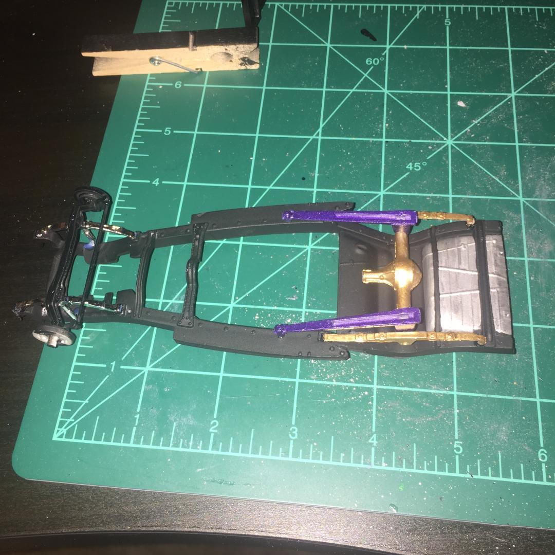 Final coats of paint finished before the clear coat is applied. Only going to have one bucket seat inside painted to match. Going with a purple and gold theme here. Mocking up the suspension under the frame to familiarize myself with the assembly.