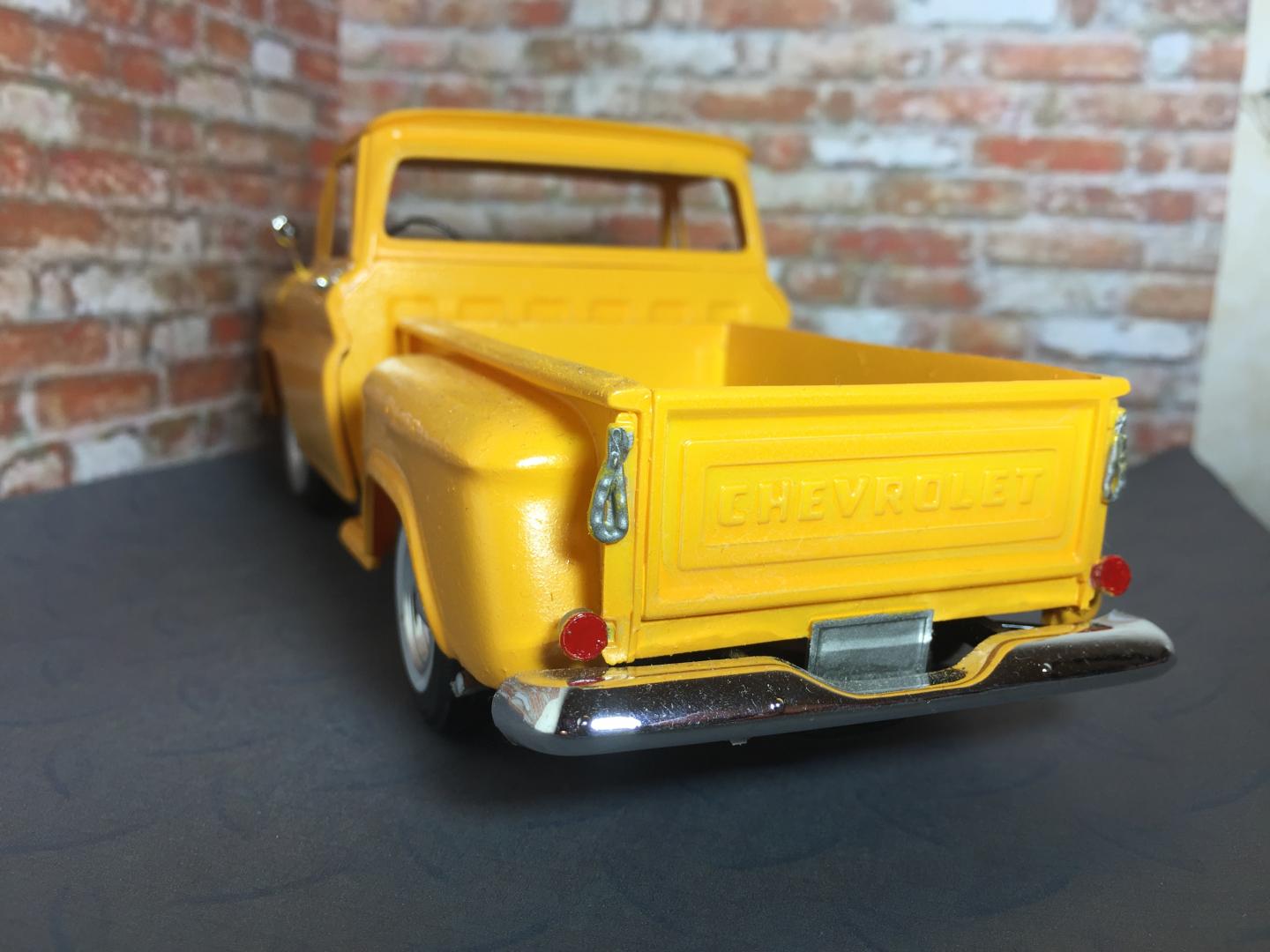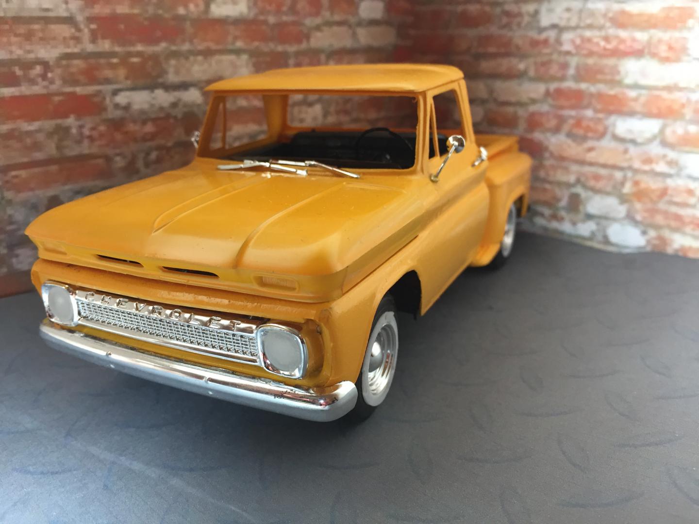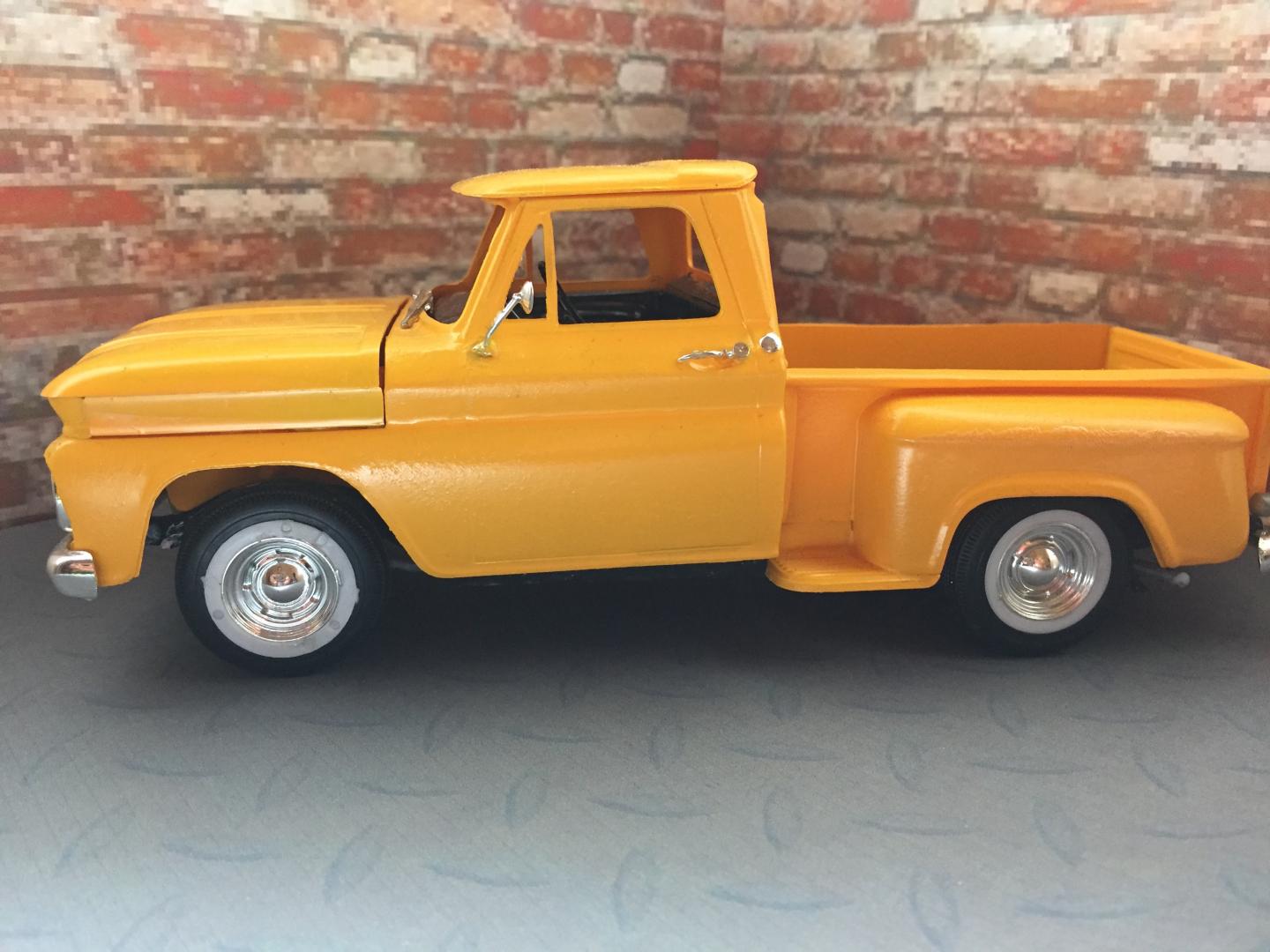 My '65 Chevy c-10 stepside. This was the second model car I ever built. I actually went back & redid a lot of the paint but as you can tell I'm sure, all of the glass is missing. Glue was smeared all over it so I thought it looked better without it. Very proud of this & I'm very happy that my builds have only gotten better as time has gone on