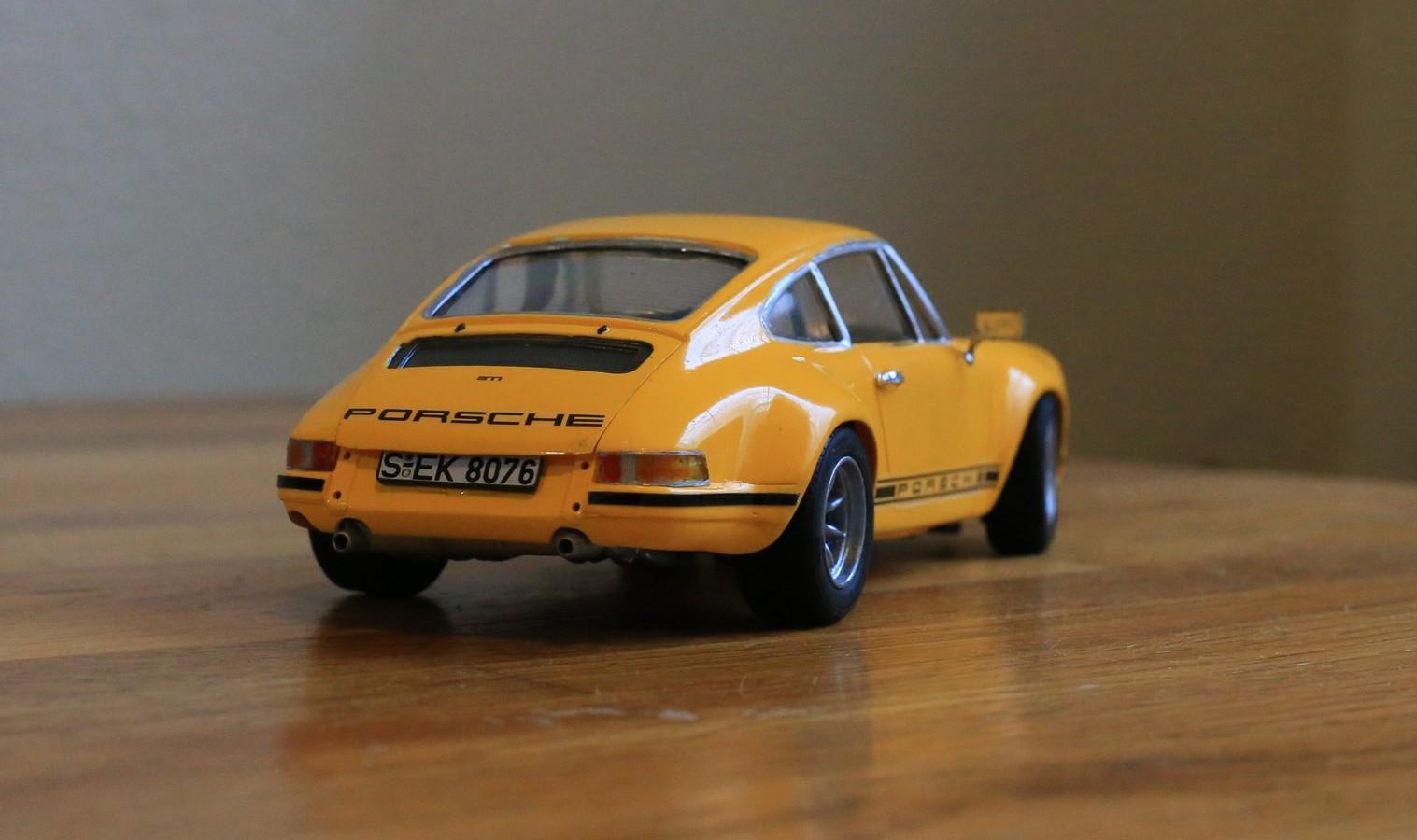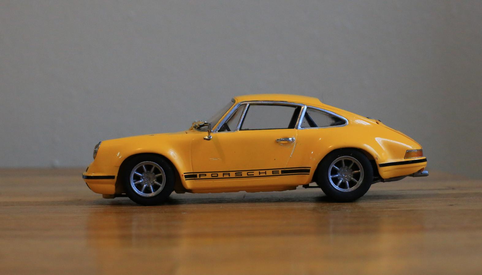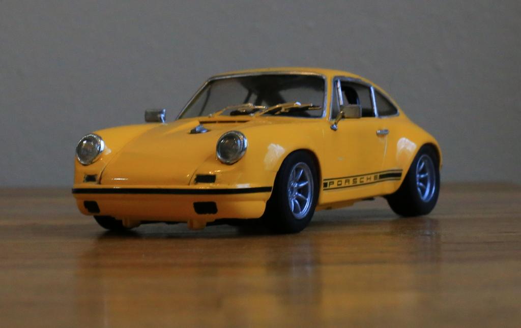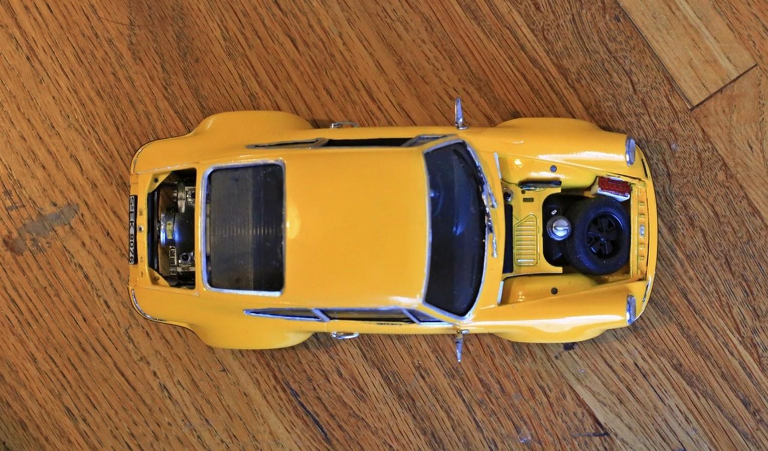 After a year of building plastic Ferrari kits I've jumped into the Fujimi 911 Enthusiast Series. The interesting thing about the series is that Fujimi could have squeezed out more road/racing versions of the 911 with little die modification, and mixing and matching of parts. So my first Fujimi 911 build is a 911 St, a kit that does not exist. The 911 ST was an options package intended for customer racing in '71 and '72, and featured flared wheel arches to accommodate a wider track. I combined the Fujimi Enthusiast Series 1967 911R bumpers, front headlights, hood, engine and interior with the Fujimi Enthusiast Series 1985 911 Turbo body and glass. The flared wheel arches on the Turbo body were tapered down to fit the smaller bumpers and where they meet the rocker panel. The chamfer was sanded from the flares, pinstriping and 911R decals added to the body, and Scale Production 15" Minilite wheels exchanged or the Fuchs wheels packaged with the kit, all to enhance authenticity. Car is painted Bright Yellow. Far from my best work and I have some touchup to finish, but the build made available what was not in kit form. Stock image of 911 ST : Kit Images